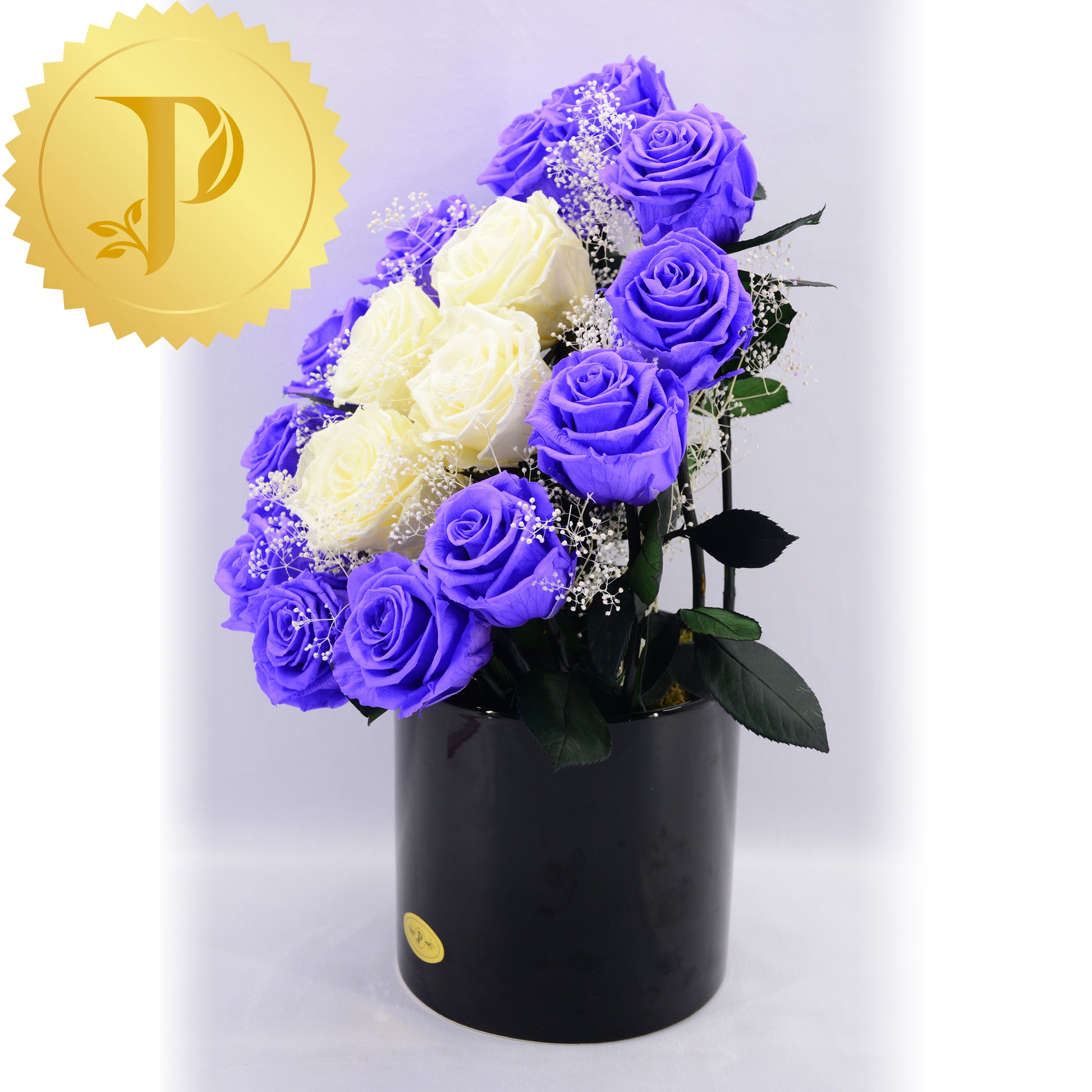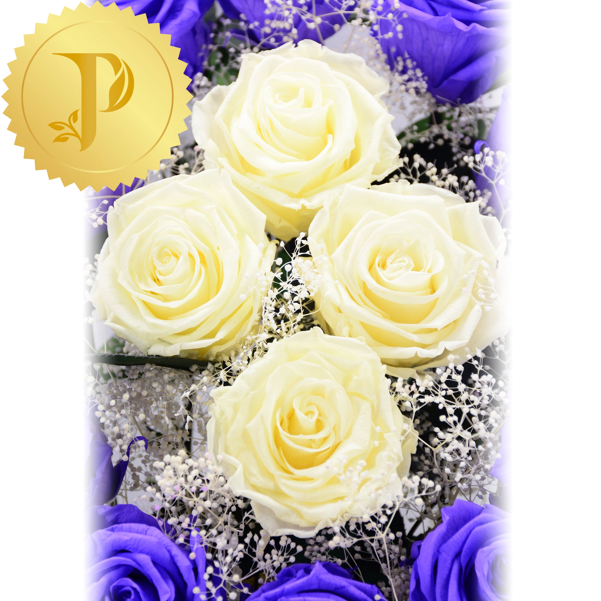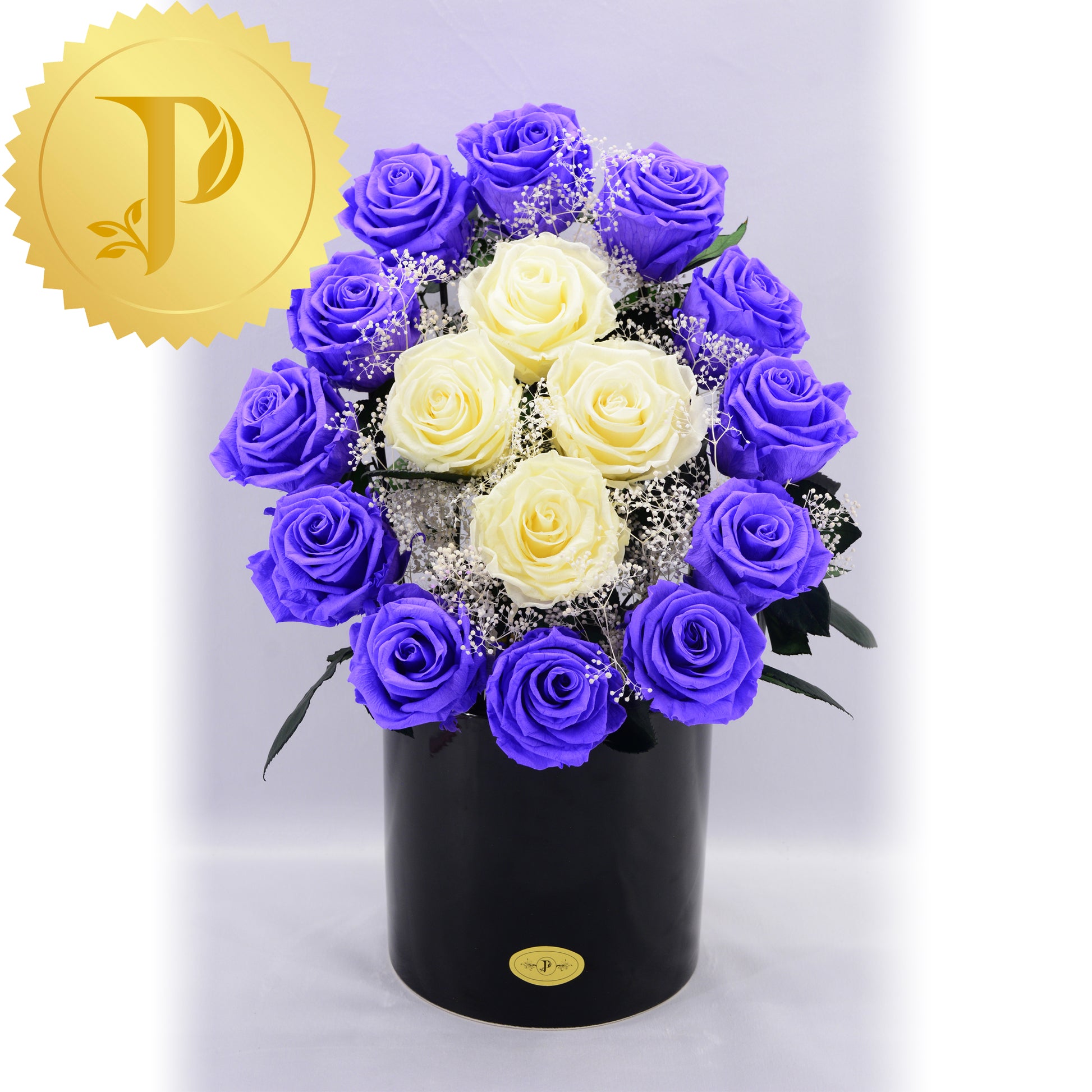Twelve bright purple roses encircle four butter-coloured roses, highlighted with white gypsophila.