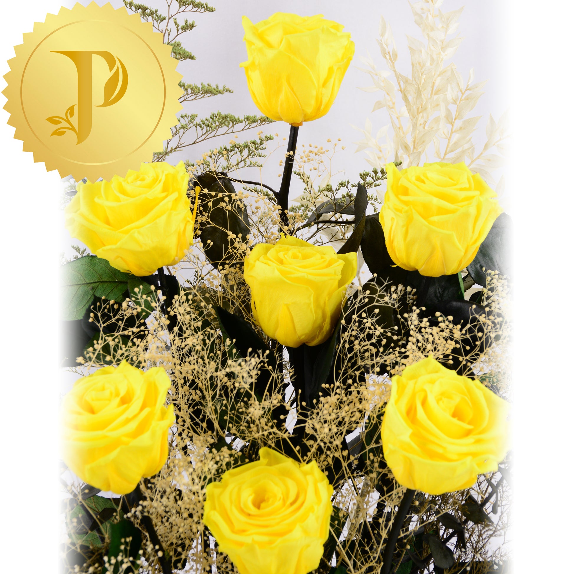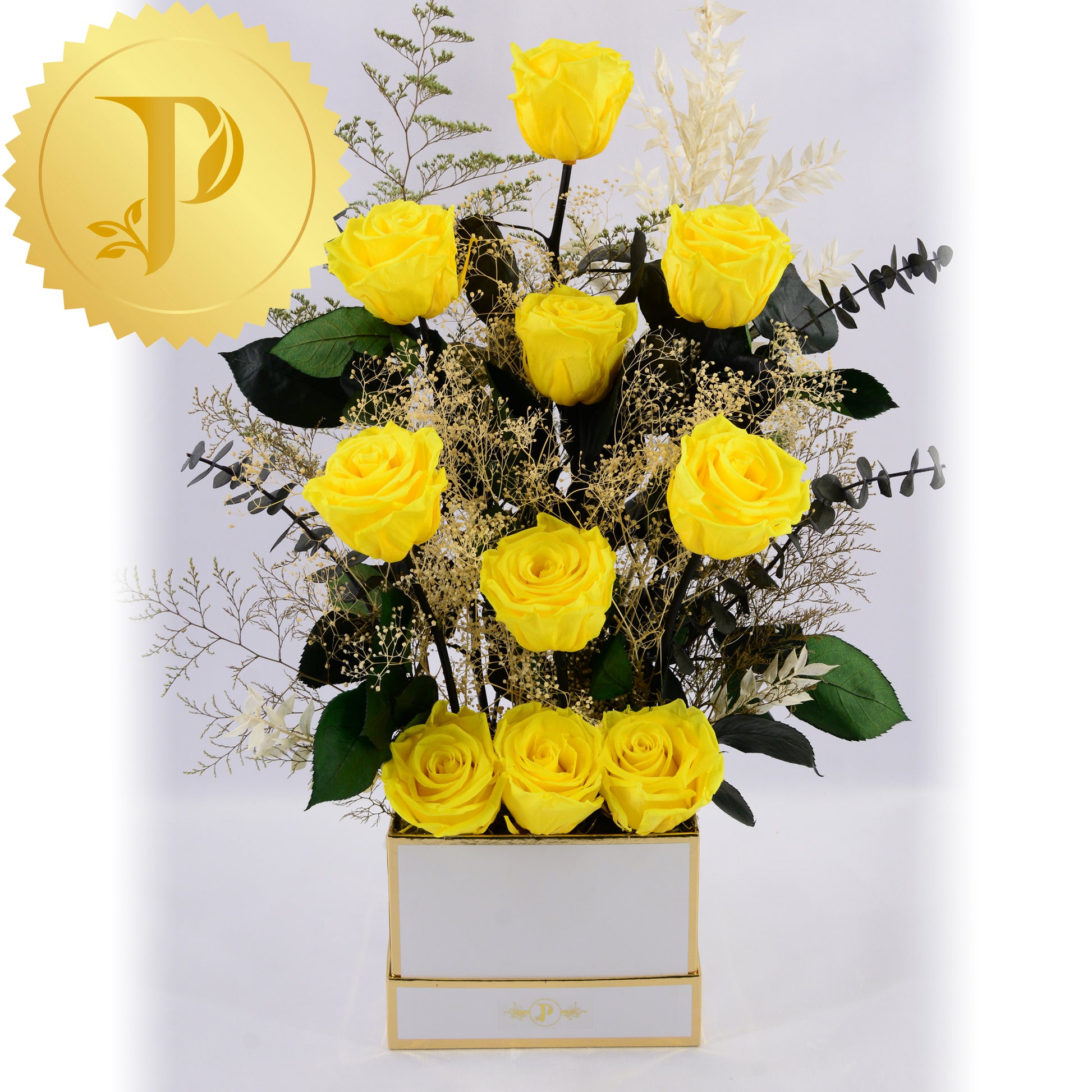 A lovely arrangement of ten bright lemon-yellow roses elegantly designed and placed in a square white gold trimmed box, with a variety of selected filler to enhance its’ beauty. An expressive tribute for a special occasion.
