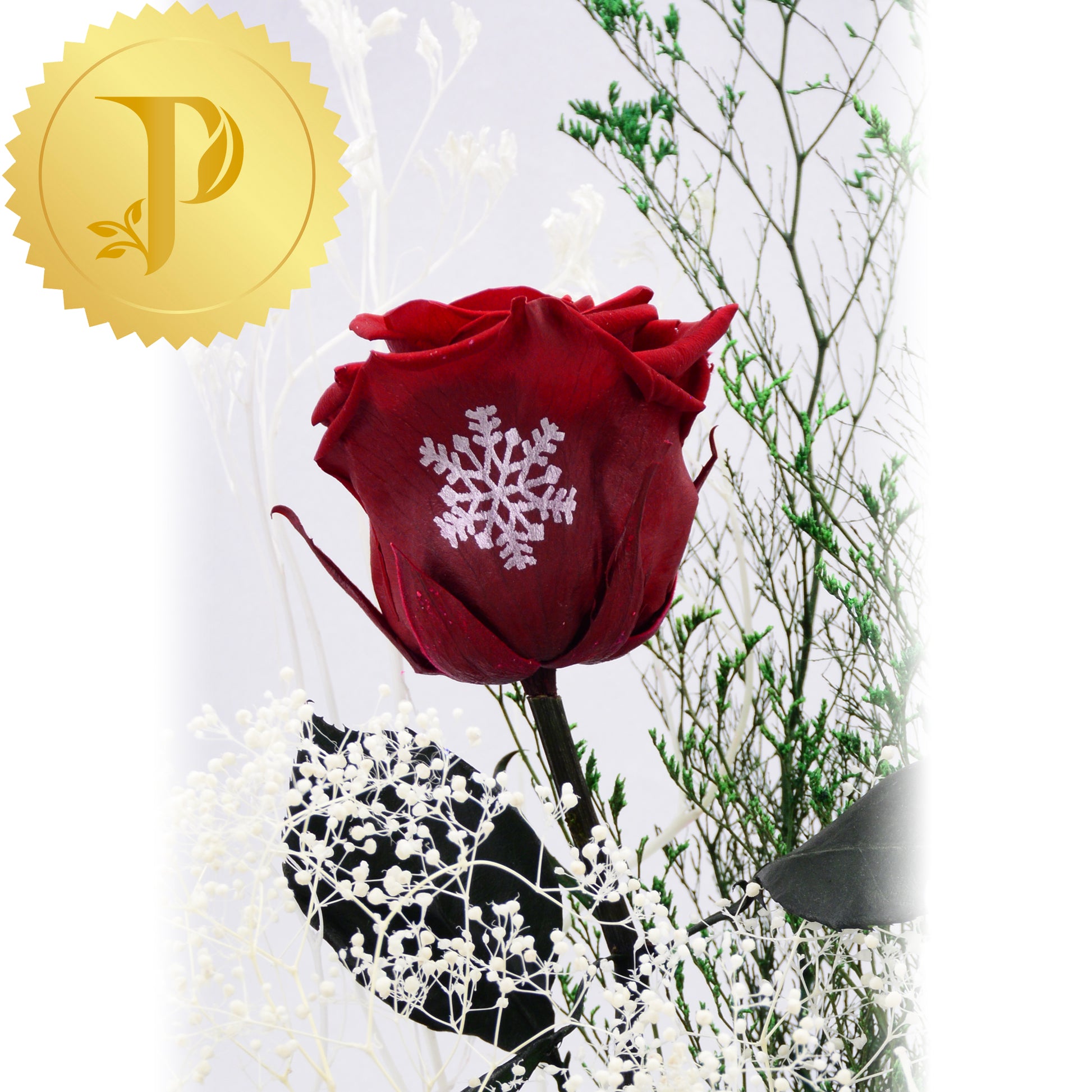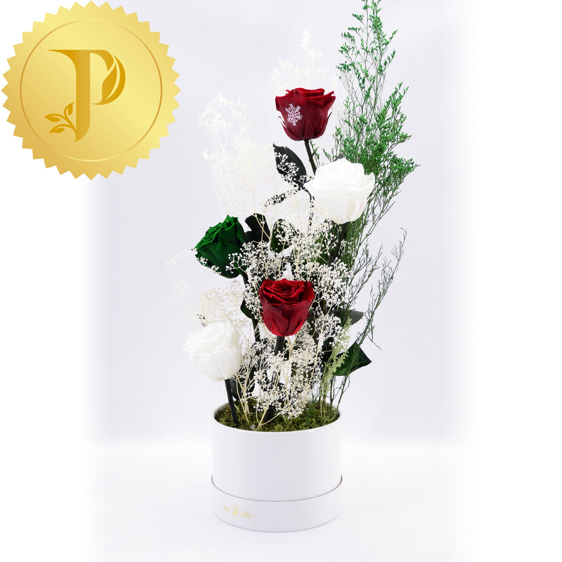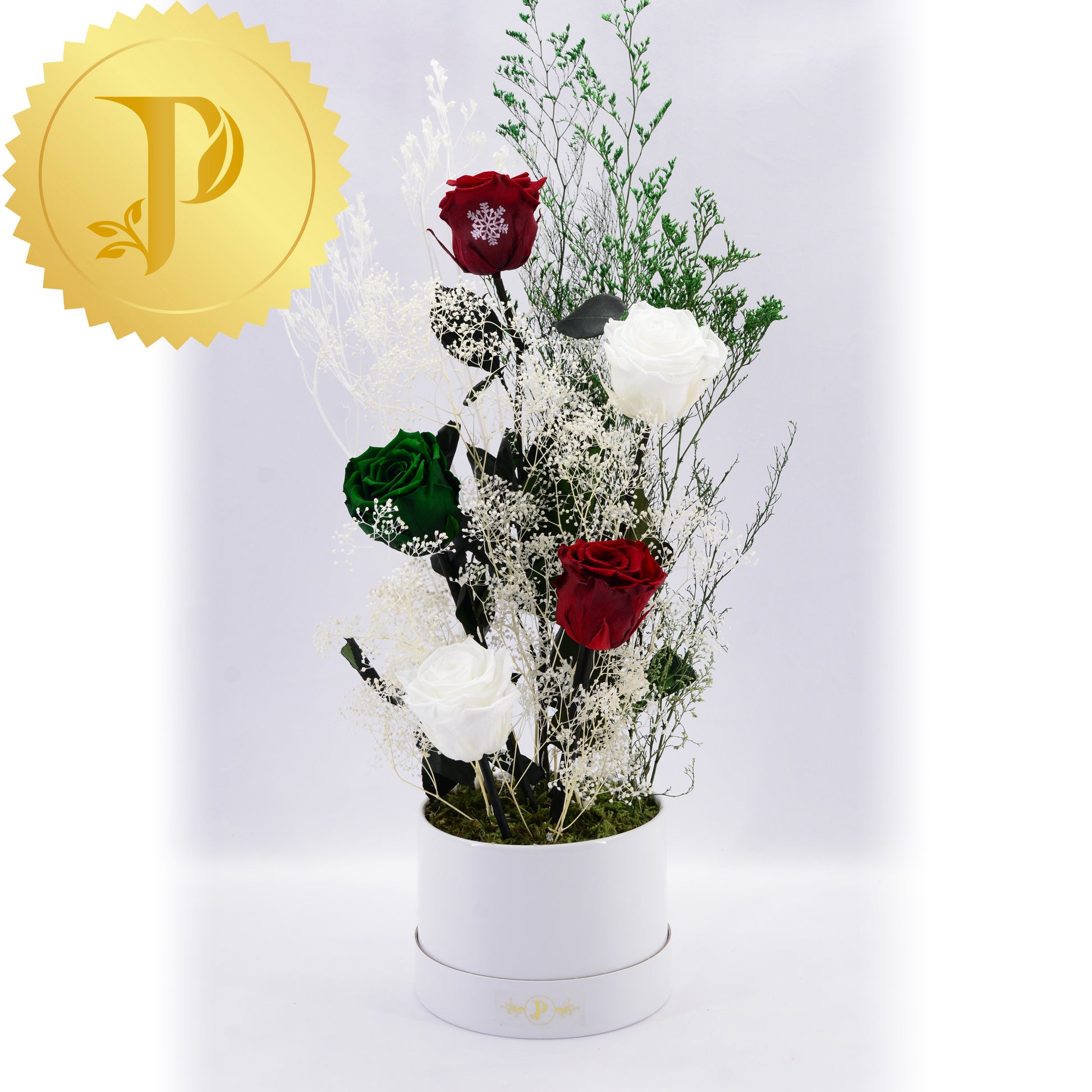 An artistic grouping of five assorted holiday-coloured roses of burgundy, white and green, accented with selected preserved filler. The arrangement is placed in a small round white box, adorned with preserved moss to give a more realistic effect.