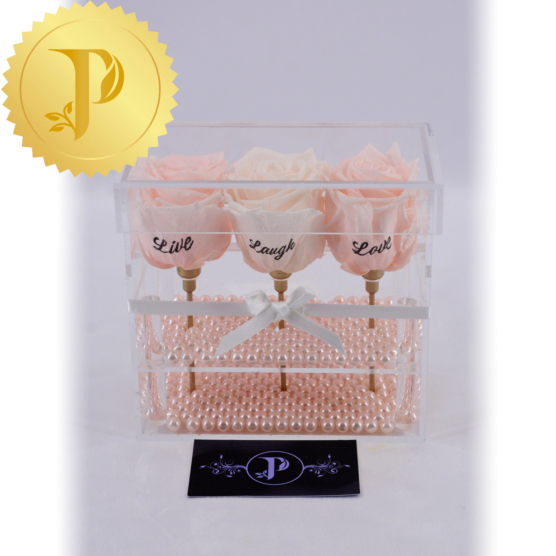 Arrangements in acrylic are available either with a drawer or tall with stems and no drawer. All arrangements come with a layer of your choice of either matching faux pearls, natural stones (lapis lazuli), crystals (clear and rose quartz) or crushed glass (gold). The drawers can be filled with either Ferrero Rocher or Baci chocolates. Acrylic boxes will be highlighted with a white ribbon.