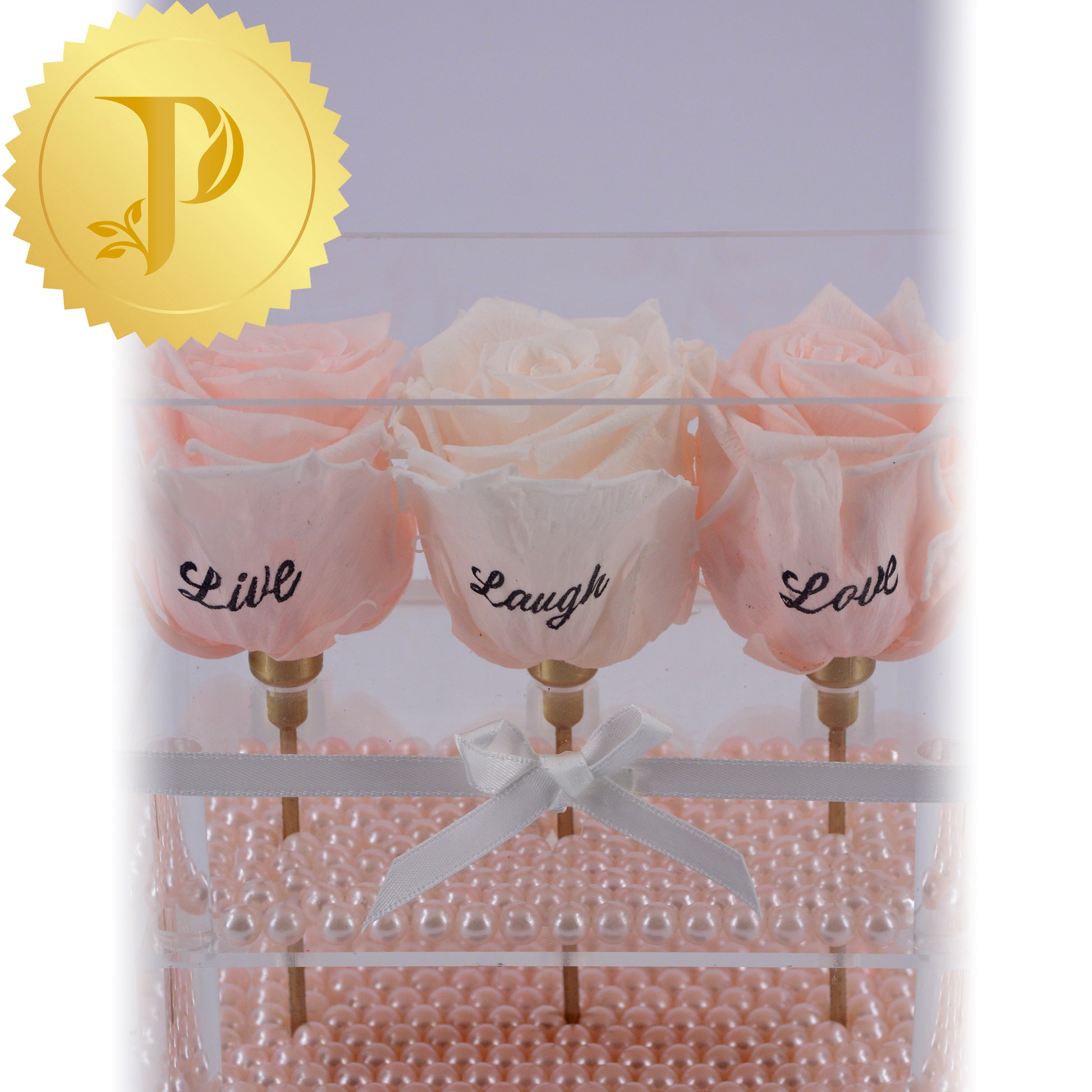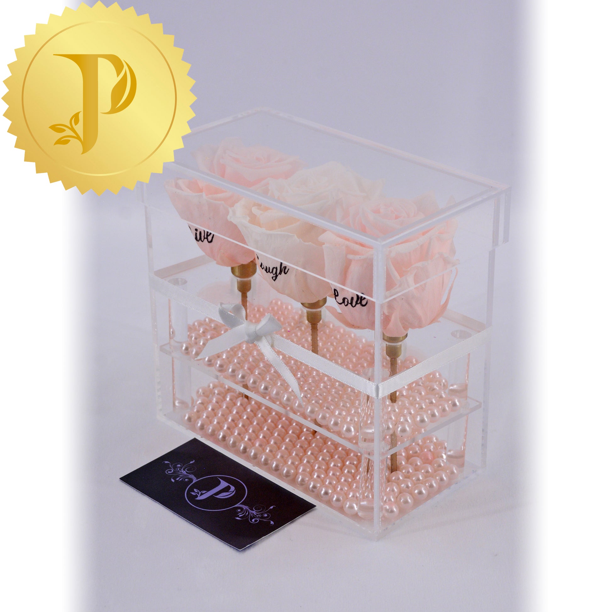 This rose trio in acrylic with light pink roses are complemented by a layer of rose quartz and a drawer filled with Ferrero Rocher chocolates. Rose quartz is a healing crystal known for promoting love and friendship.