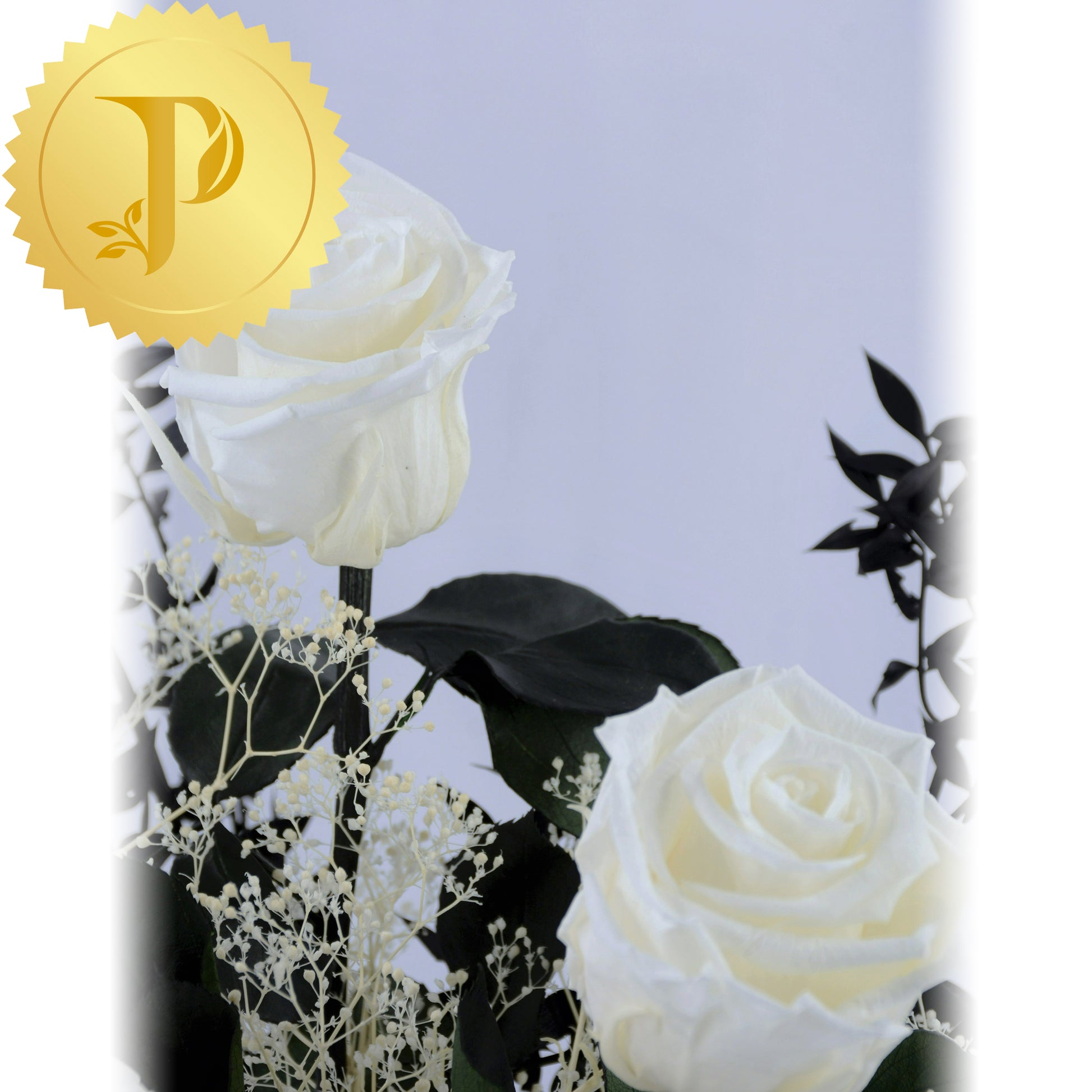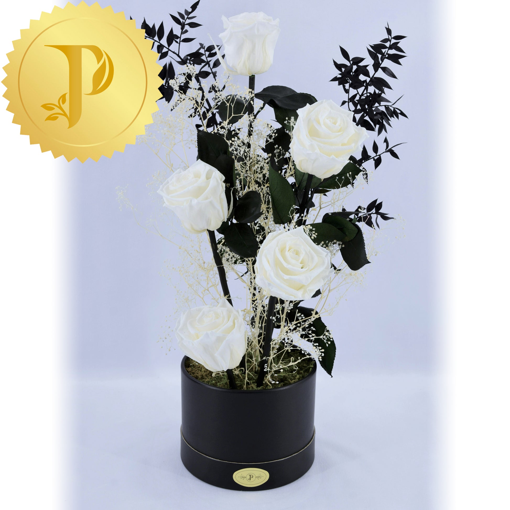 An artistic grouping of five bright white roses accented with selected preserved filler. The arrangement is placed in a small round black box, adorned with preserved moss to give a more realistic effect.