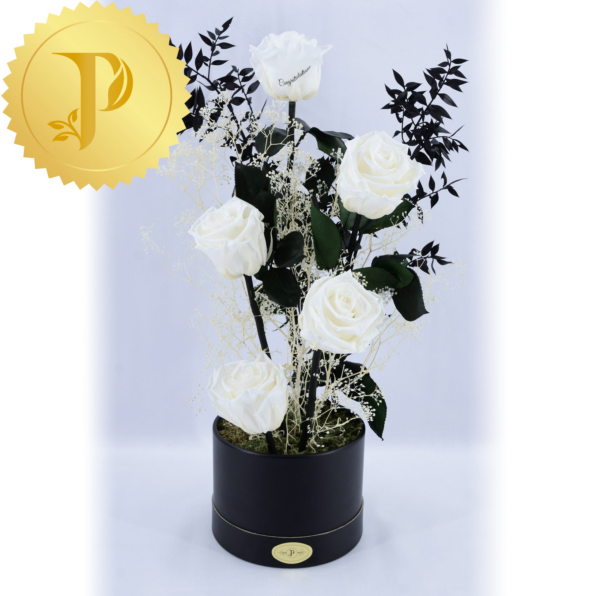 An artistic grouping of five bright white roses accented with selected preserved filler. The arrangement is placed in a small round black box, adorned with preserved moss to give a more realistic effect.