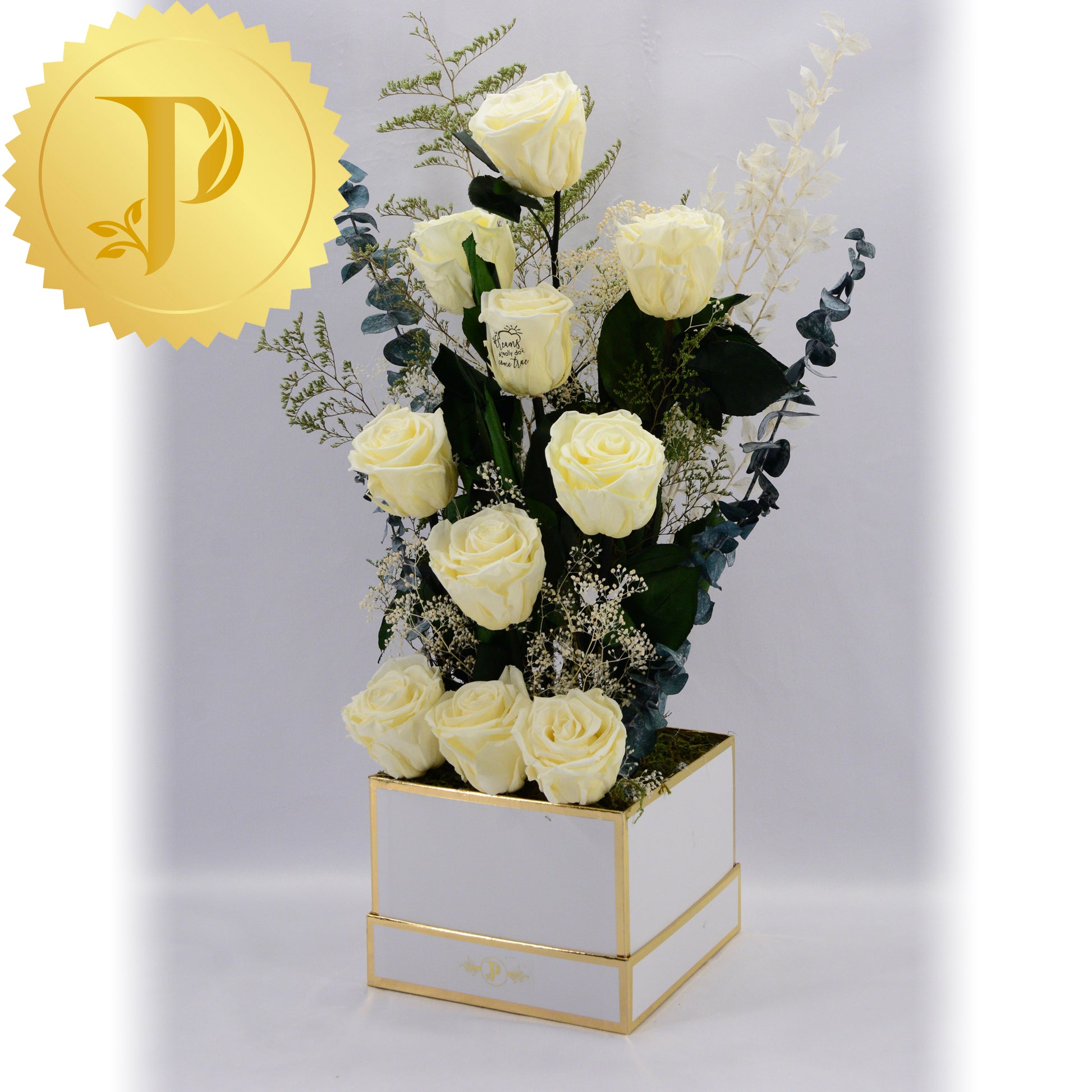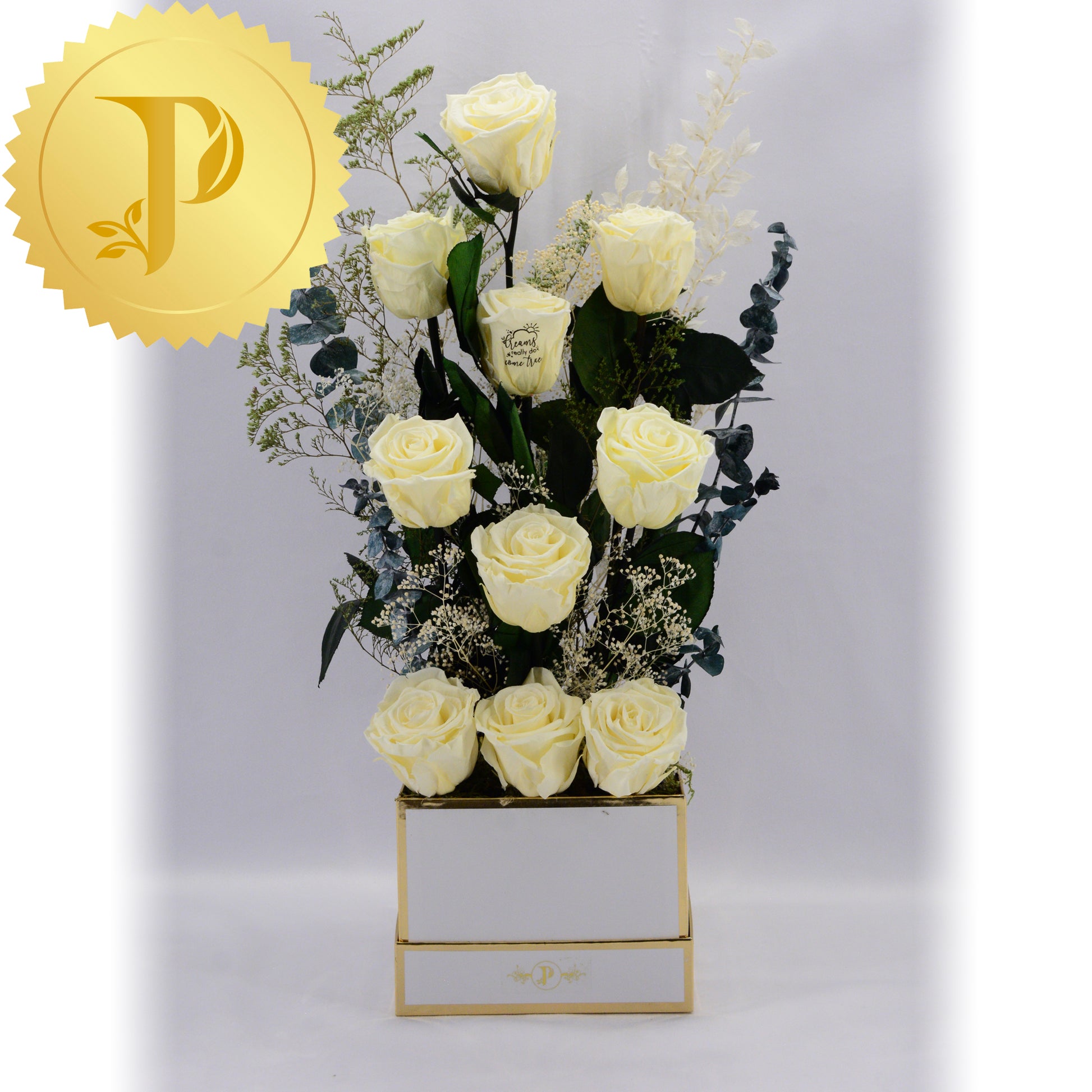 A lovely arrangement of ten butter yellow roses elegantly designed and placed in a square white gold trimmed box, with a variety of selected filler to enhance its’ beauty. An expressive tribute for a special occasion that will complement any décor at home or at the workplace.