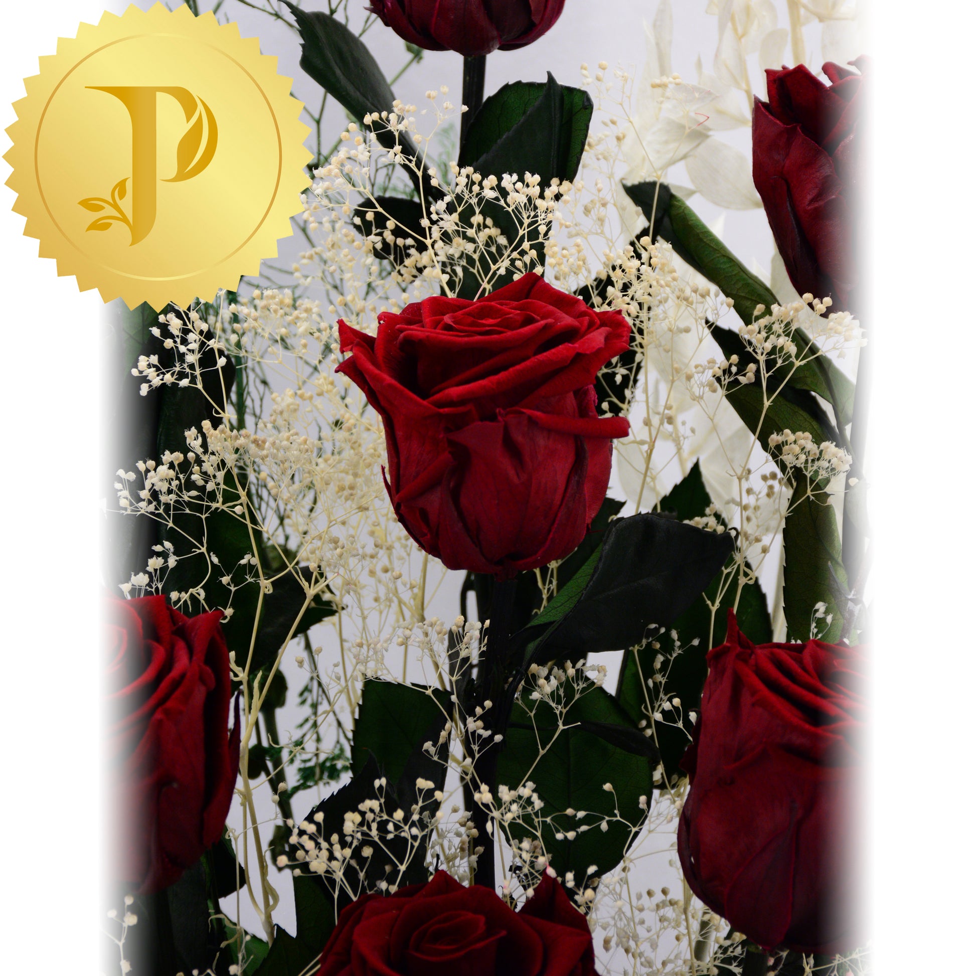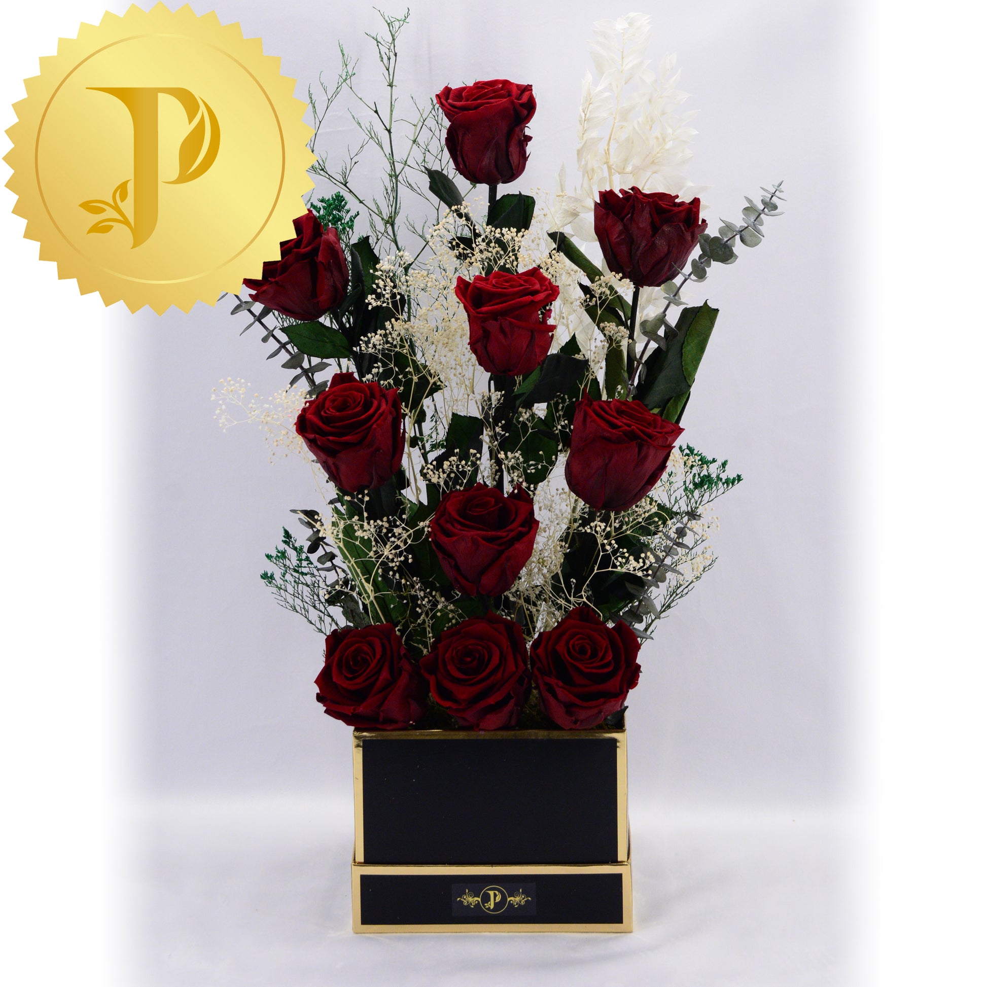 A lovely arrangement of ten deep burgundy roses elegantly designed and placed in a square black gold trimmed box, with a variety of selected filler to enhance its’ beauty. An expressive tribute for a special occasion.