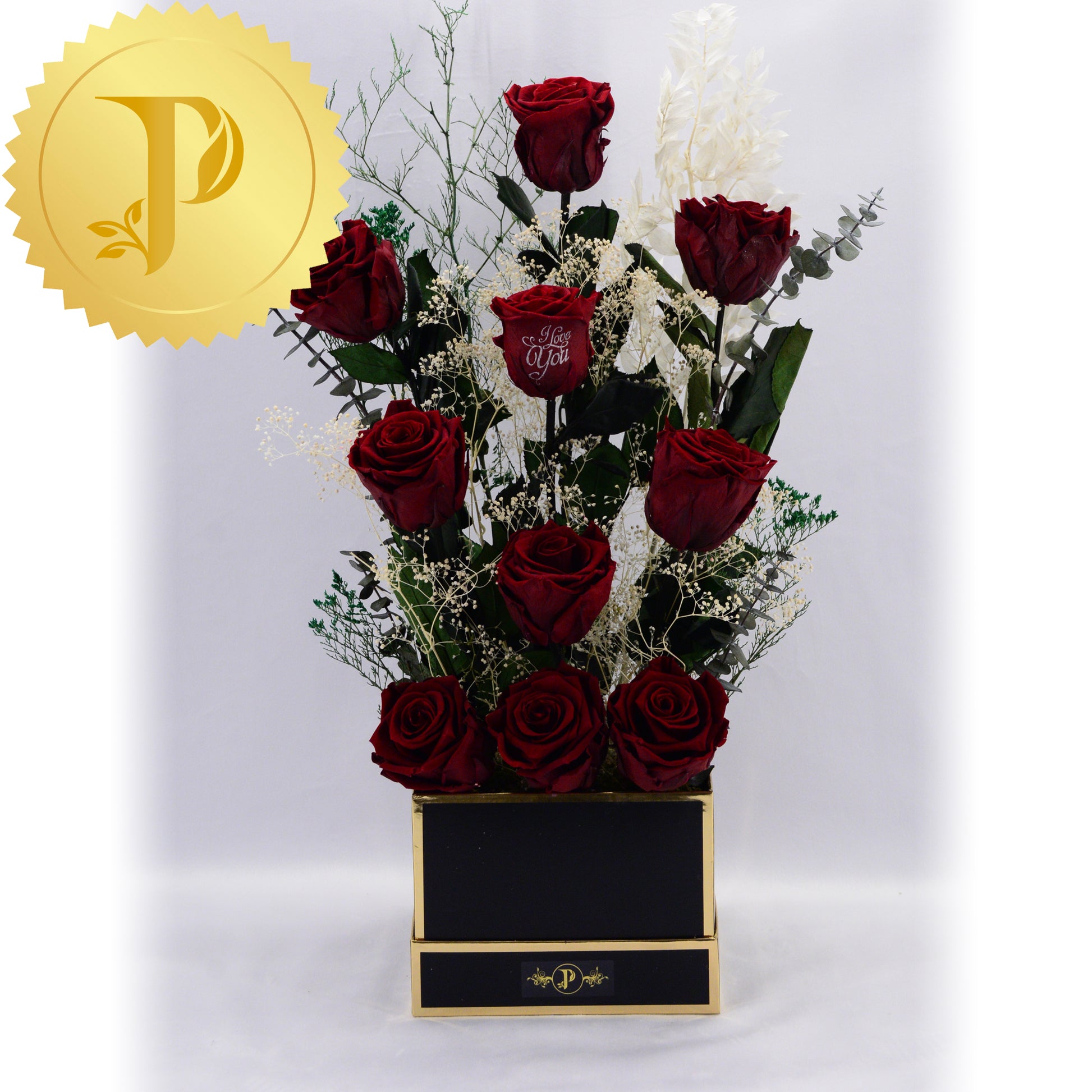 A lovely arrangement of ten deep burgundy roses elegantly designed and placed in a square black gold trimmed box, with a variety of selected filler to enhance its’ beauty. An expressive tribute for a special occasion that will complement any décor at home or at the workplace.