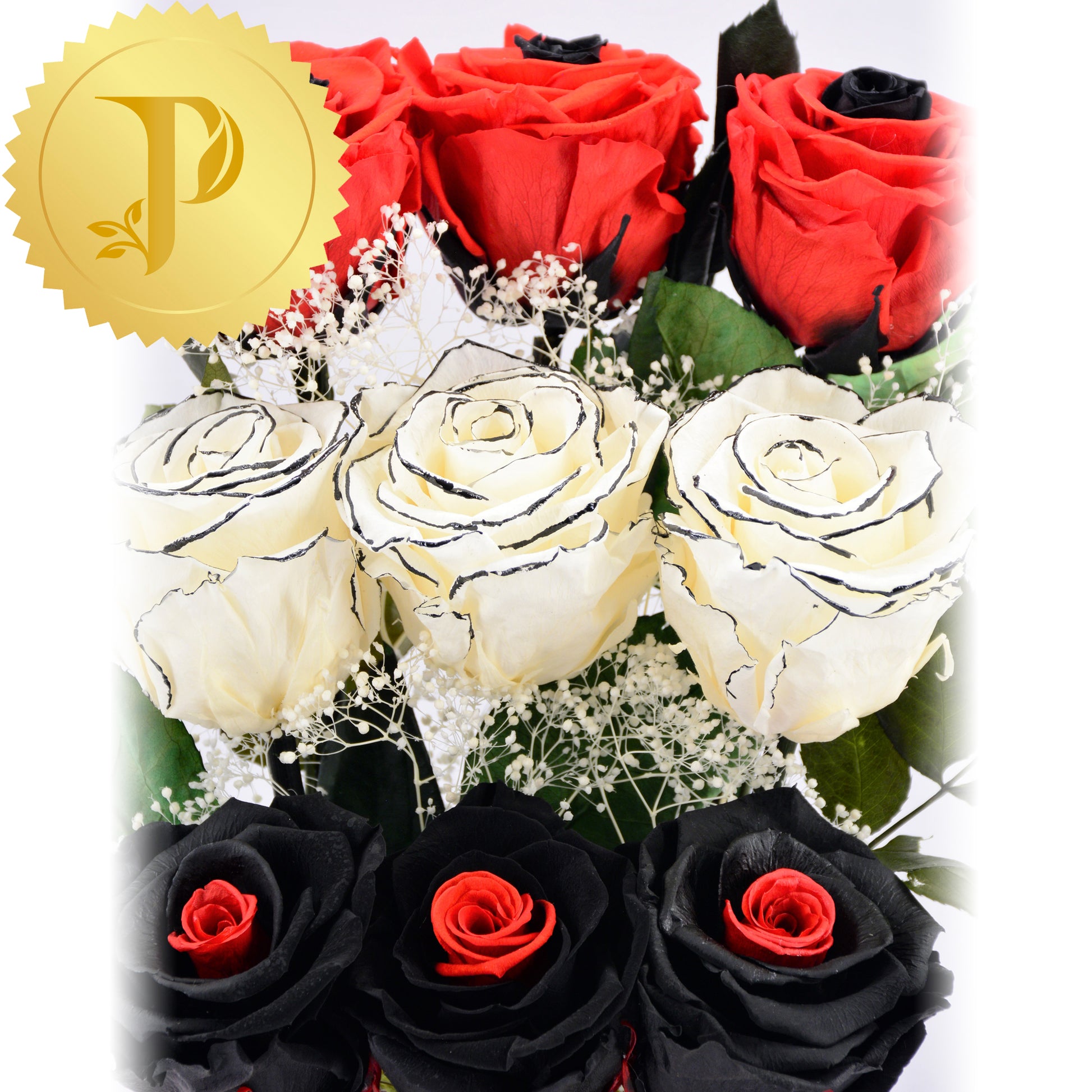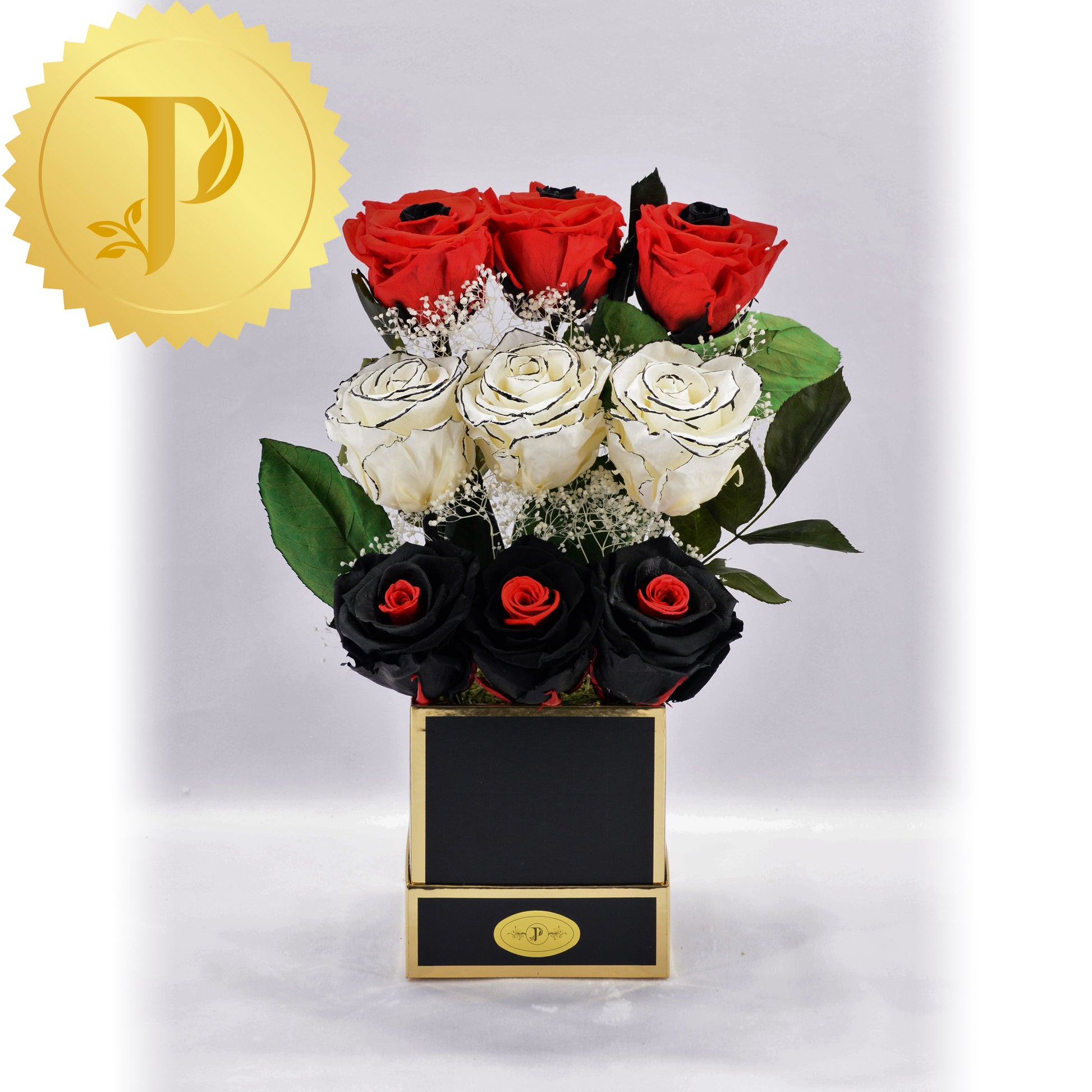 Our modern take on red, black and white roses has a striking and dramatic look. This tiered arrangement will add a concert of colour to any room.