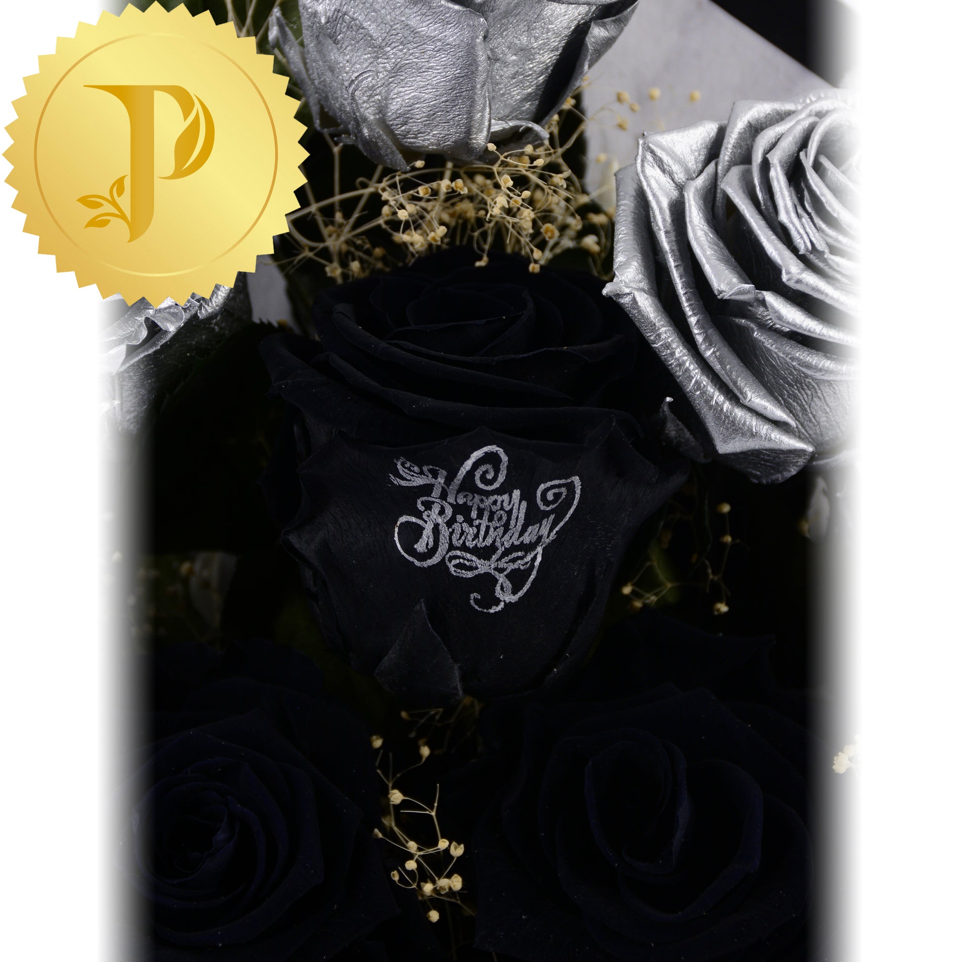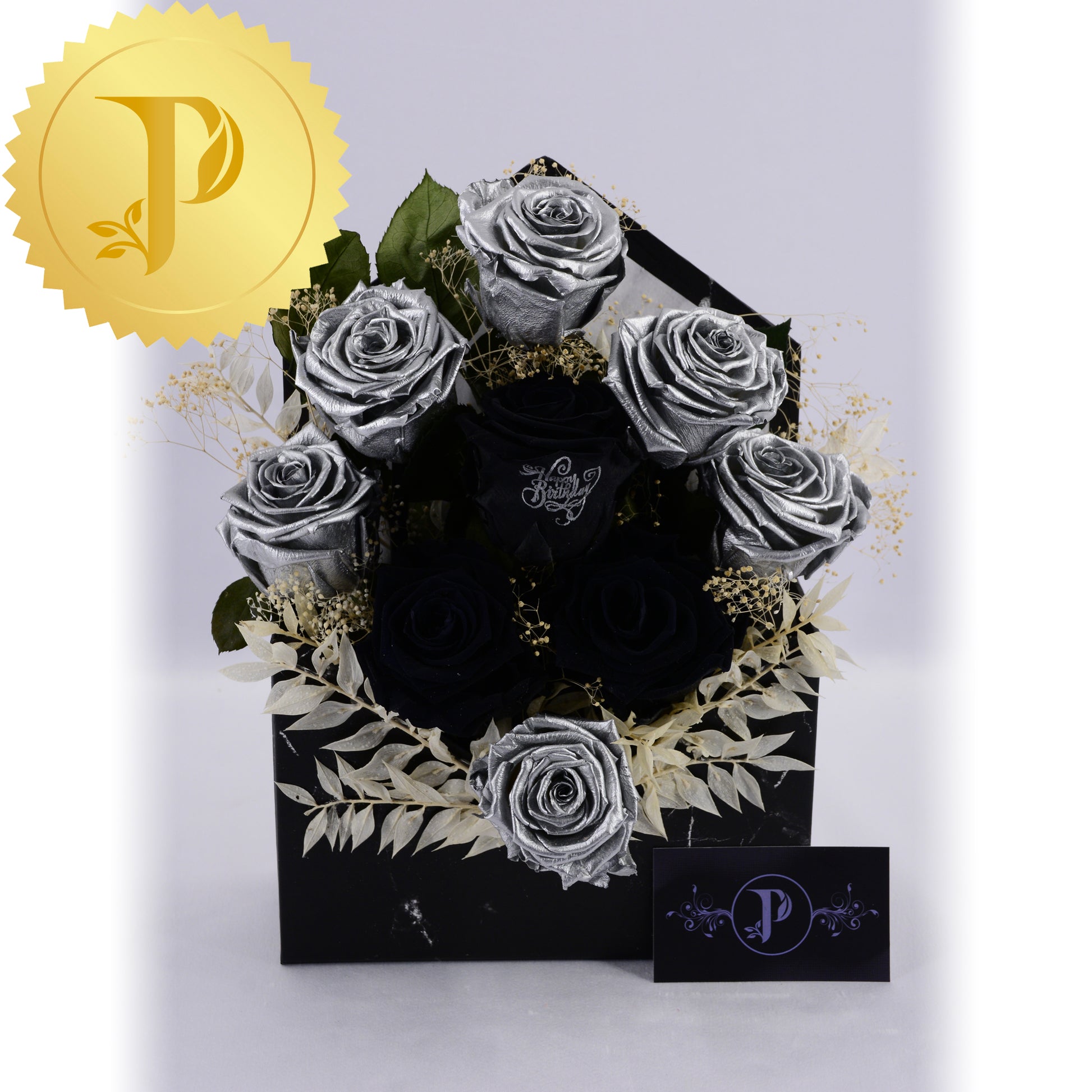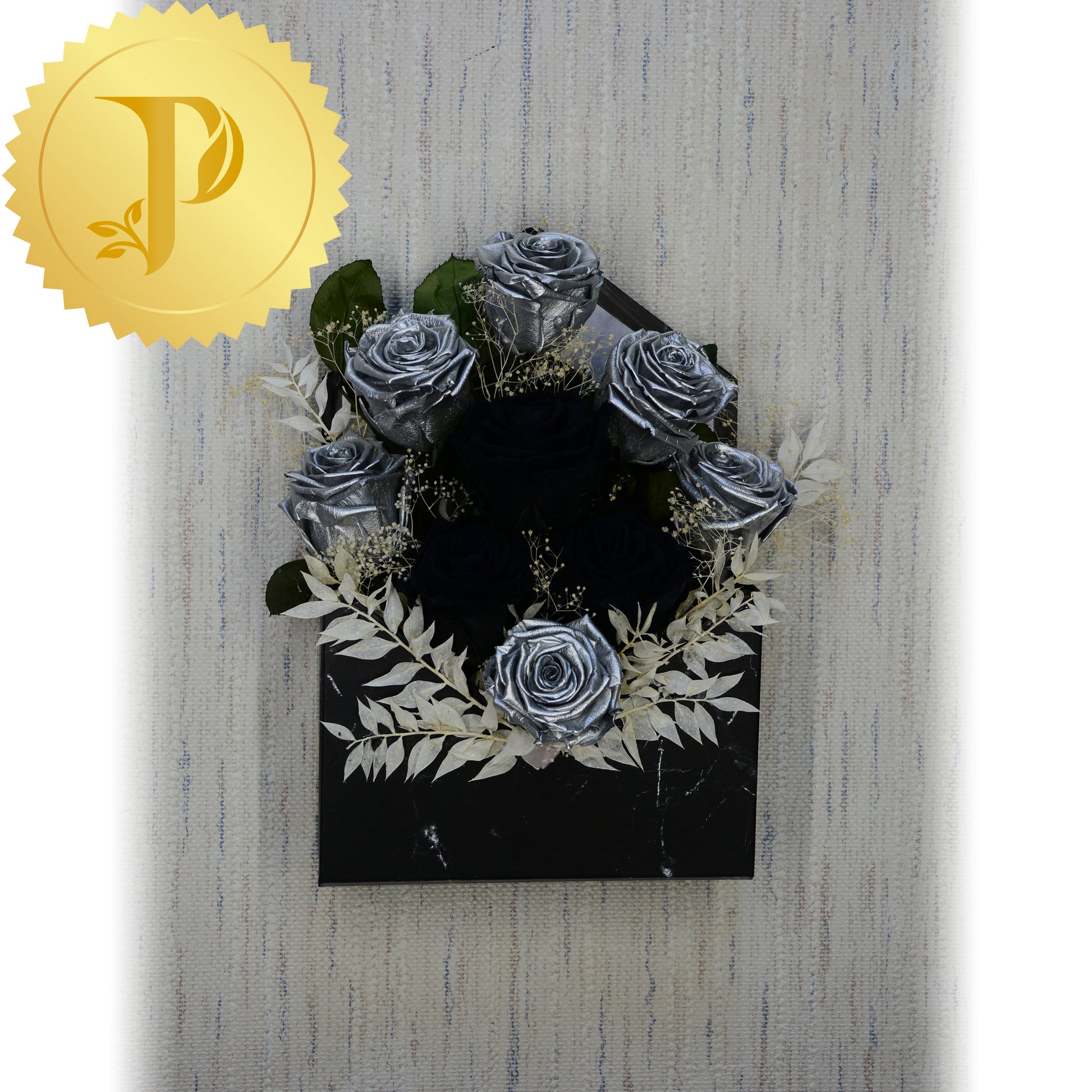Convey a sweet message of love and friendship with this cute, marbleized envelope design. A combination of nine black and silver coloured roses will enhance any room. This delightful arrangement is also suitable for hanging (picture hanger included).