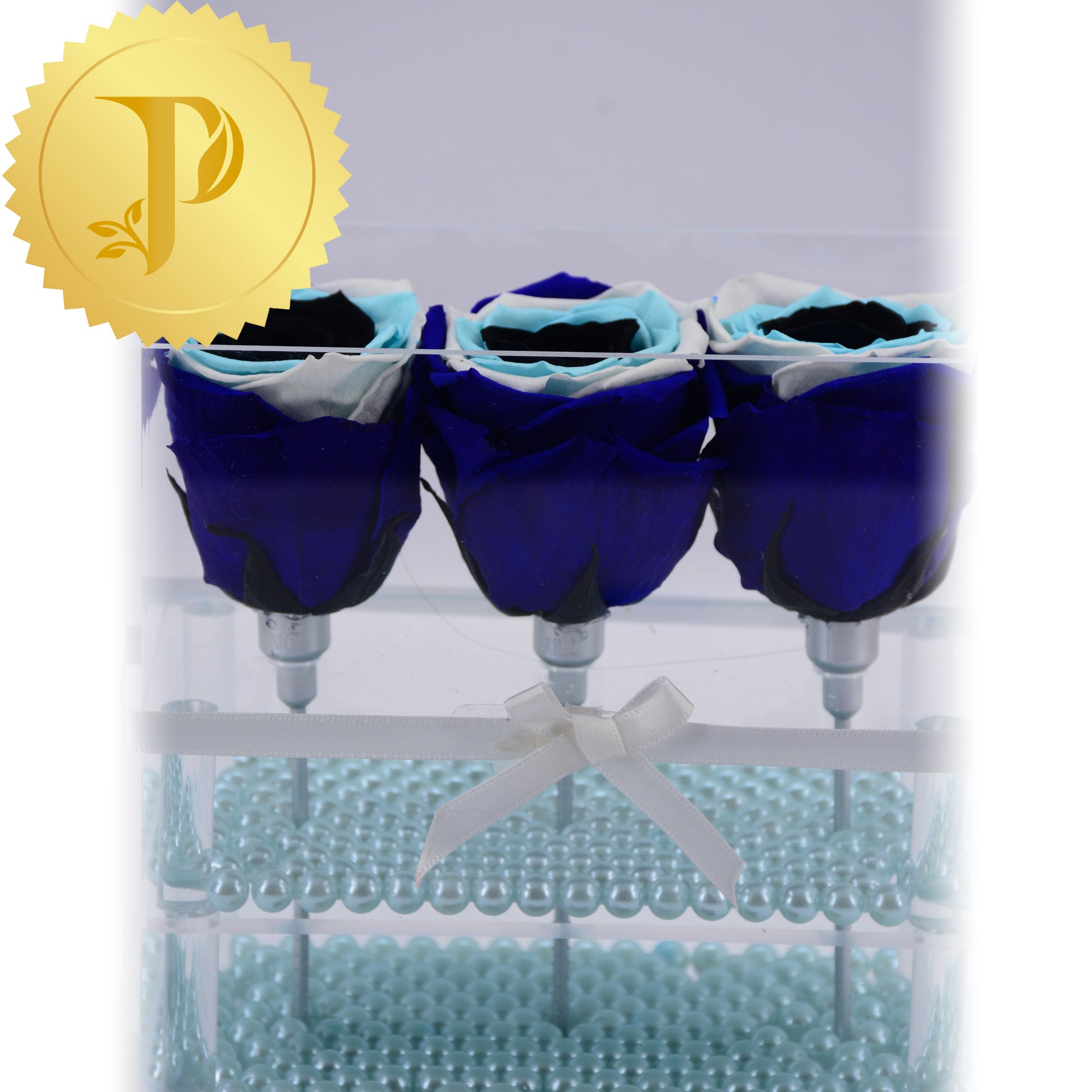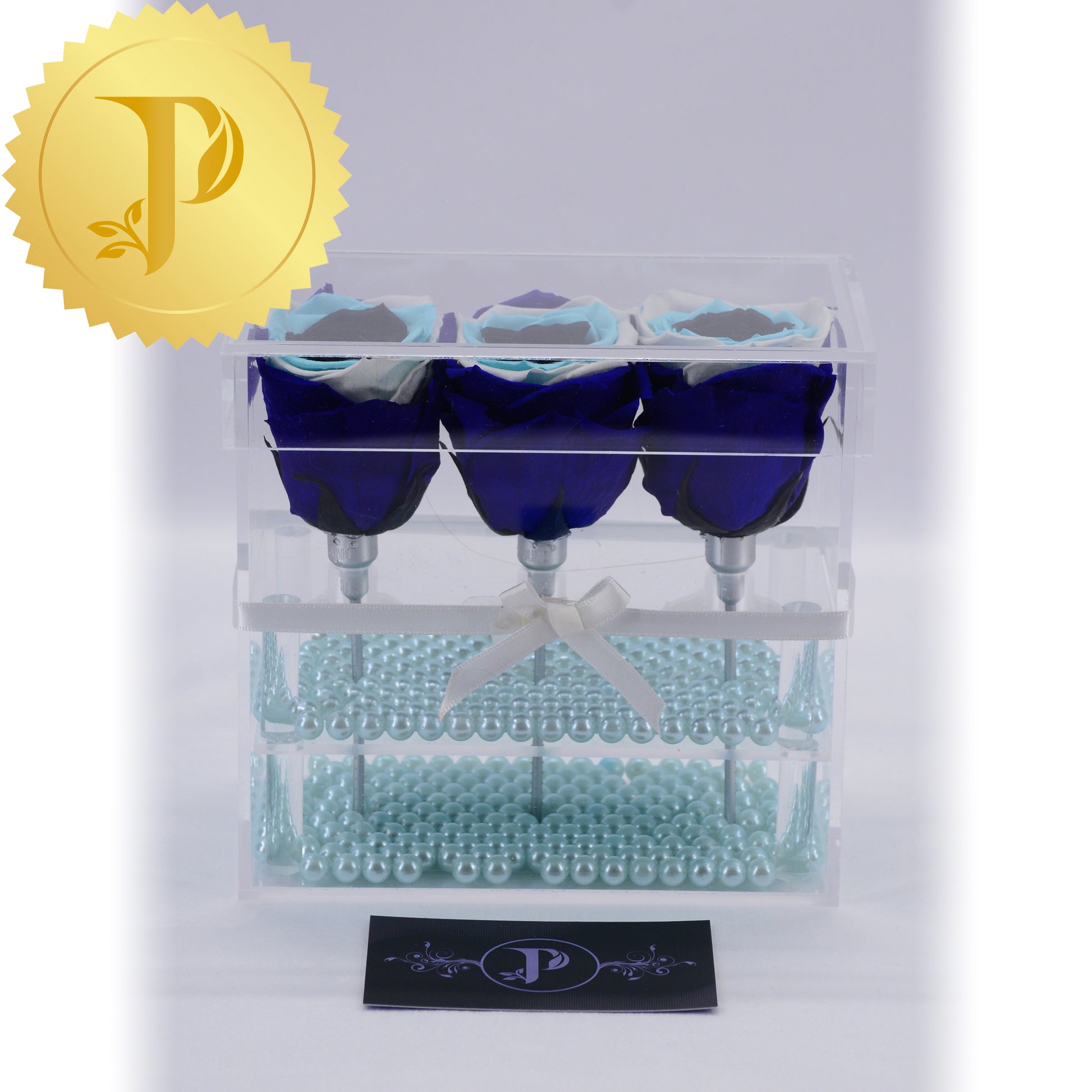 Arrangements in acrylic are available either with a drawer or tall with stems and no drawer. All arrangements come with a layer of your choice of either matching faux pearls, natural stones (lapis lazuli), crystals (clear and rose quartz) or crushed glass (gold). The drawers can be filled with either Ferrero Rocher or Baci chocolates. Acrylic boxes will be highlighted with a white ribbon.