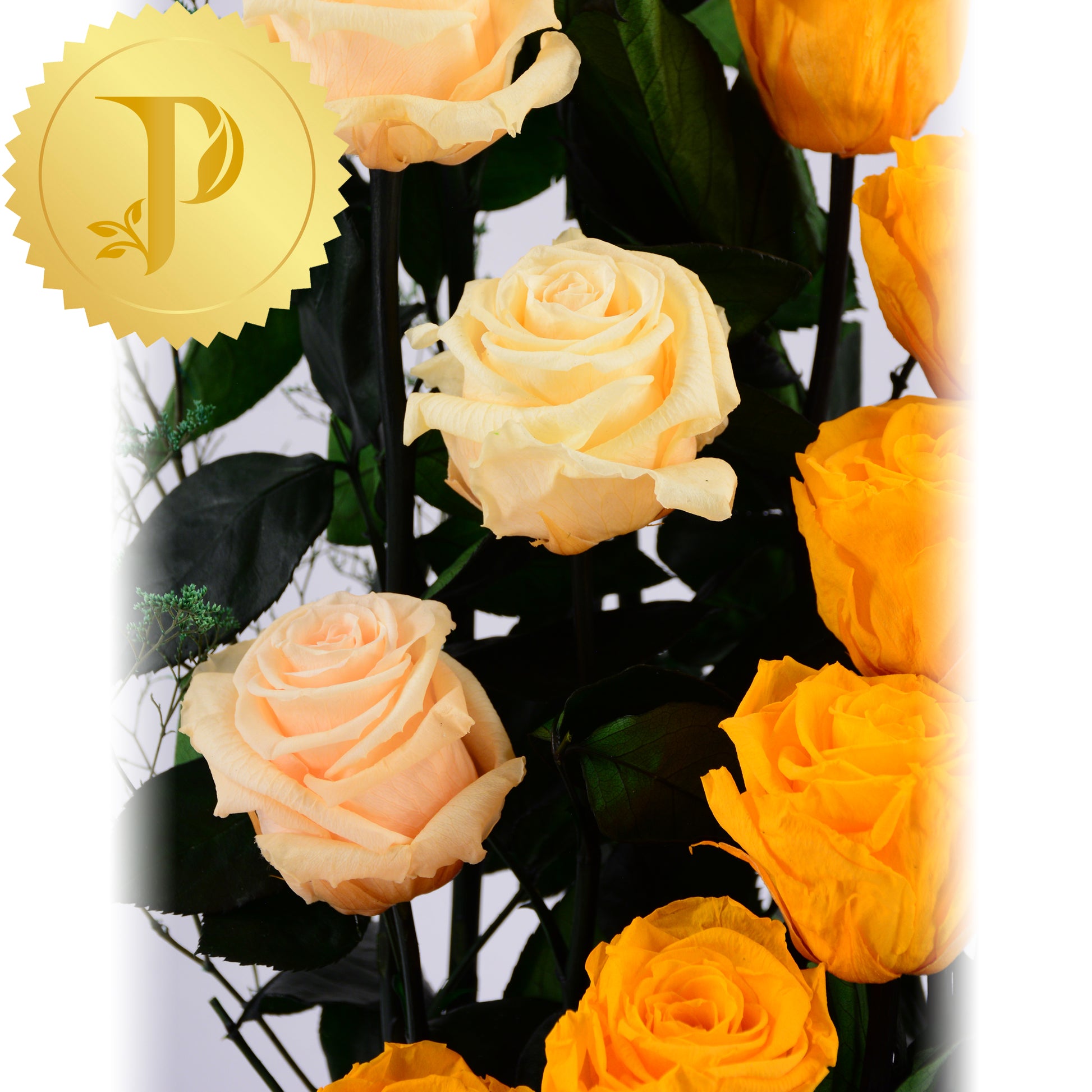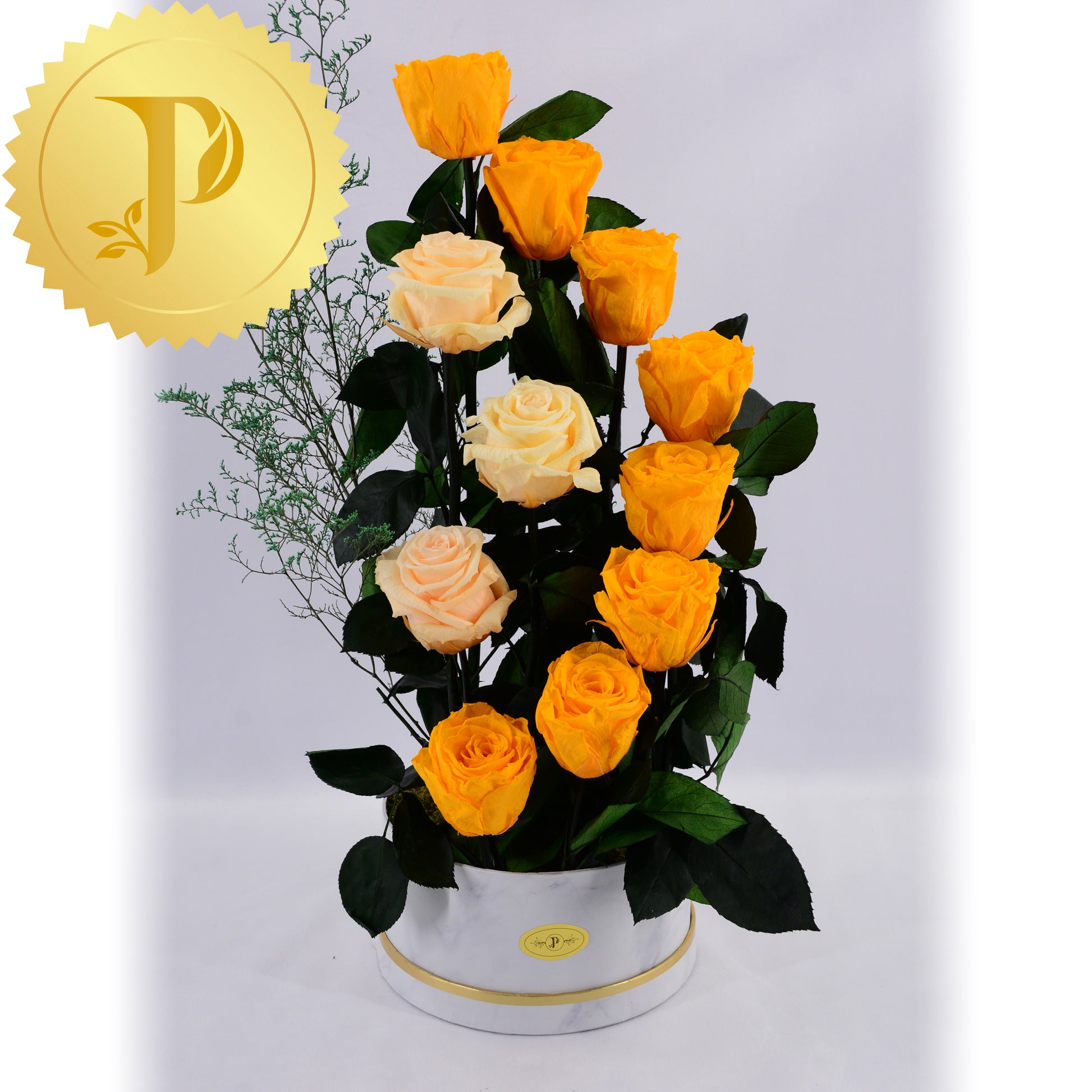 Sunshine and warmth are radiated in this graceful curl formed by the colour combination of eight orange and three peach roses nesting inside. The elegance of this arrangement is enhanced with our white marble patterned container.