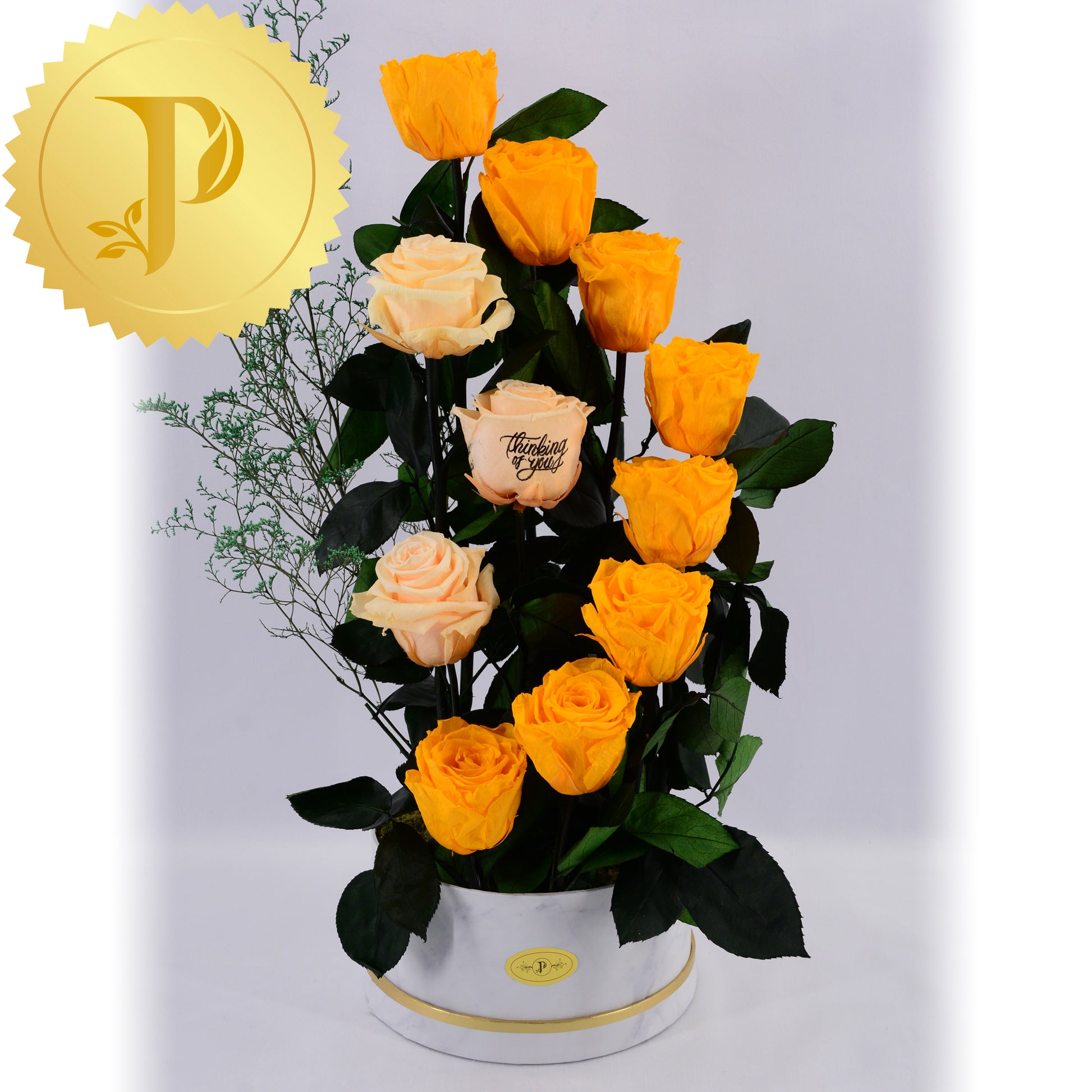 Sunshine and warmth are radiated in this graceful curl formed by the colour combination of eight orange and three peach roses nesting inside. The elegance of this arrangement is enhanced with our white, marble patterned container. Its artistic nature draws the attention of any audience and for any occasion.