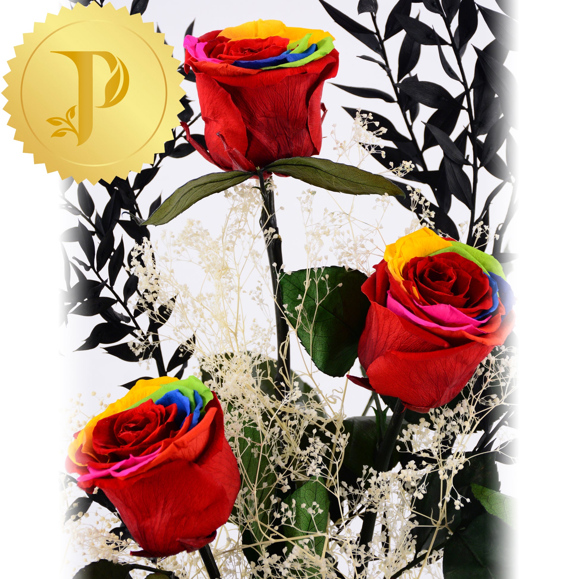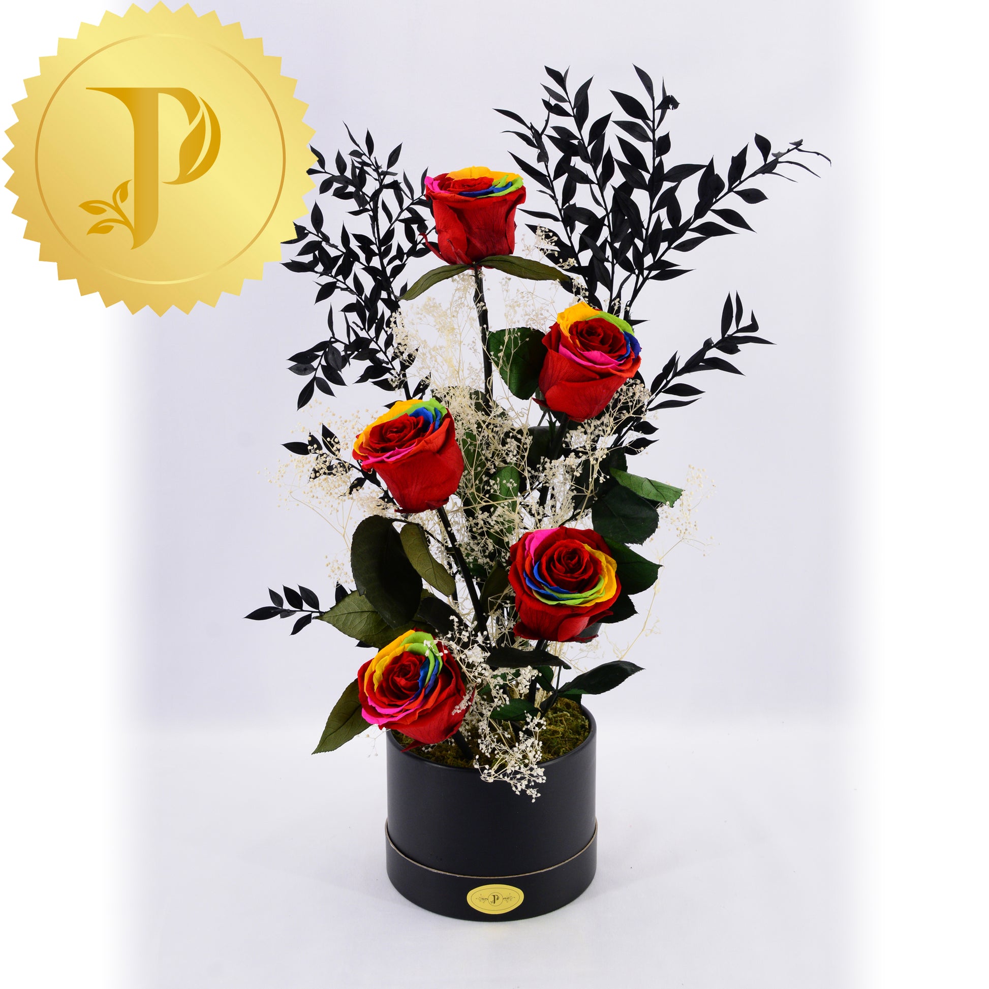 An artistic grouping of five technicoloured roses accented with selective preserved filler. The arrangement is placed in a small round black box, adorned with preserved moss to give a more realistic effect.