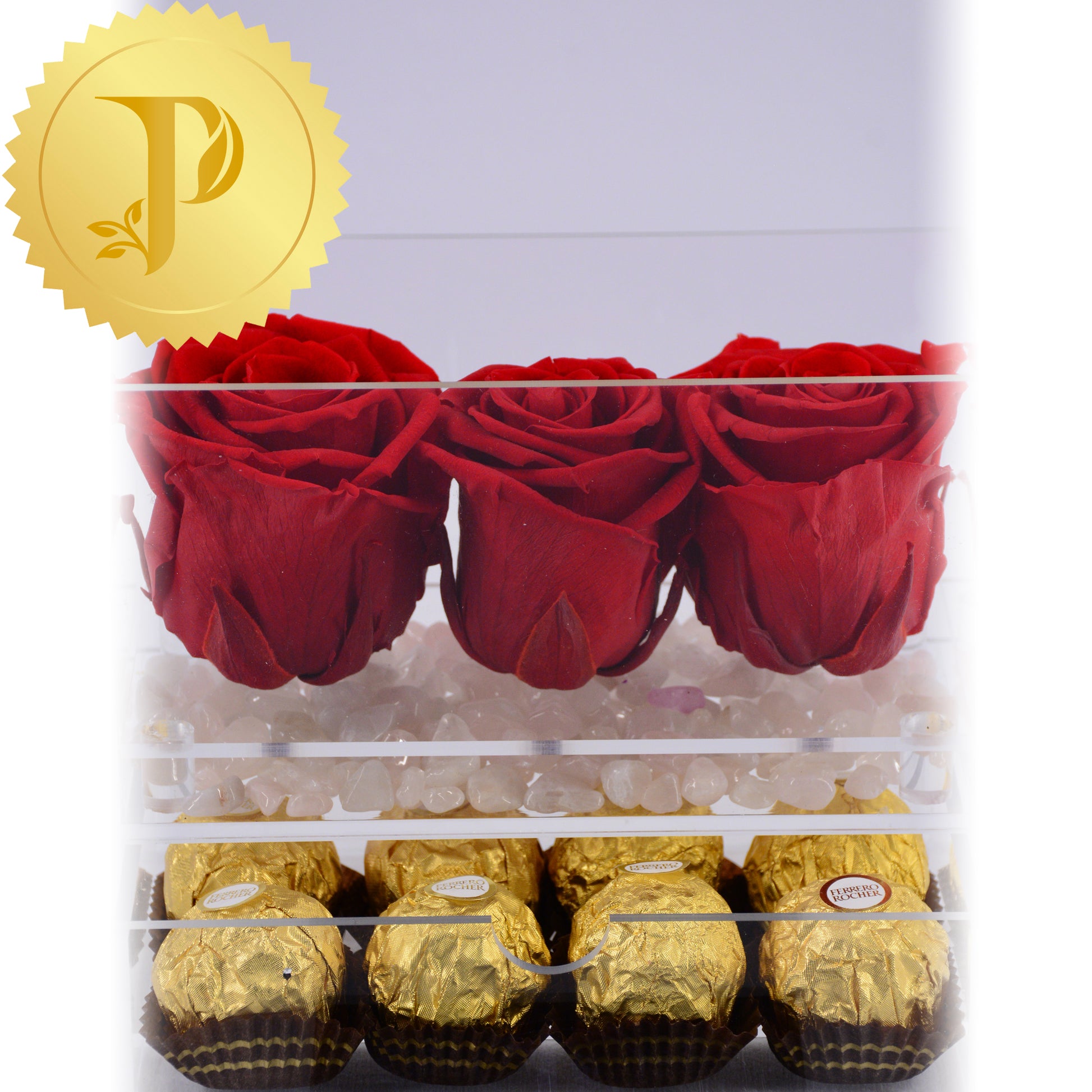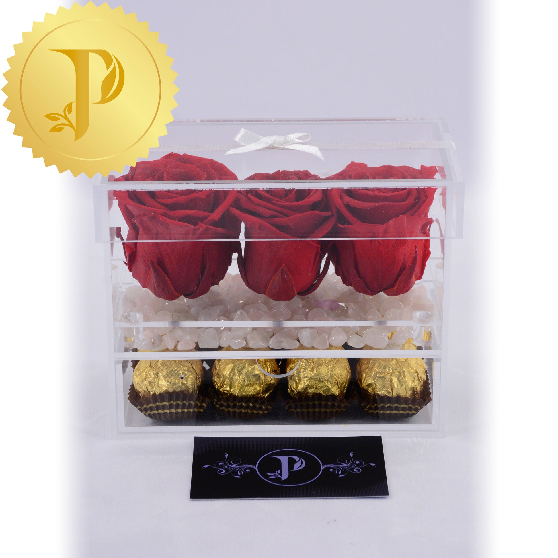 This rose trio in acrylic with red roses are complemented by a layer of rose quartz and a drawer filled with Ferrero Rocher chocolates. Rose quartz is a healing crystal known for promoting love and friendship.