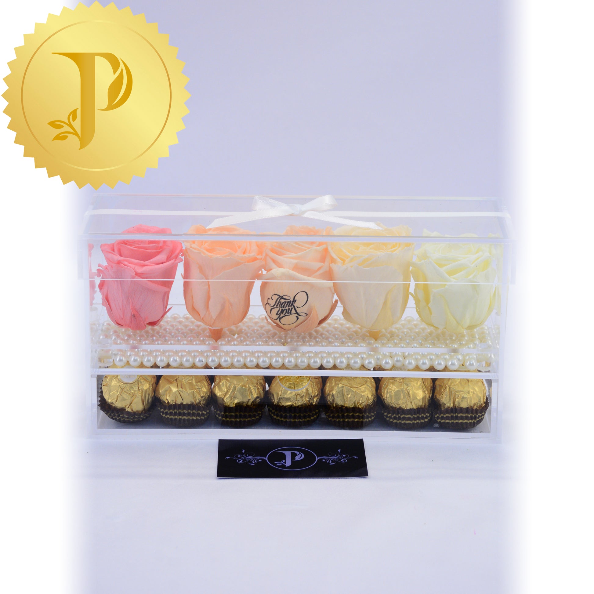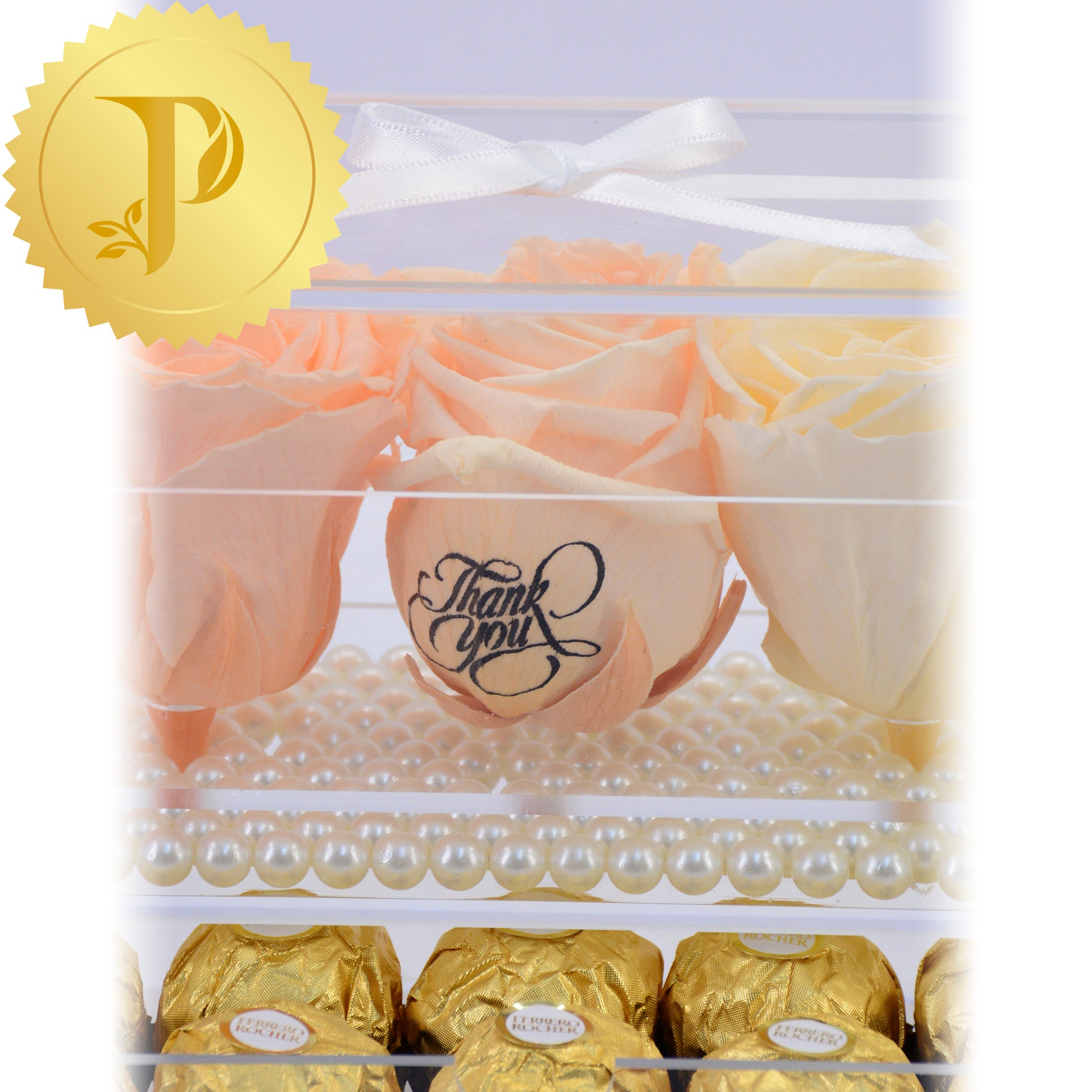 This gift set of five ombre peach-coloured roses in acrylic are complemented by a layer of white pearls and a drawer filled with Ferrero Rocher chocolates.