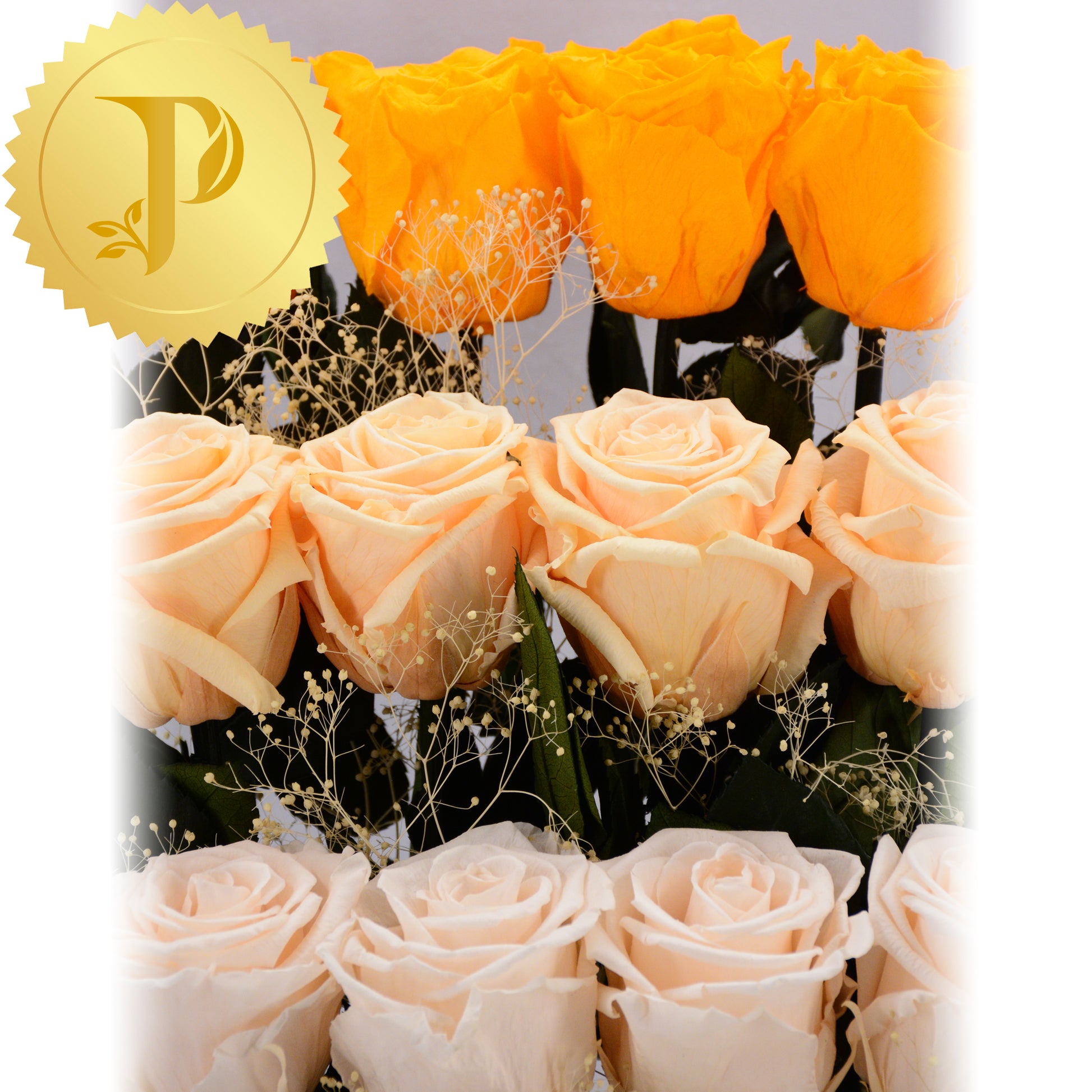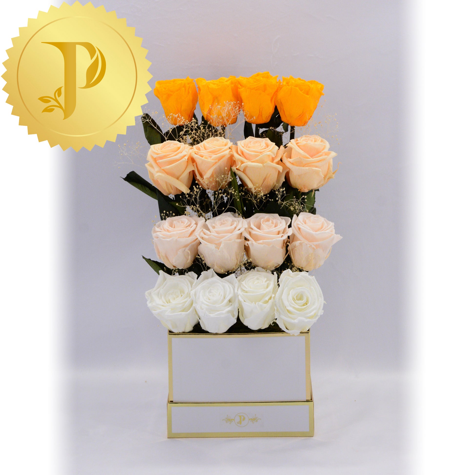 Delicious shades of peach and cream in this sixteen rose arrangement sit on four steps in a concert of dramatic colour. Use this to create a focal point in any room.