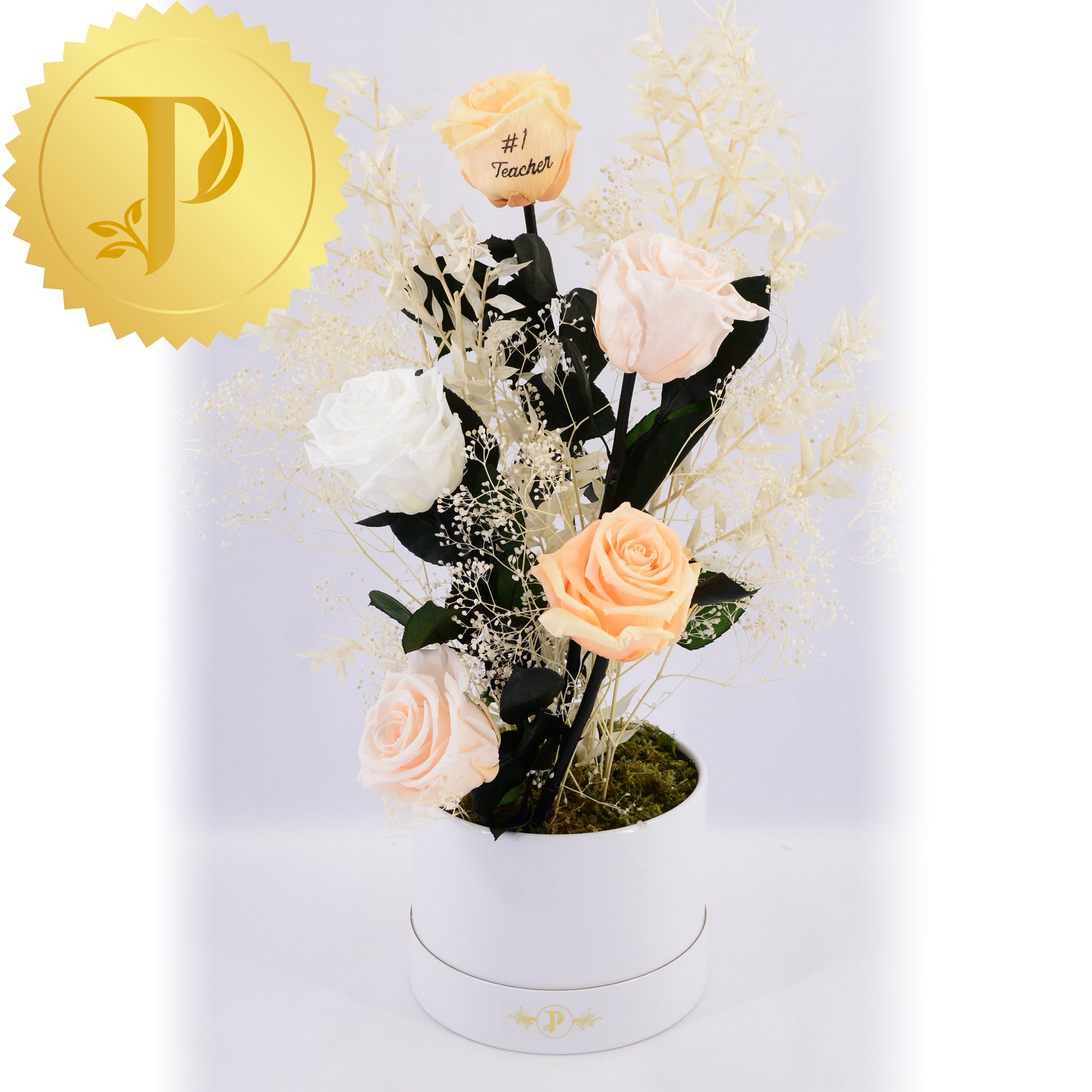 An artistic grouping of five assorted peach and white-coloured roses accented with selected preserved filler. The arrangement is placed in a small round white box, adorned with preserved moss to give a more realistic effect.