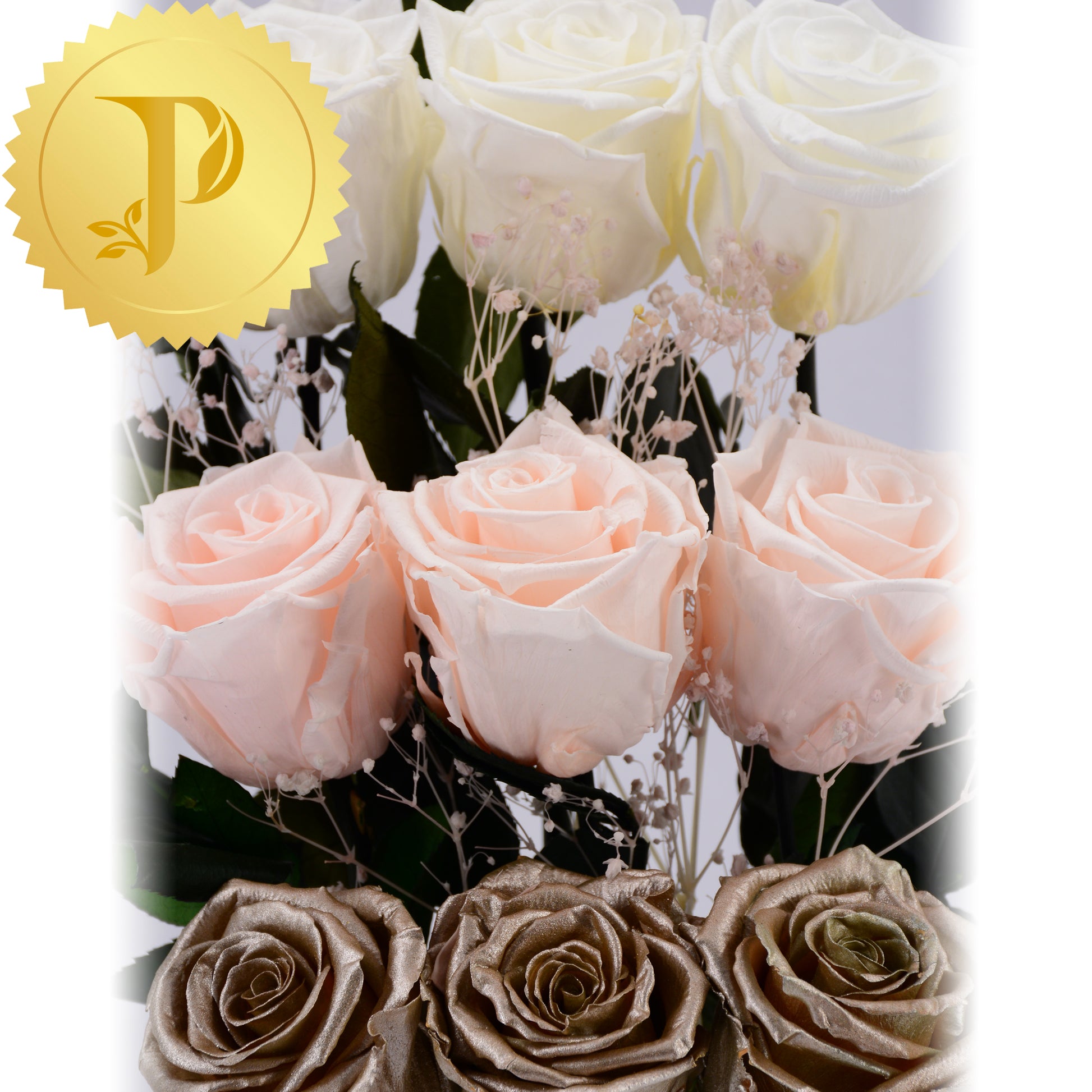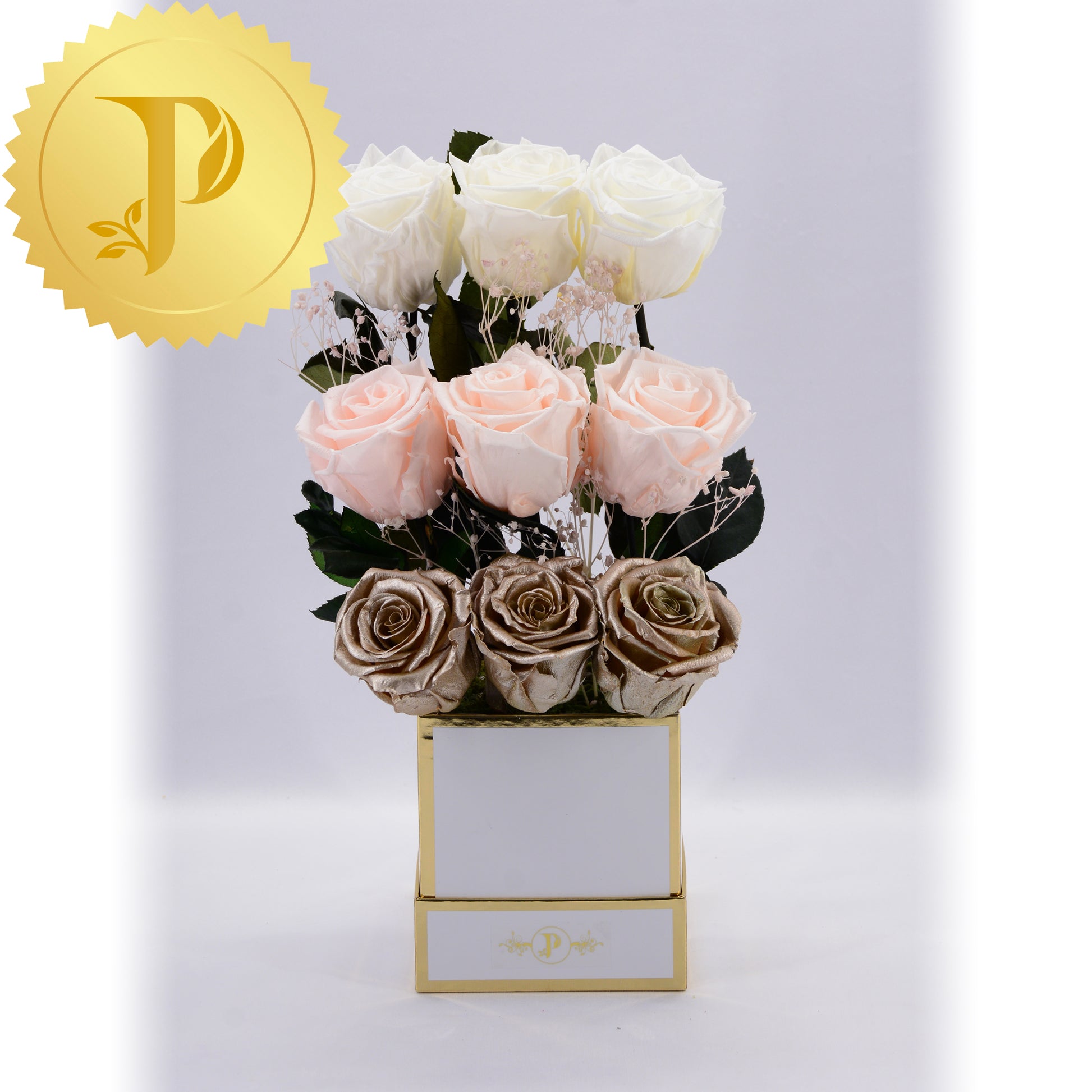 The elegance of rose gold is highlighted in this nine-tiered concert of colour. This delightful arrangement is placed in a square white gold timed box, adorned with preserved moss with preserved moss to give a more realistic effect.