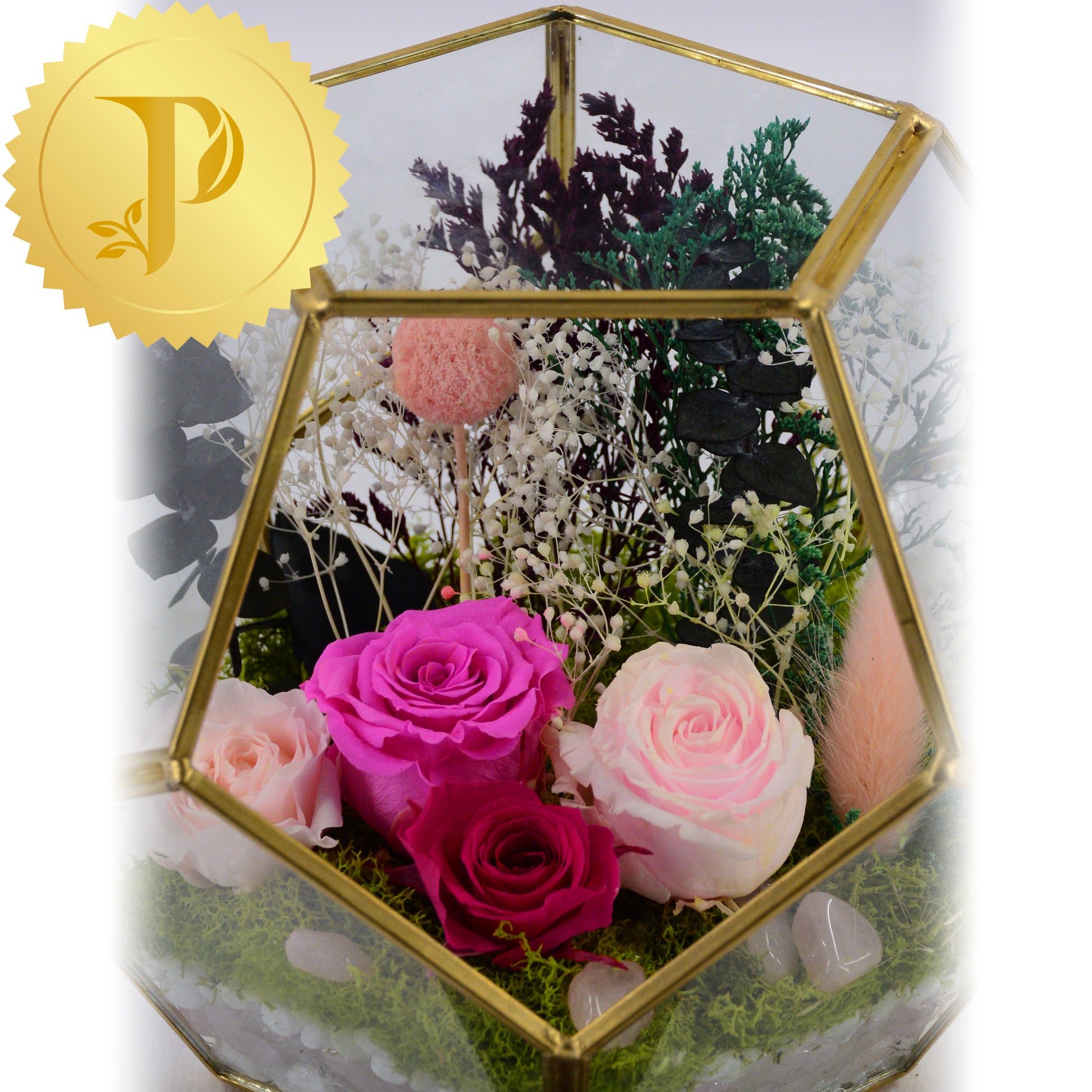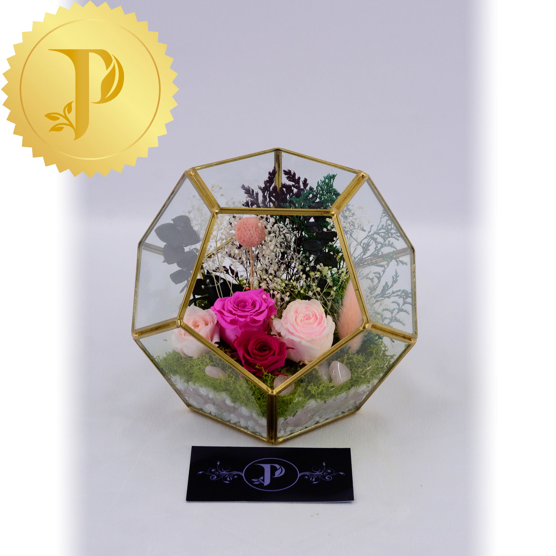 Enjoy this charming multi-sided glass container filled with assorted mini roses, grasses and moss.