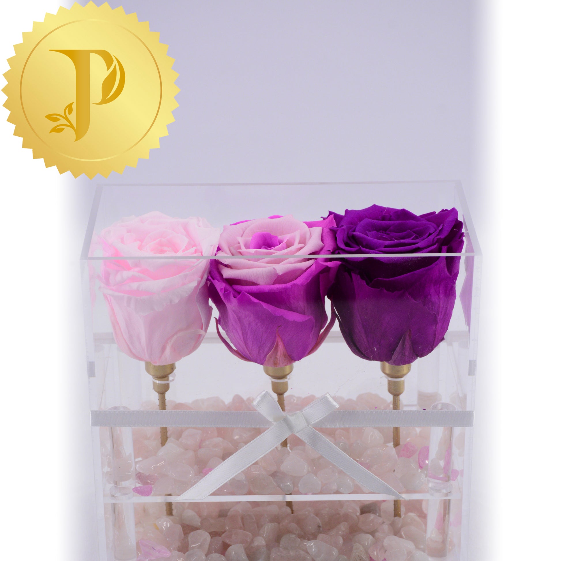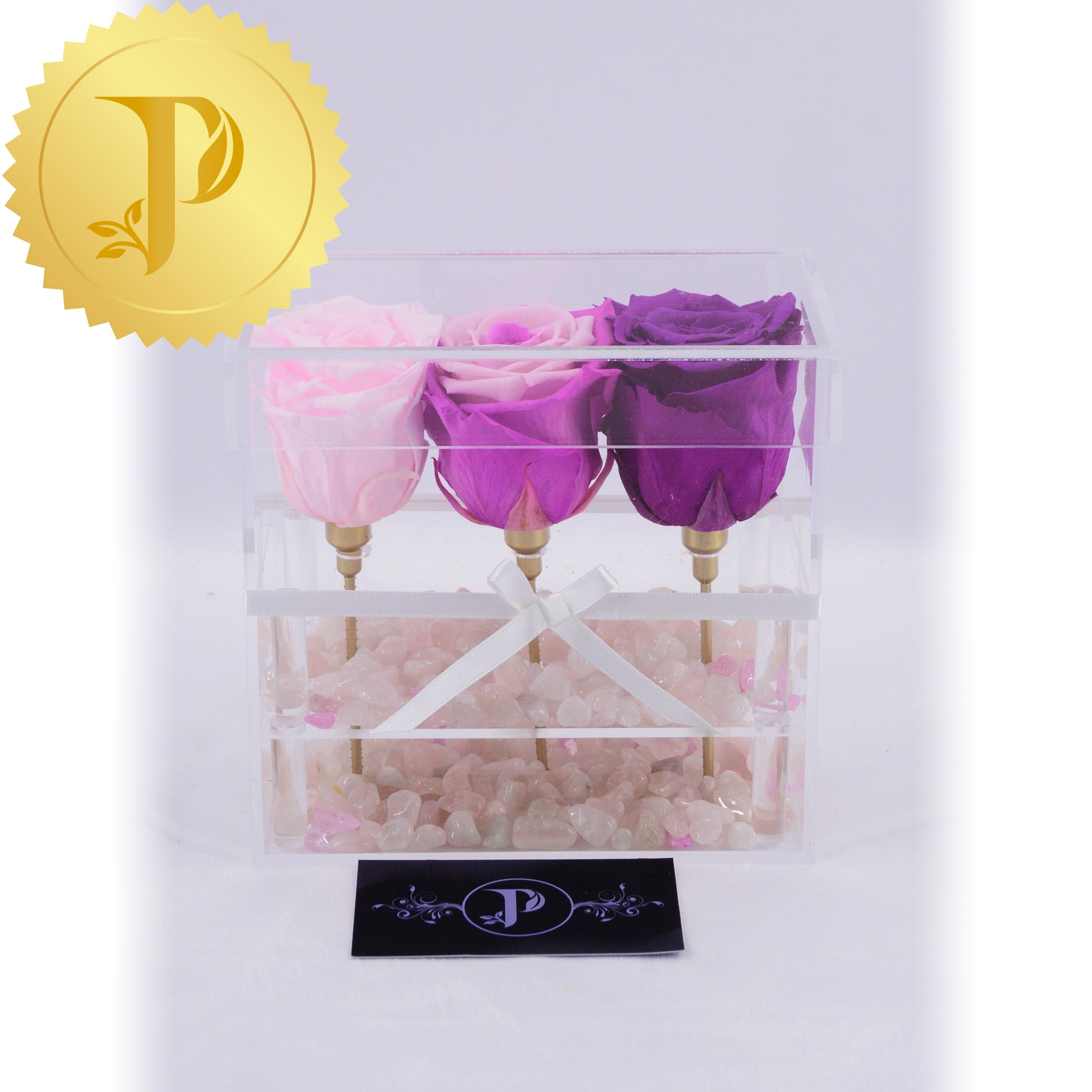 Enjoy this vibrant set of purple to pink roses in an acrylic box. We have used rose quartz for this arrangement. A great gift idea that can go anywhere in the home…. or the workplace.