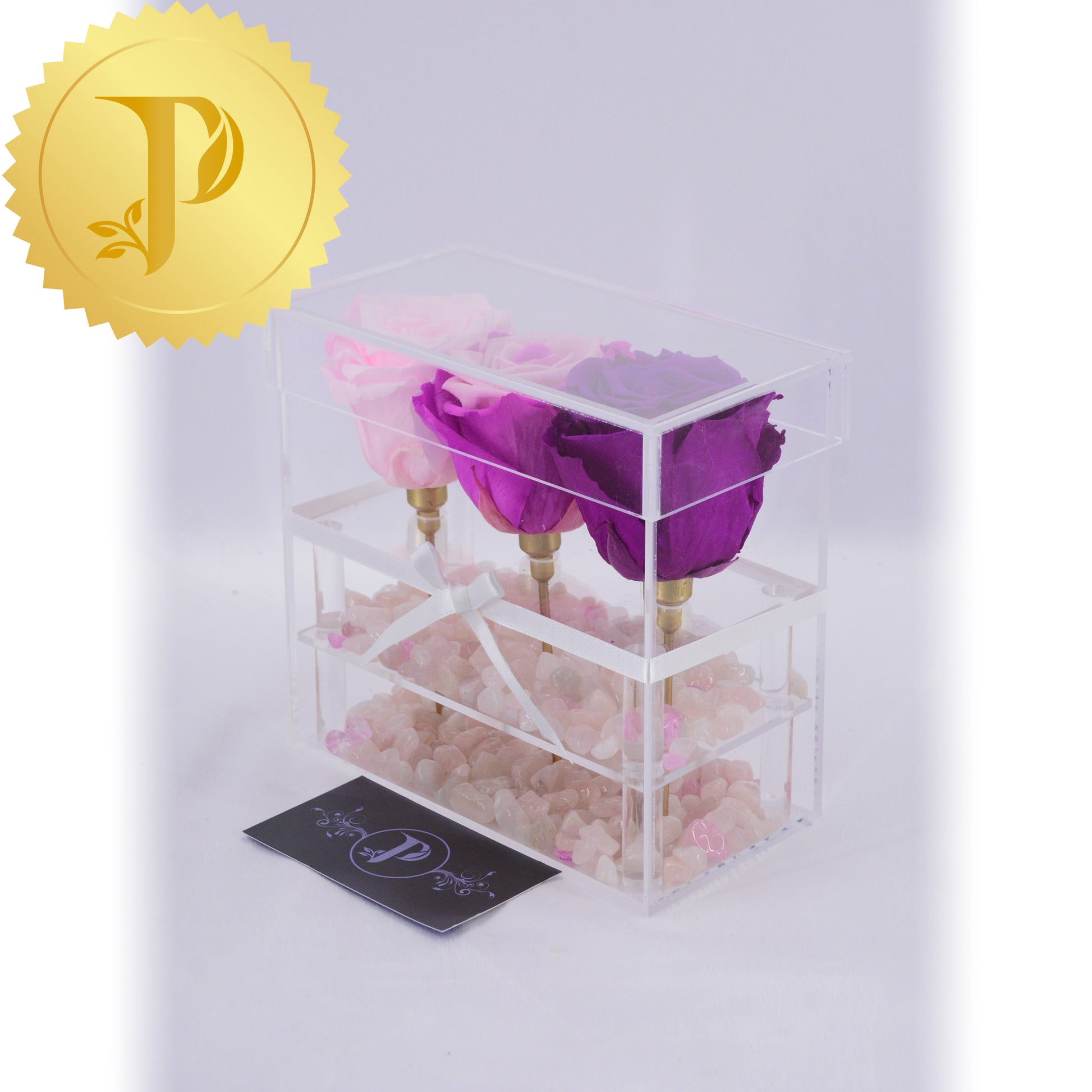 Arrangements in acrylic are available either with a drawer or tall with stems and no drawer. All arrangements come with a layer of your choice of either matching faux pearls, natural stones (lapis lazuli), crystals (clear and rose quartz) or crushed glass (gold). The drawers can be filled with either Ferrero Rocher or Baci chocolates. Acrylic boxes will be highlighted with a white ribbon.