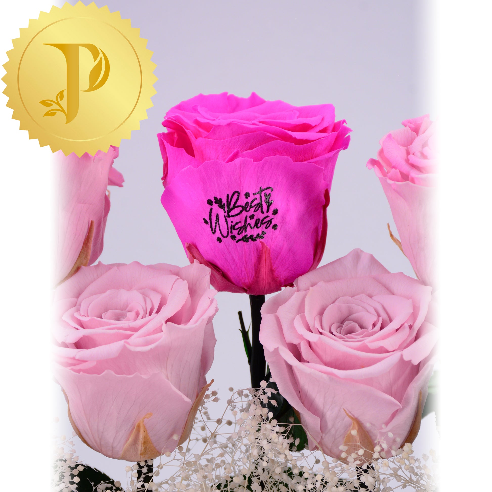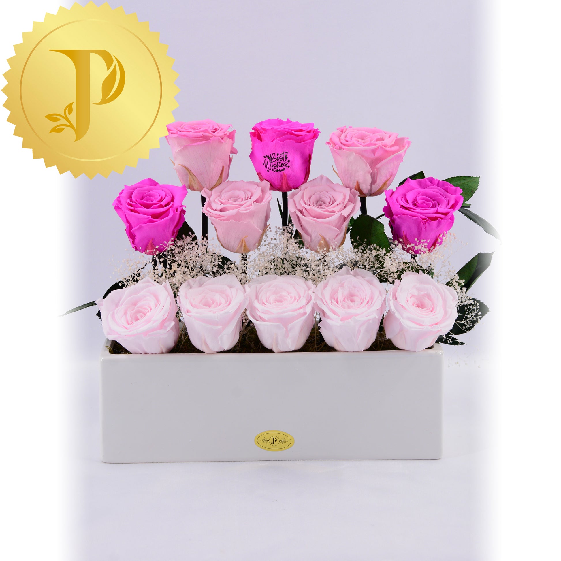 Bring in the charm of the outside in this petite indoor planter with shades of pink coloured roses. This charming arrangement showcases a dozen different roses with lacy white gypsophila. A base row of soft pink roses is used to accentuate the other pink colours. Our roses are placed in a white ceramic planter adorned with preserved moss used to give a more realistic effect.