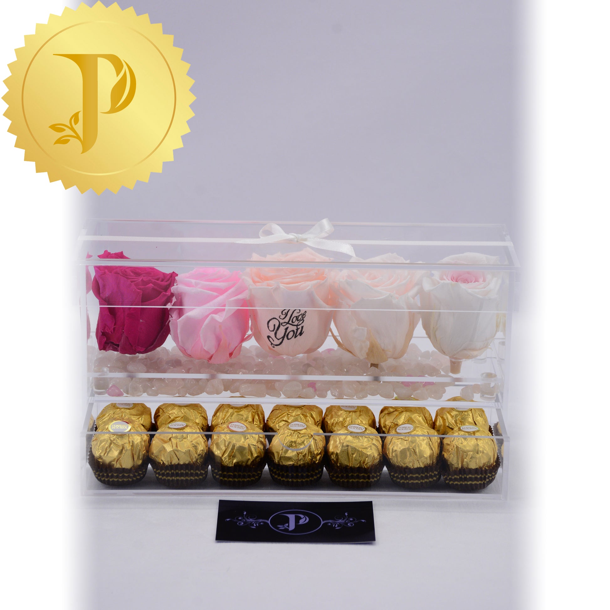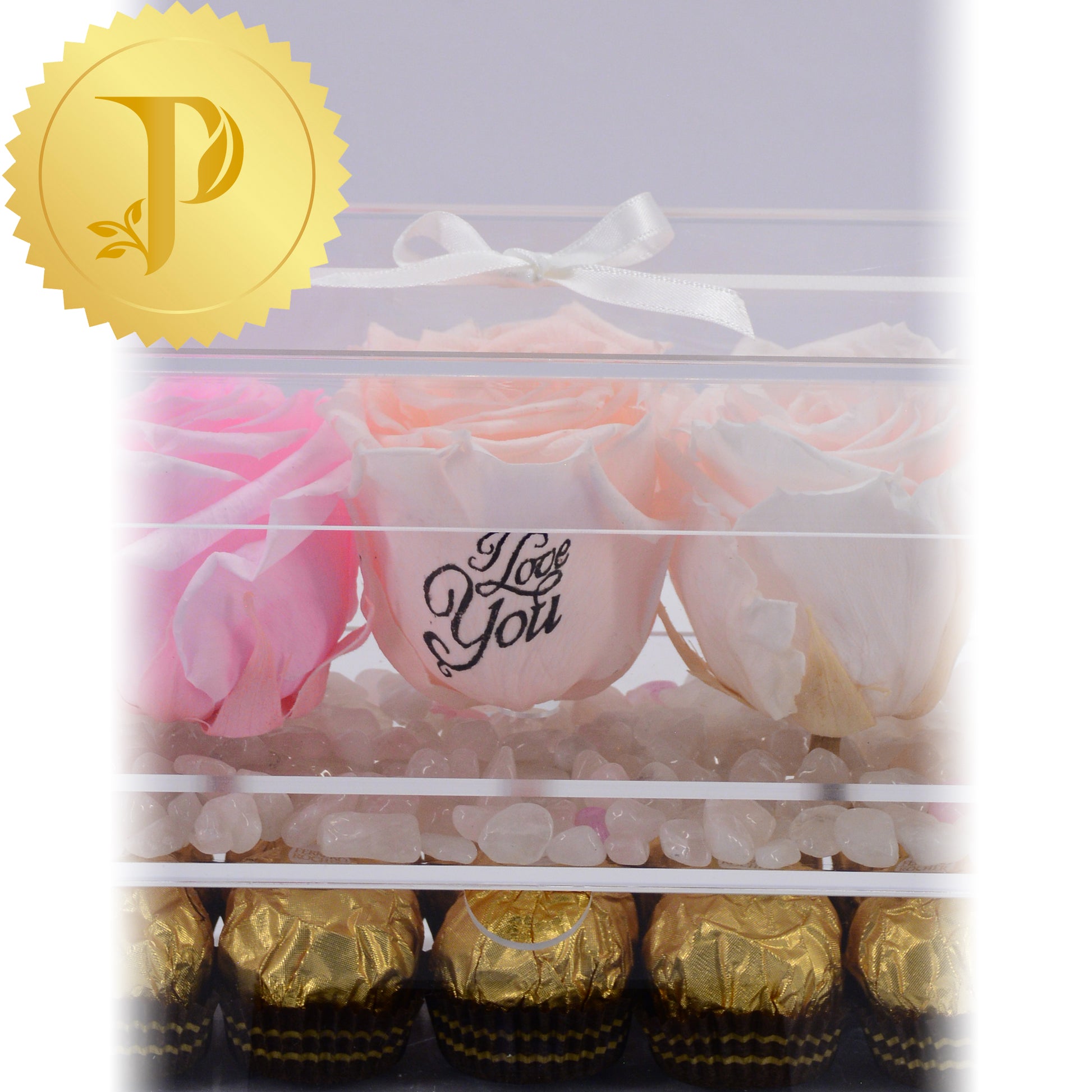 Arrangements in acrylic are available either with a drawer or tall with stems and no drawer. All arrangements come with a layer of your choice of either matching faux pearls, natural stones (lapis lazuli), crystals (clear and rose quartz) or crushed glass (gold). The drawers can be filled with either Ferrero Rocher or Baci chocolates. Acrylic boxes will be highlighted with a white ribbon.