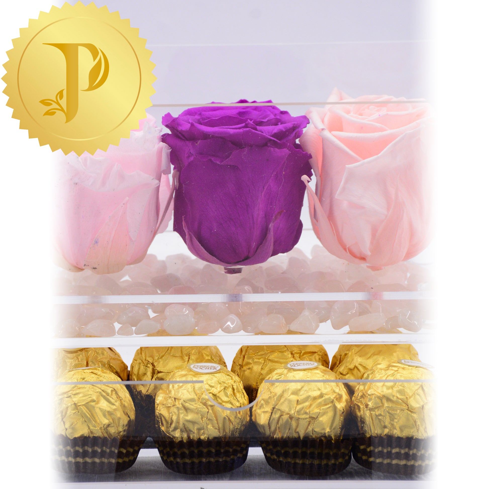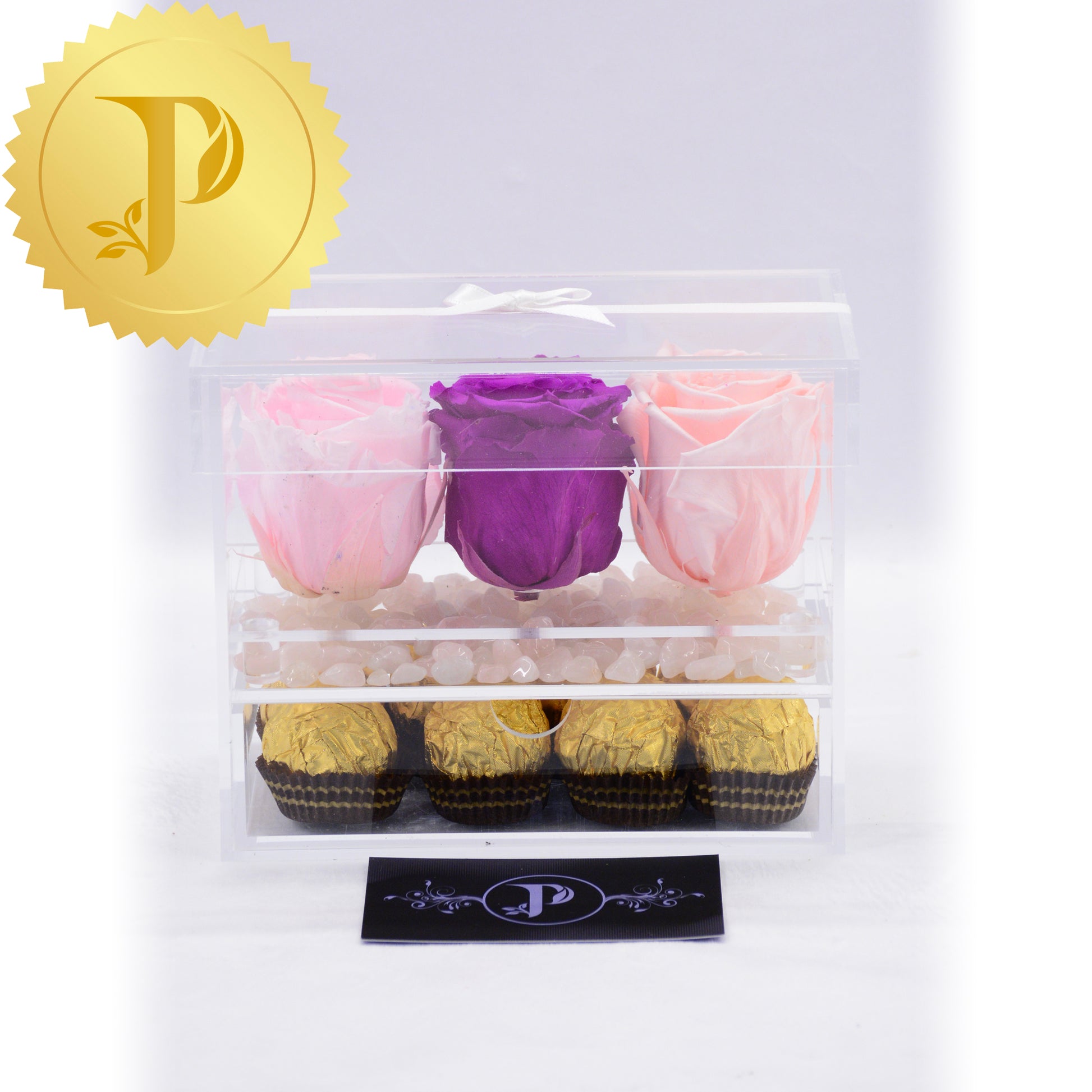 This rose trio in acrylic with light pink and purple-coloured roses are complemented by a layer of rose quartz and a drawer filled with Ferrero Rocher chocolates. Rose quartz is a healing crystal known for promoting love and friendship.