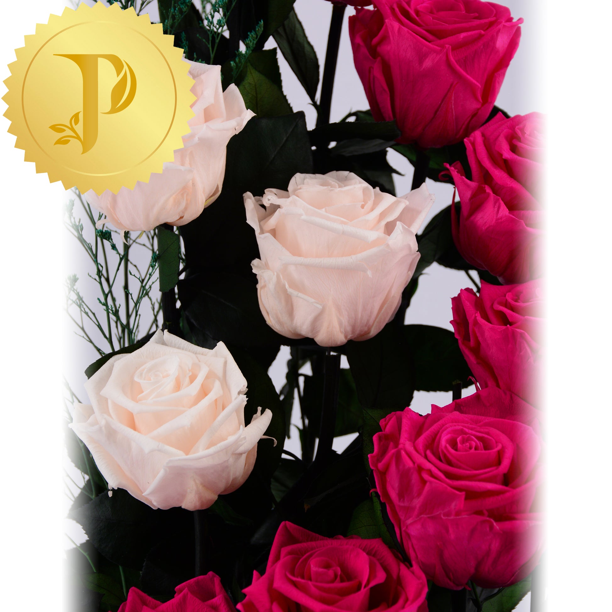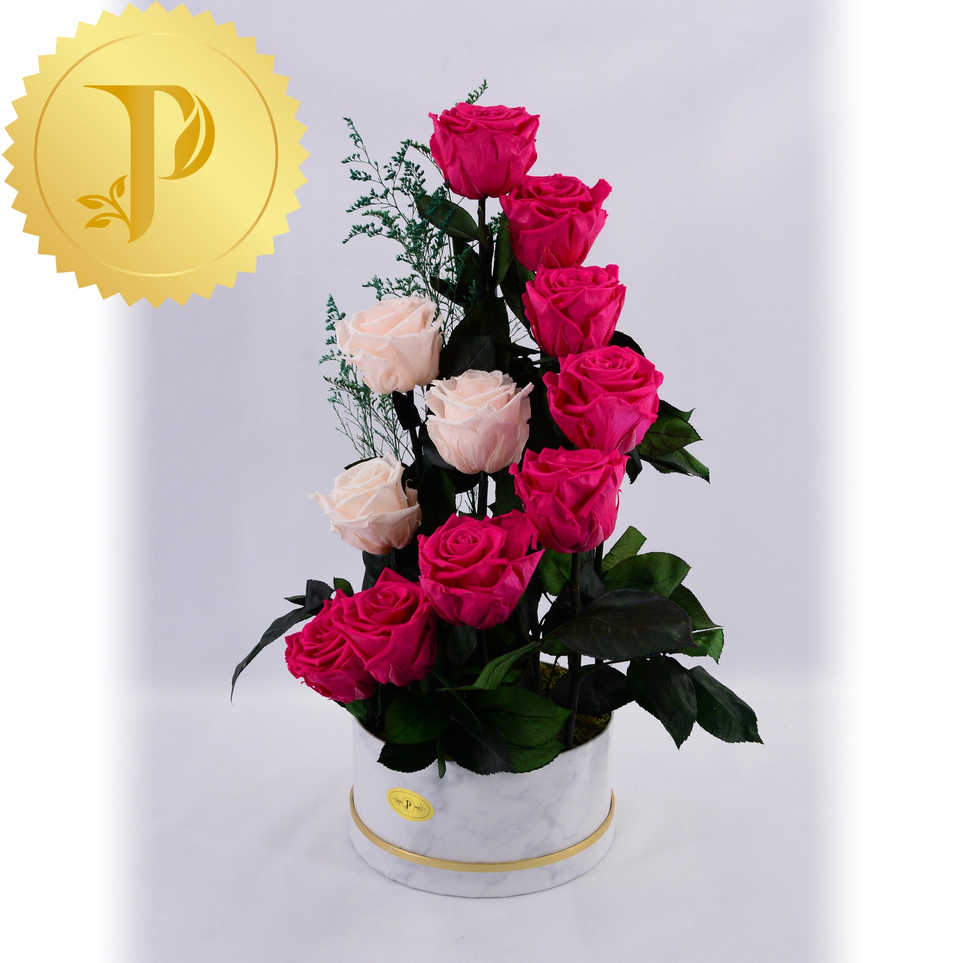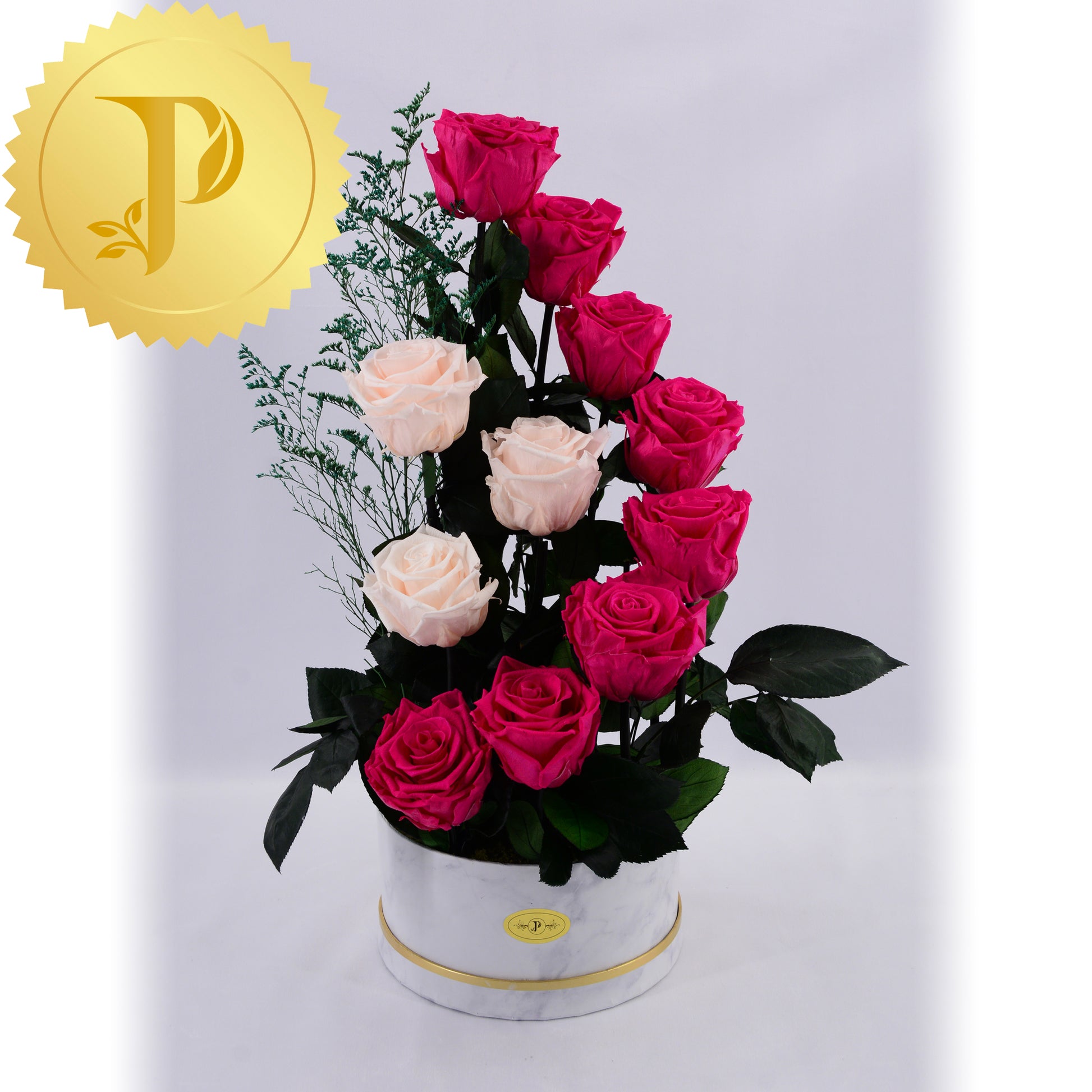 A graceful curl formed by the festivity of eight magenta and three light pink roses nesting inside. The elegance of this arrangement is enhanced with our white marble patterned container.