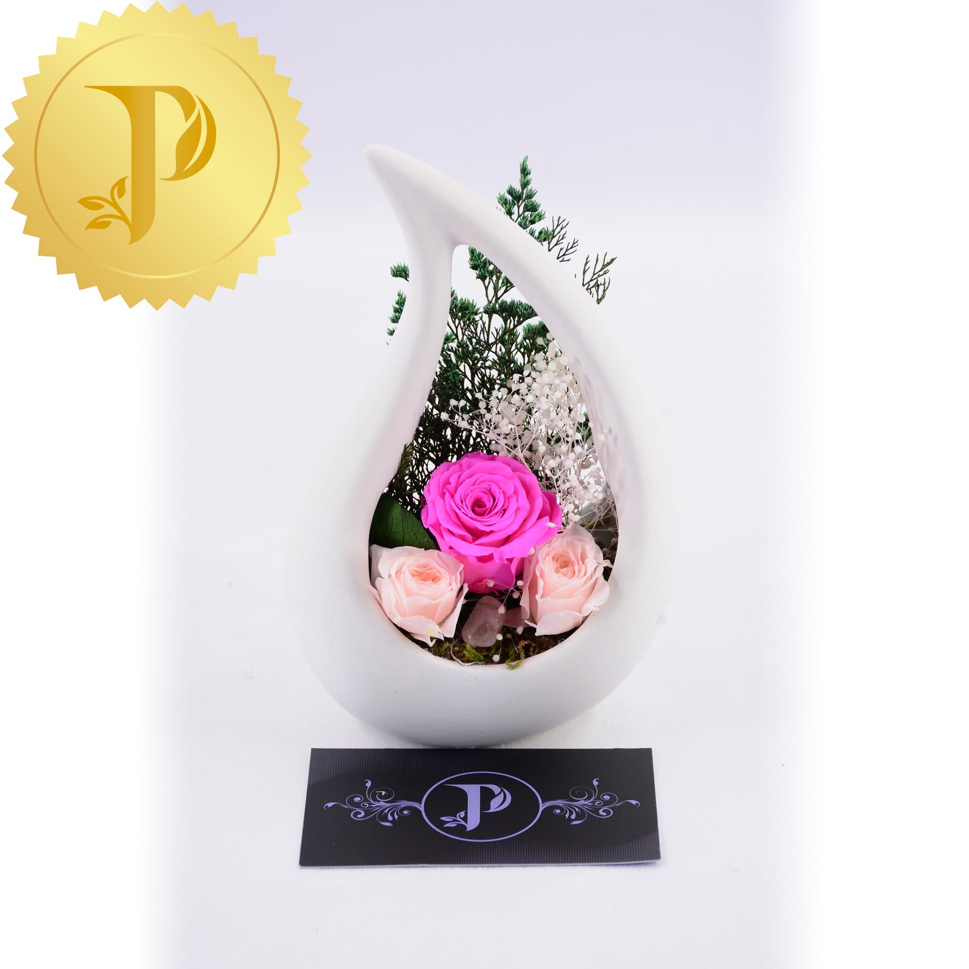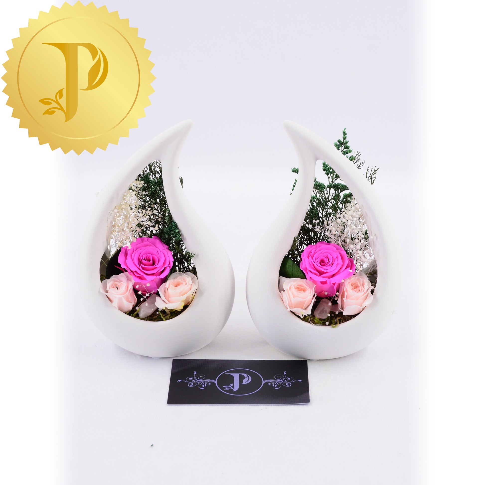 The ceramic raindrops stand approximately six inches high and are 4” in width, making it easy to fit into small spaces, either side by side or separately. Each contains a small rose with two miniature roses on the side highlighted with complementary colour gypsophila, limonium, and a rose quartz crystal.