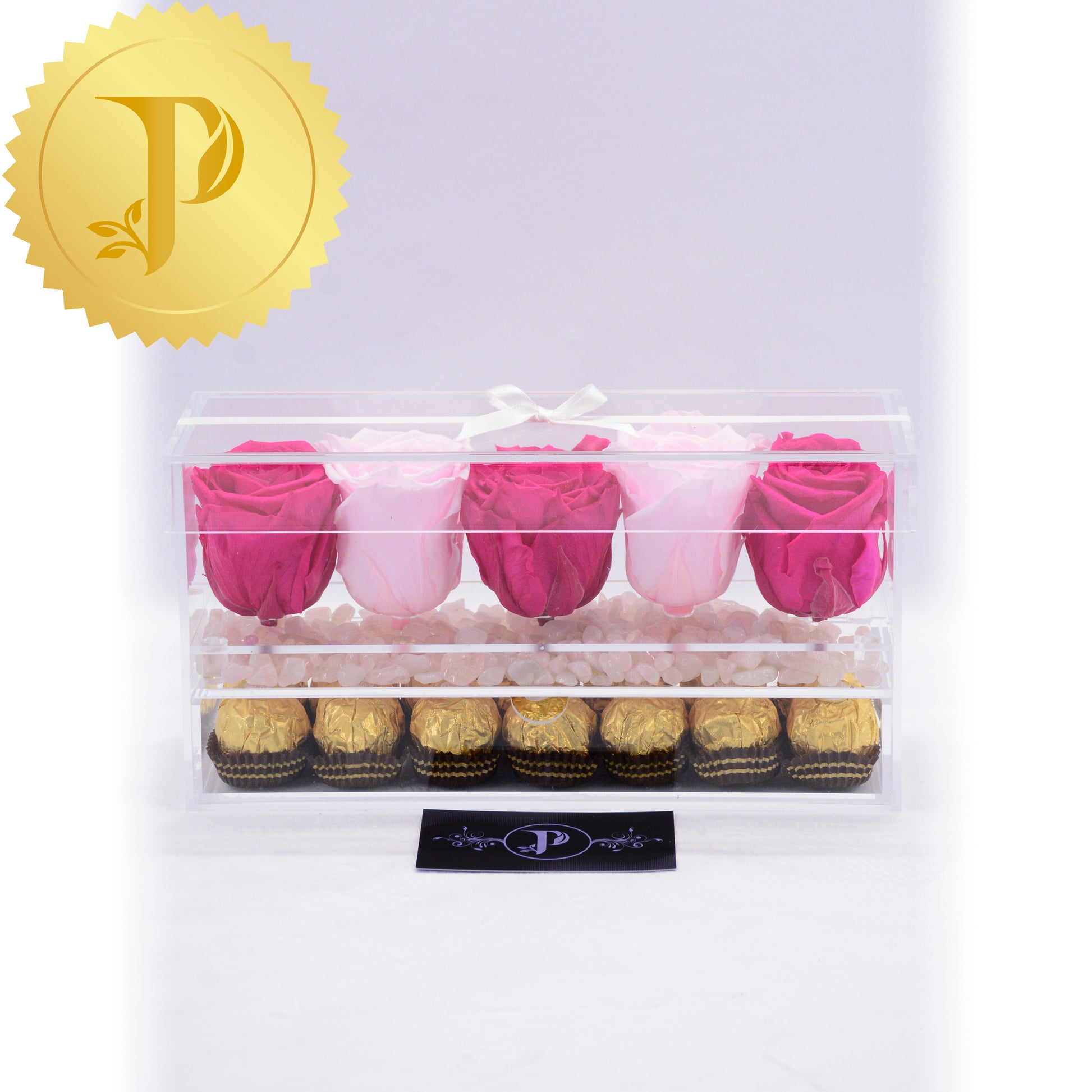 Arrangements in acrylic are available either with a drawer or tall with stems and no drawer. All arrangements come with a layer of your choice of either matching faux pearls, natural stones (lapis lazuli), crystals (clear and rose quartz) or crushed glass (gold). The drawers can be filled with either Ferrero Rocher or Baci chocolates. Acrylic boxes will be highlighted with a white ribbon.
