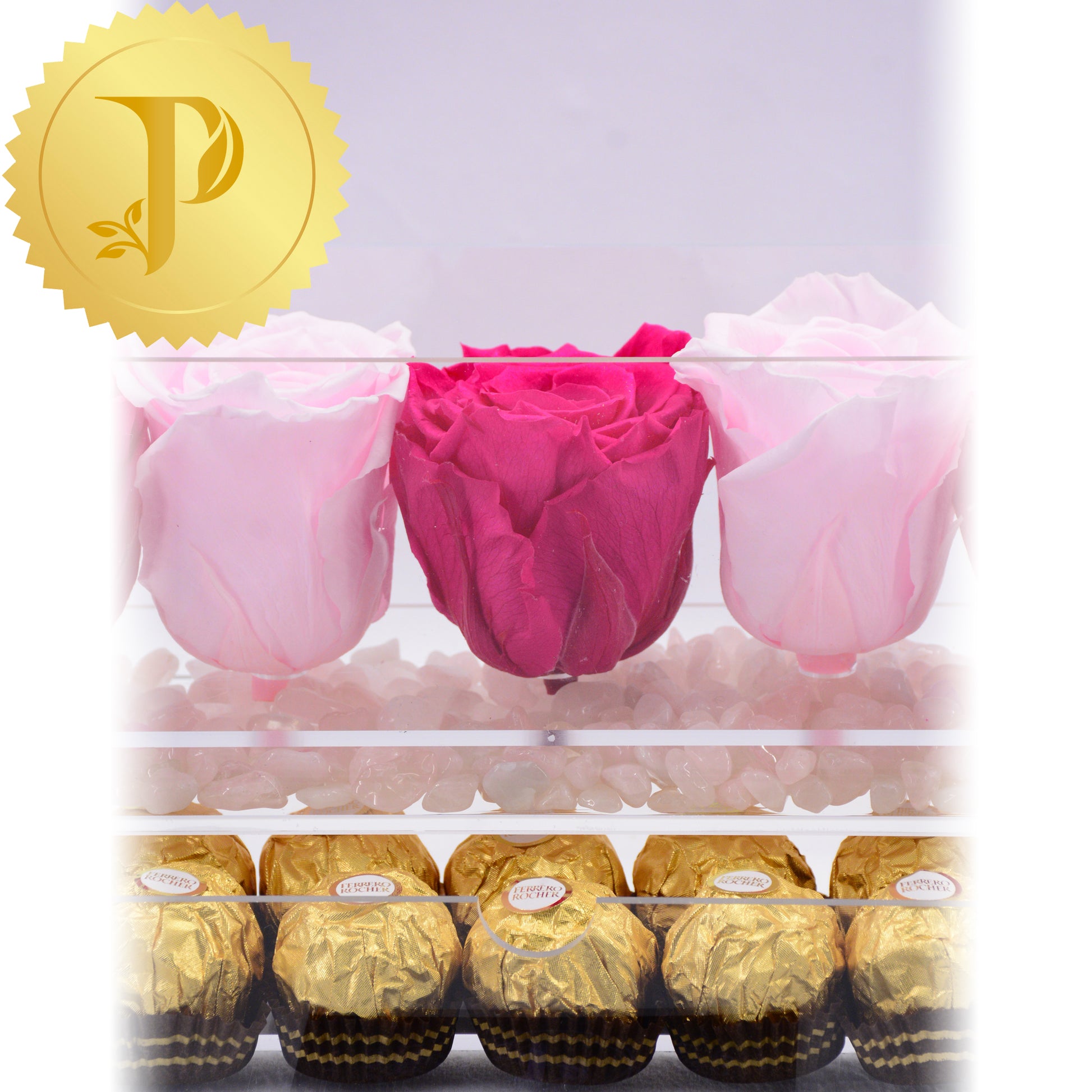 This (acrylic) gift set is complemented by a layer of rose quartz and a drawer filled with Ferrero Rocher chocolates. Rose quartz is a healing crystal known for promoting love and friendship.