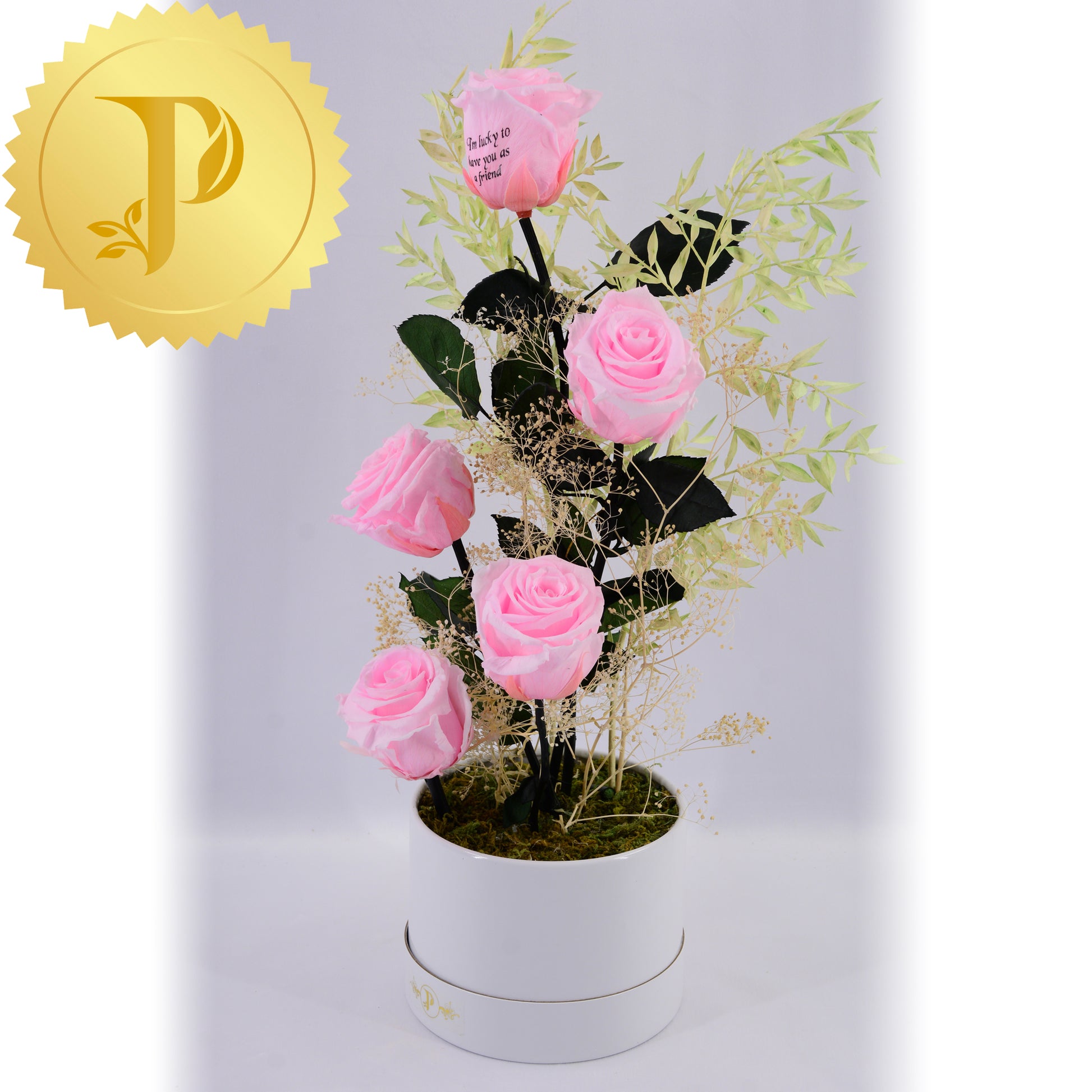 An artistic grouping of five bright, pink-coloured roses accented with selected preserved filler. The arrangement is placed in a small round white box, adorned with preserved moss to give a more realistic effect.