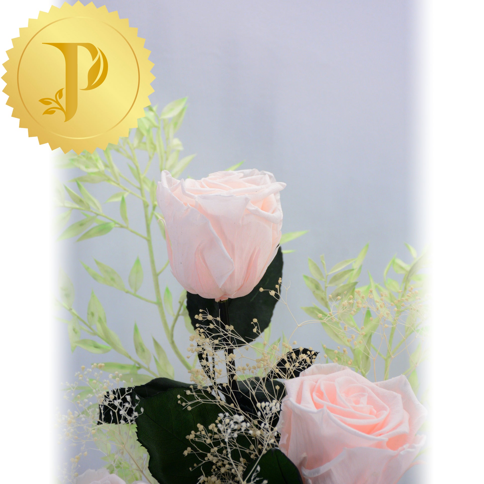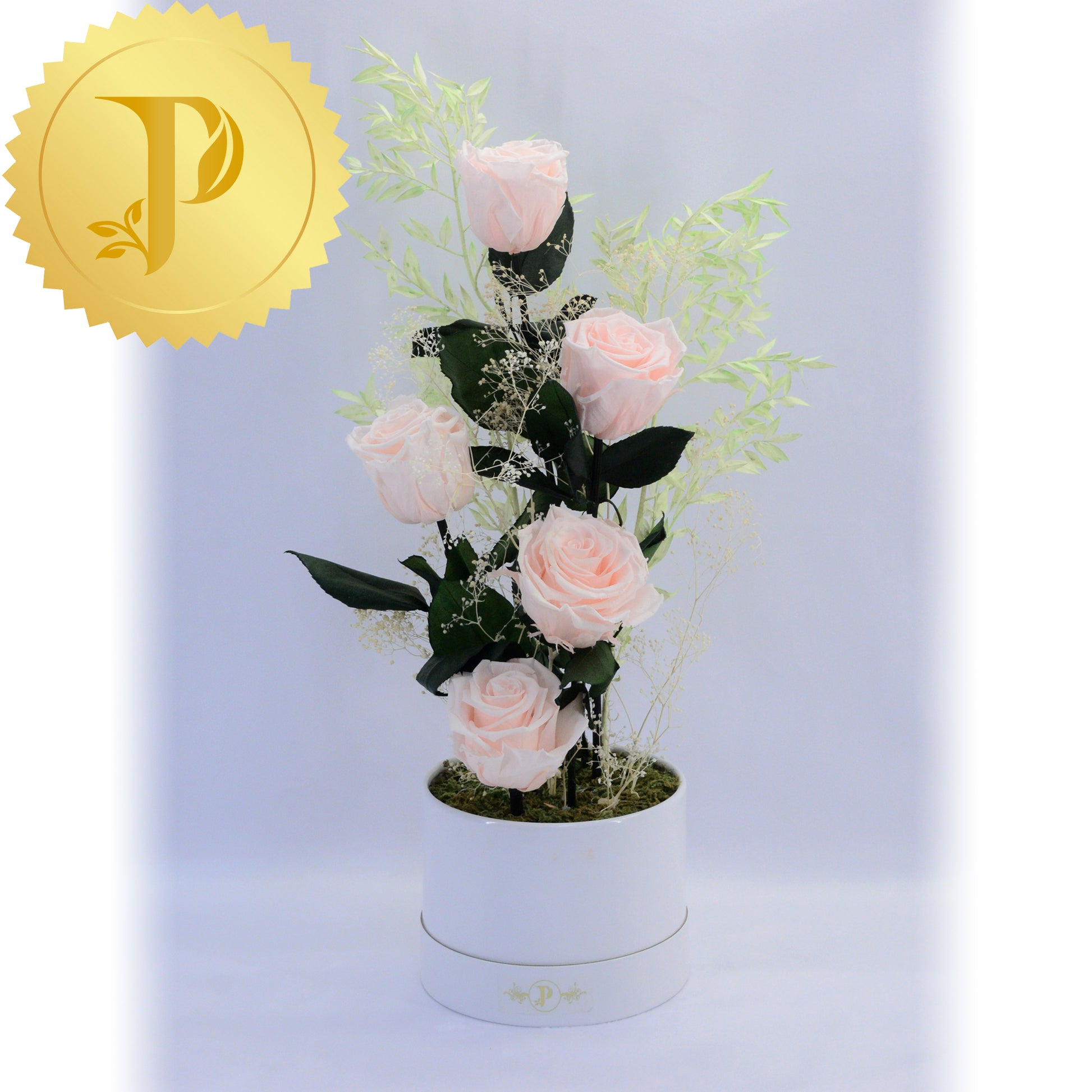 An artistic grouping of five blush-coloured roses accented with selected preserved filler. The arrangement is placed in a small round white box, adorned with preserved moss to give a more realistic effect.