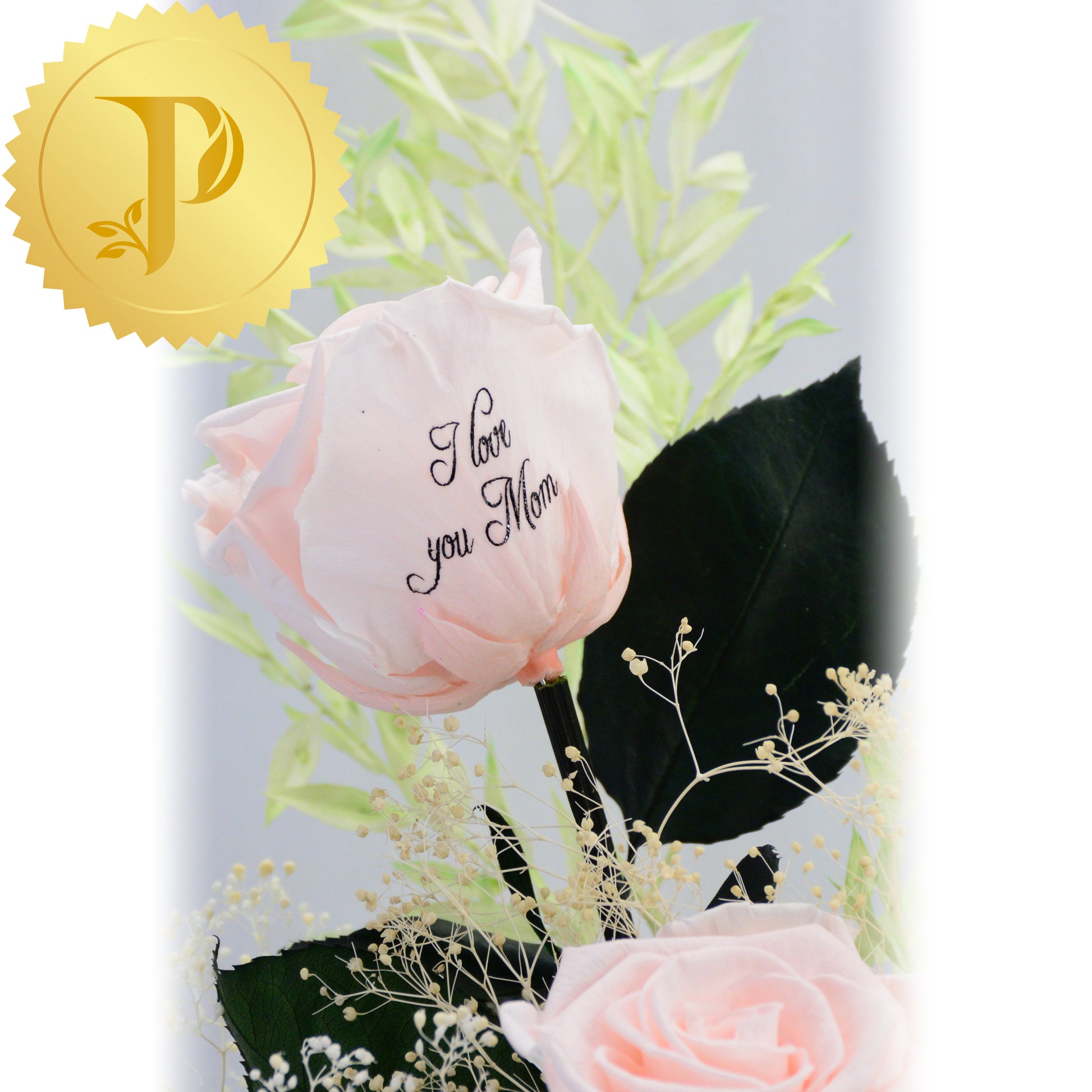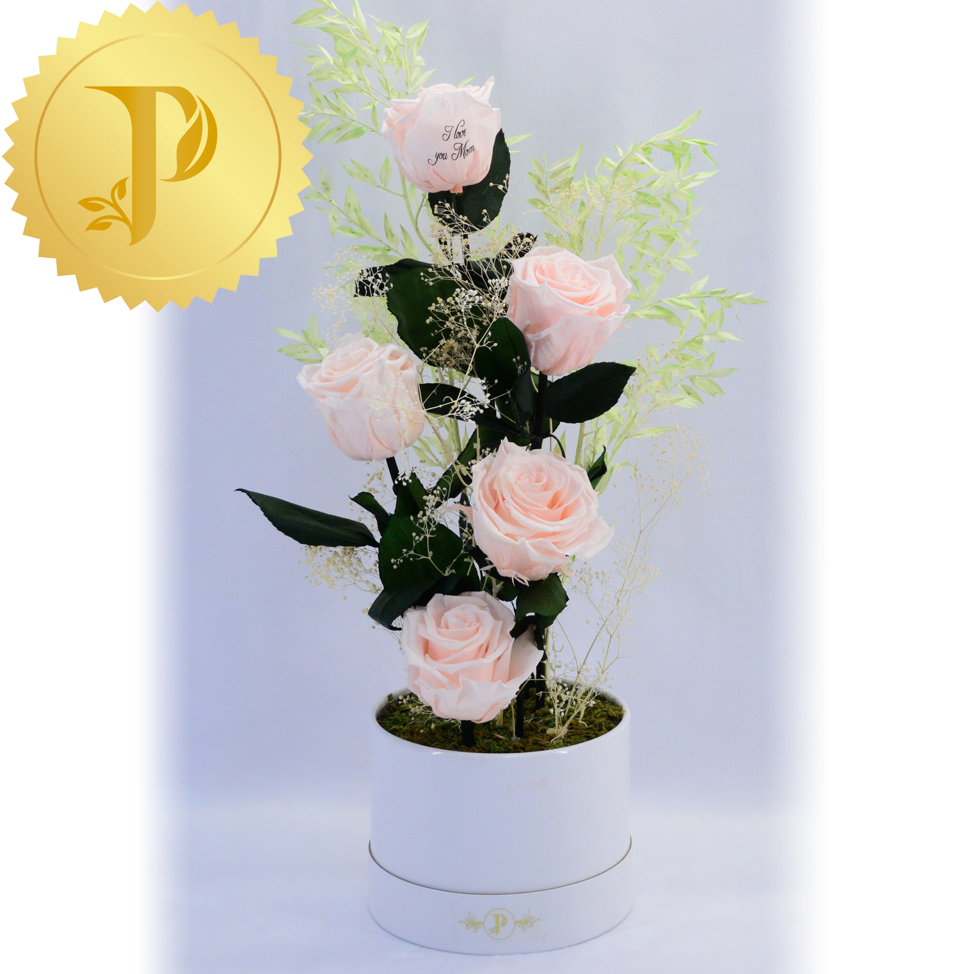 An artistic grouping of five blush-coloured roses accented with selected preserved filler. The arrangement is placed in a small round white box, adorned with preserved moss to give a more realistic effect.