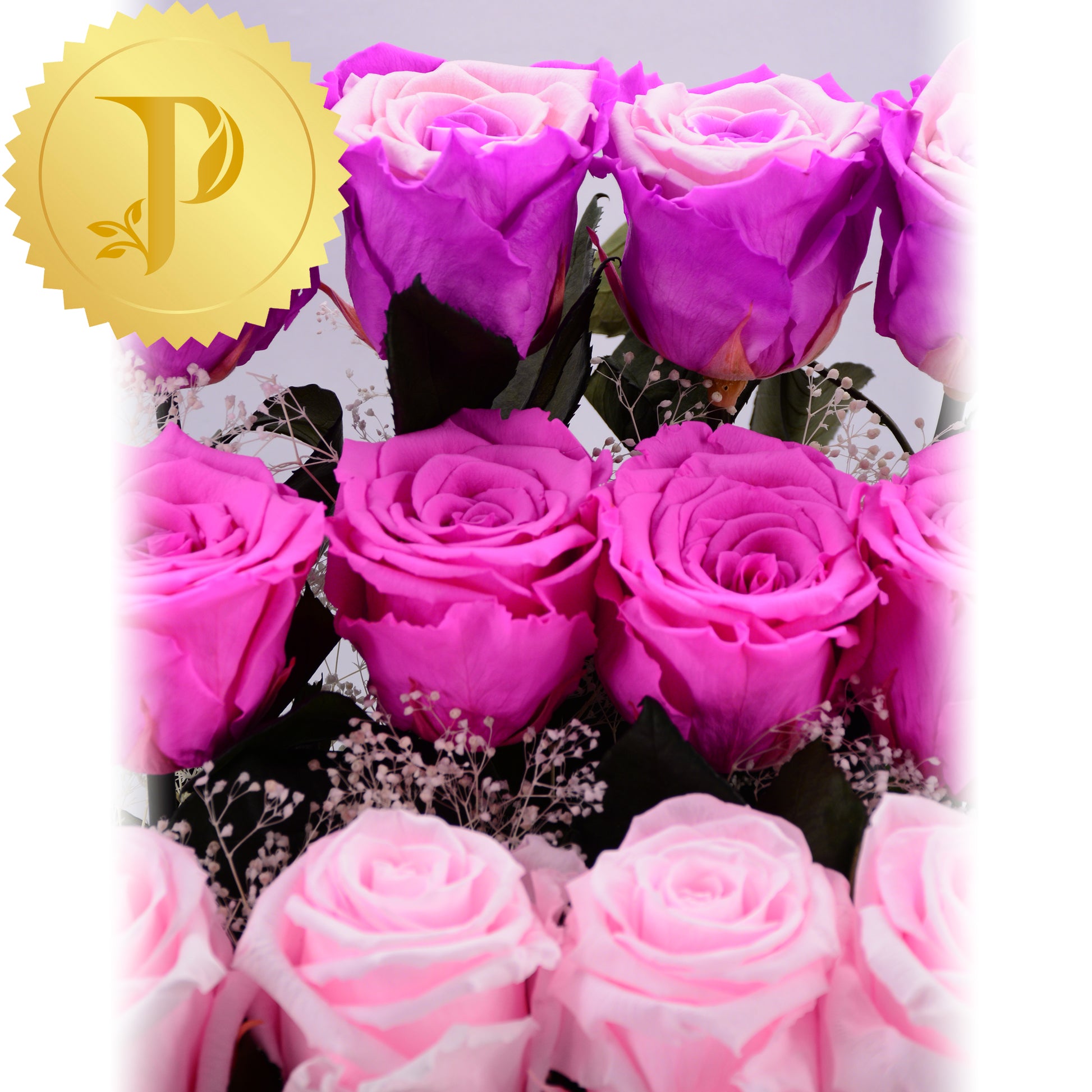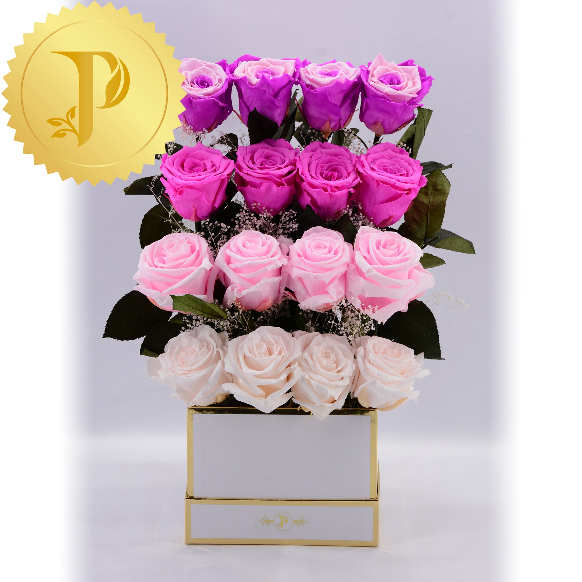 Sixteen bright and stunning roses in various shades of pink sit on four steps in a concert of dramatic colour. Use this to create a focal point in any room.