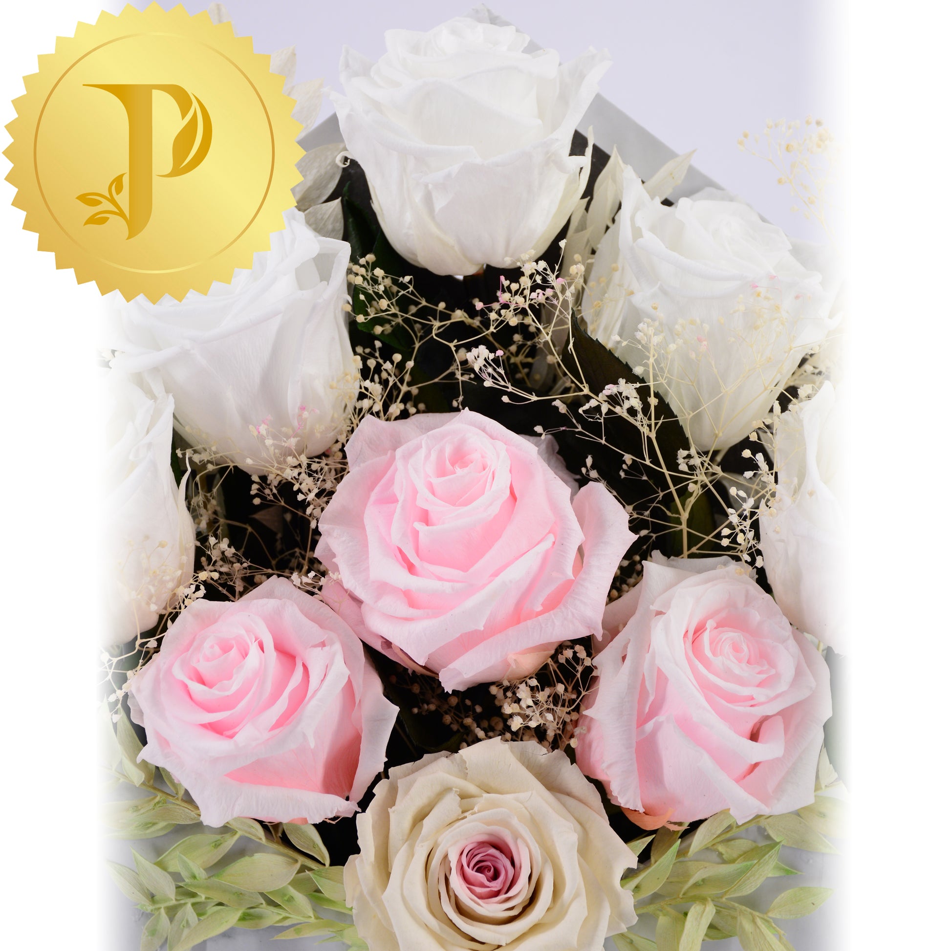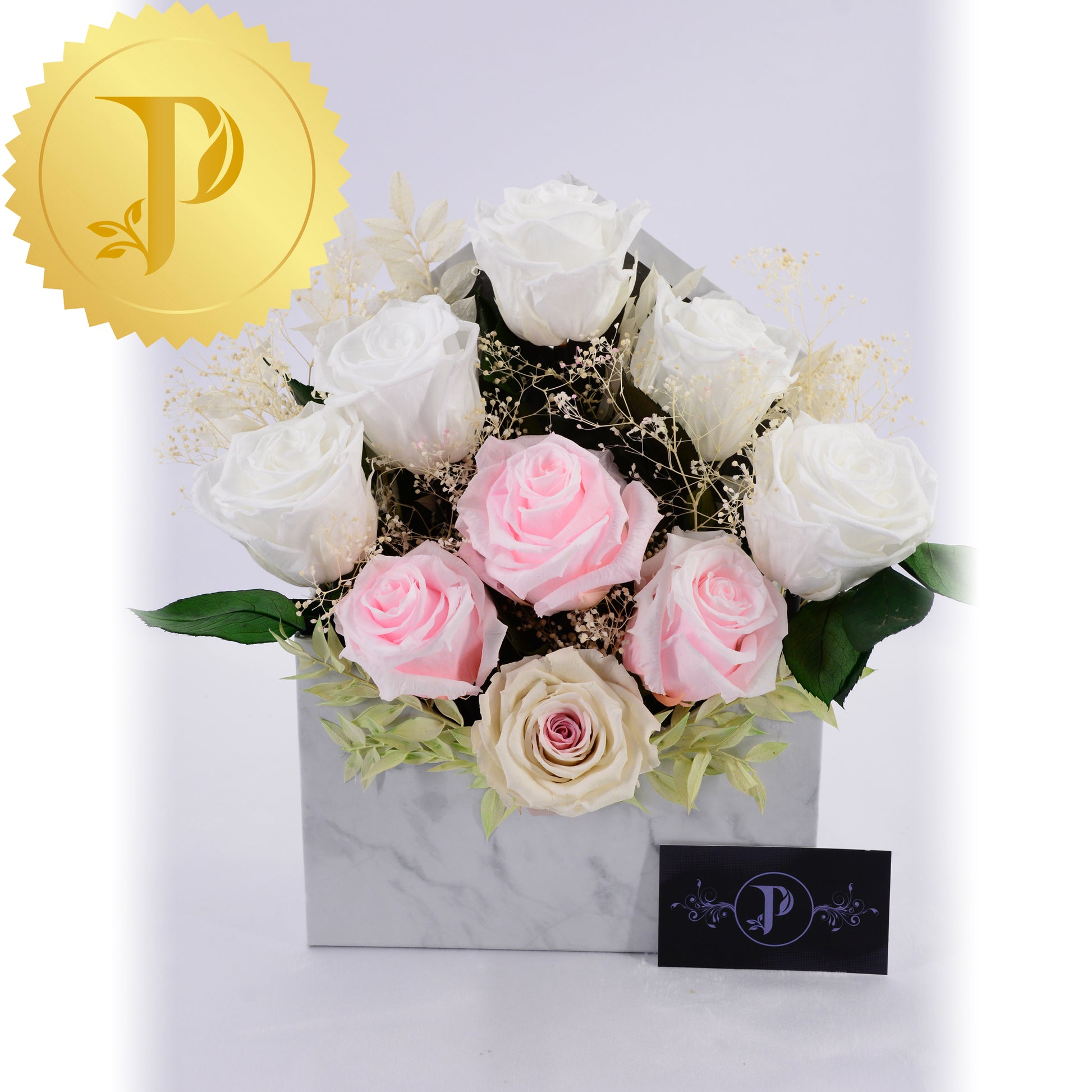 Convey a sweet message of love and friendship with this cute, white, marbleized envelope design. A combination of nine roses in pink and bright white, accented with a unique white rose with a pink centre. This delightful arrangement will enhance any room and is also suitable for hanging (picture hanger included).