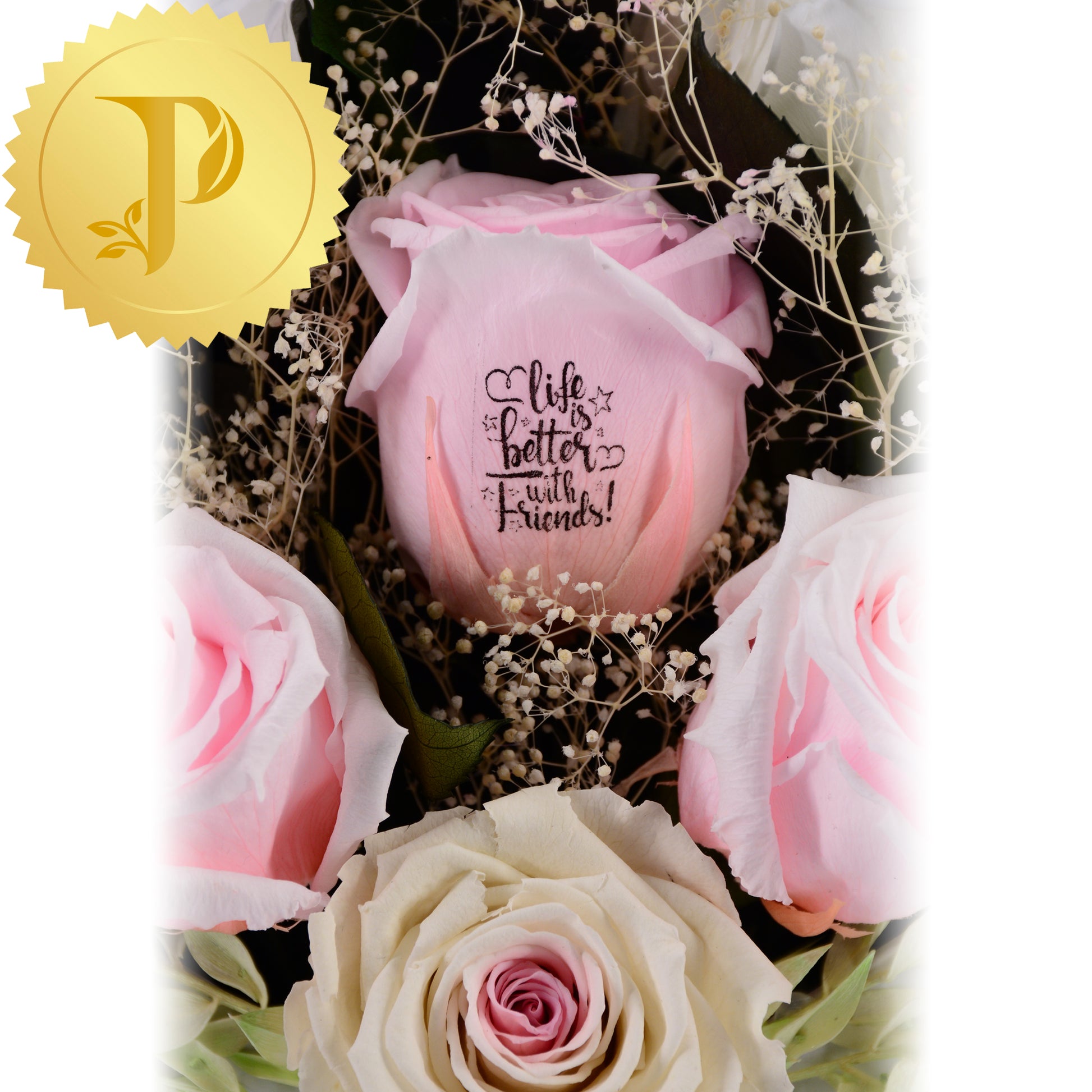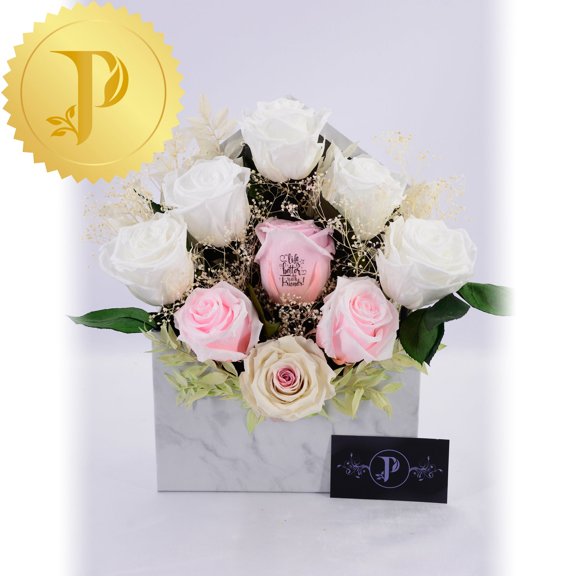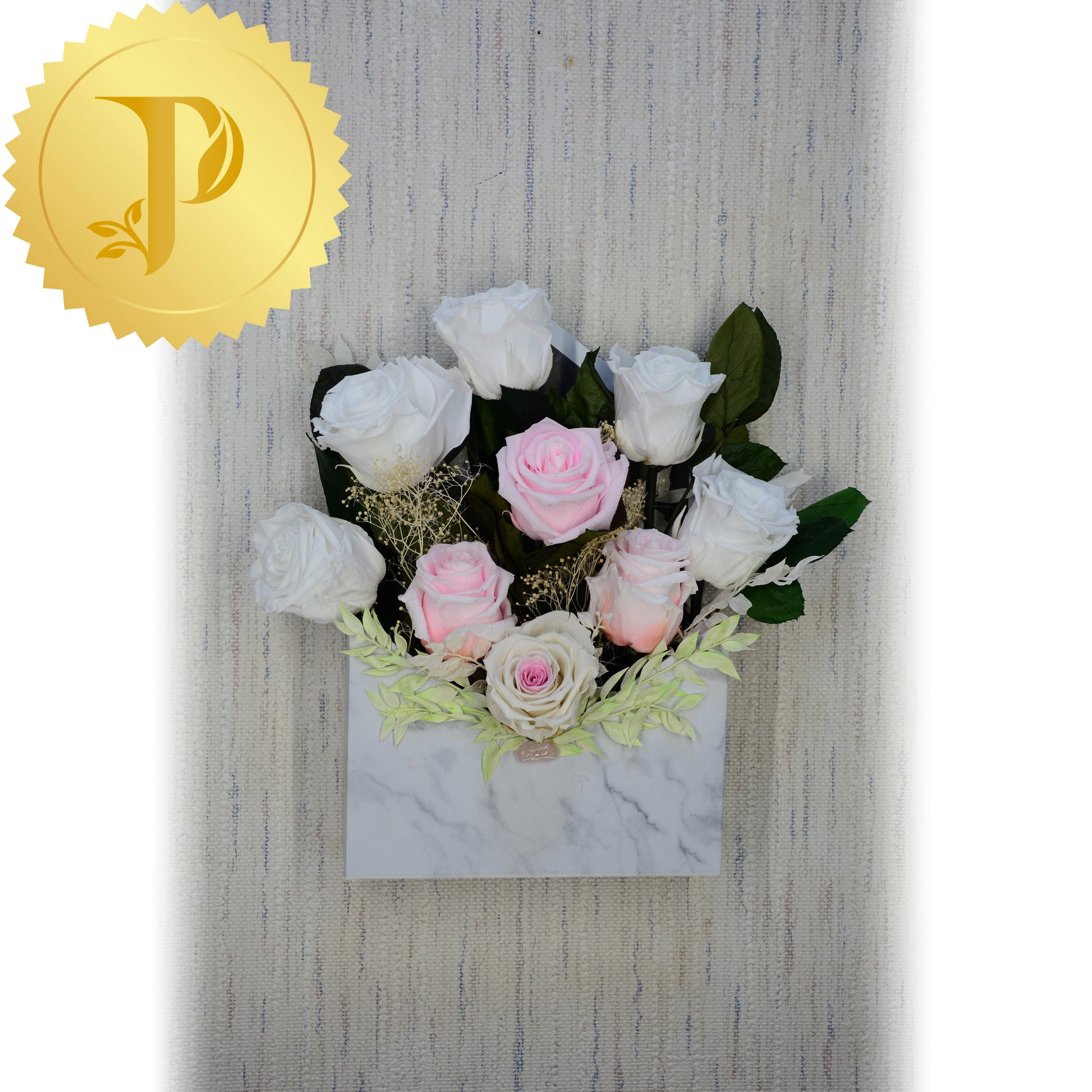 Convey a sweet message of love and friendship with this cute, marbleized envelope design. A combination of nine roses in pink and bright white, accented with a unique white rose with a pink centre. This delightful arrangement will enhance any room and is also suitable for hanging (picture hanger included).