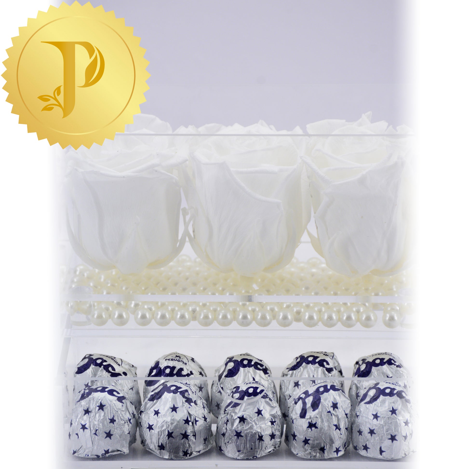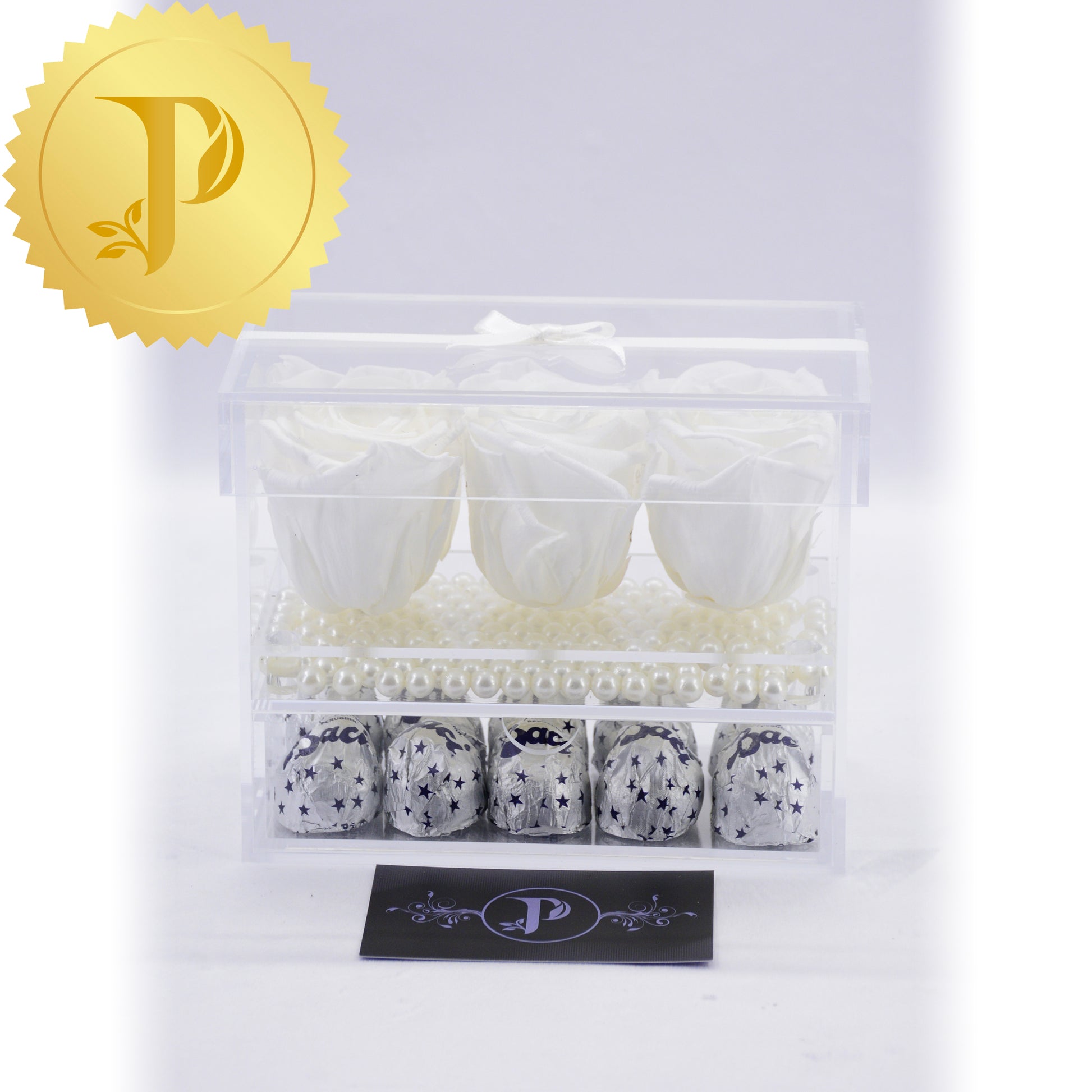 This rose trio in acrylic with bright white roses are complemented by a layer of faux white pearls and a drawer filled with Baci chocolates.