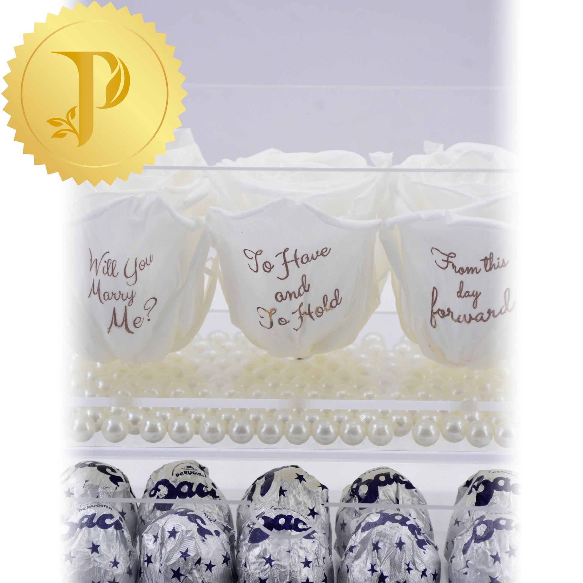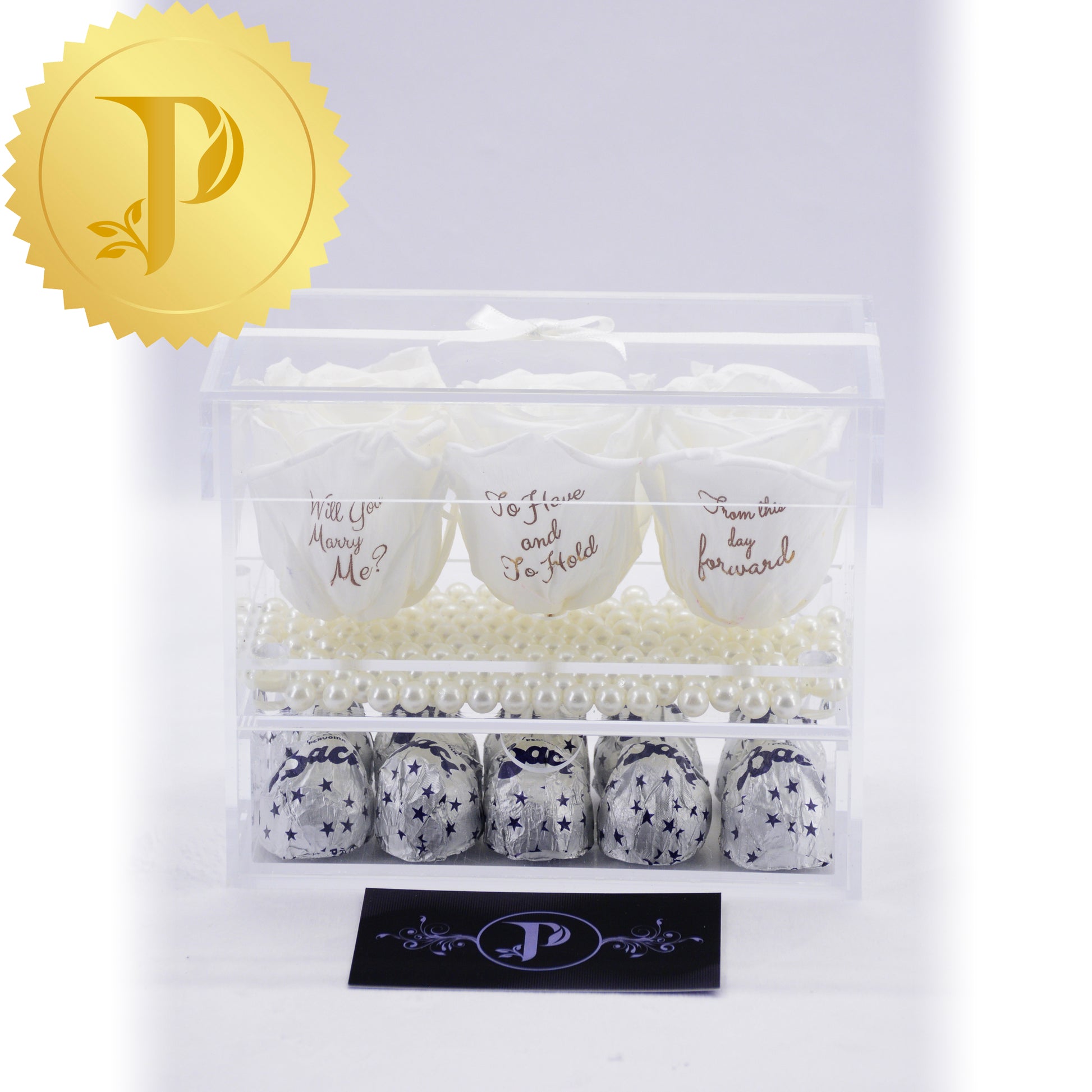 This rose trio in acrylic with white roses are complemented by a layer of faux white pearls and a drawer filled with Baci chocolates. We also have a ring holder which can be added to the bottom drawer.