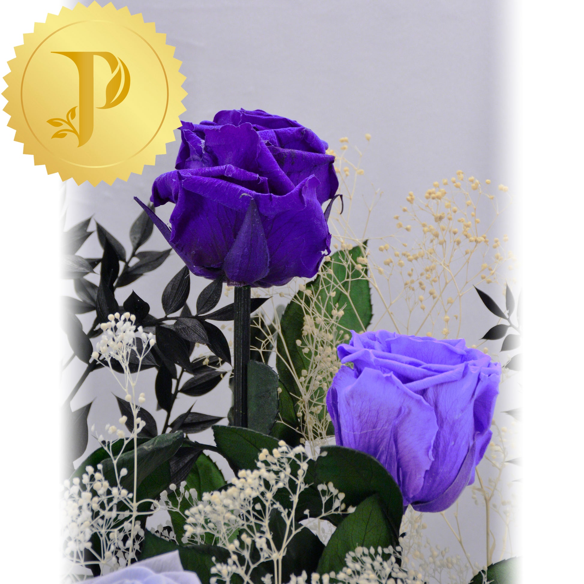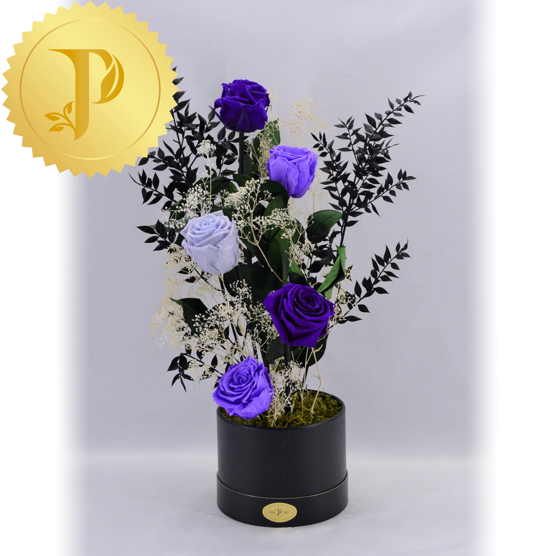 An artistic grouping of five luxurious, purple-coloured roses accented with selected preserved filler. The arrangement is placed in a small round black box, adorned with preserved moss to give a more realistic effect.