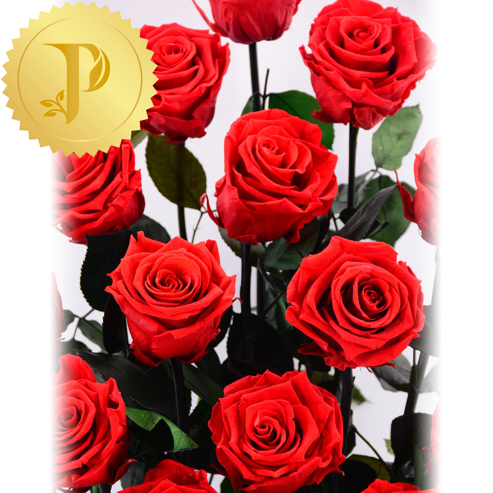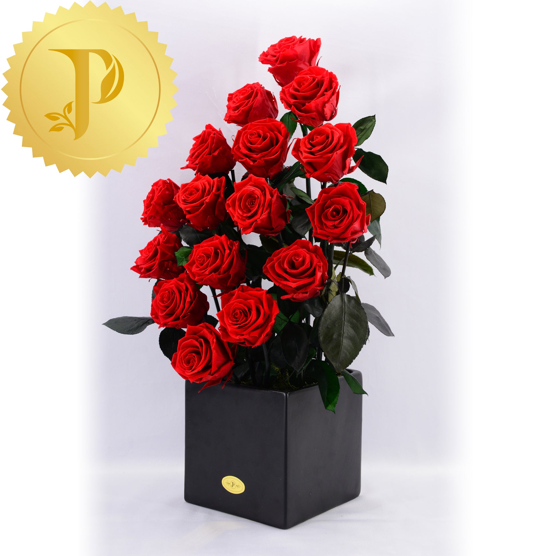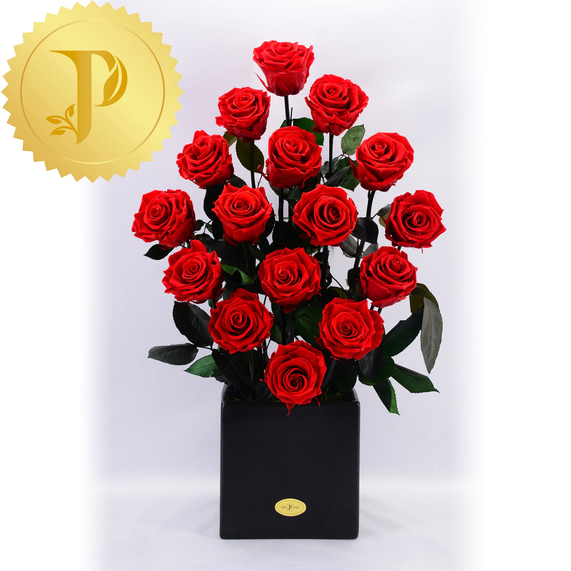 Sixteen red roses are positioned to give you a geometric diamond shape. This stylish arrangement is placed in a small six-inch square black ceramic vase, adorned with preserved moss to give a more natural effect.