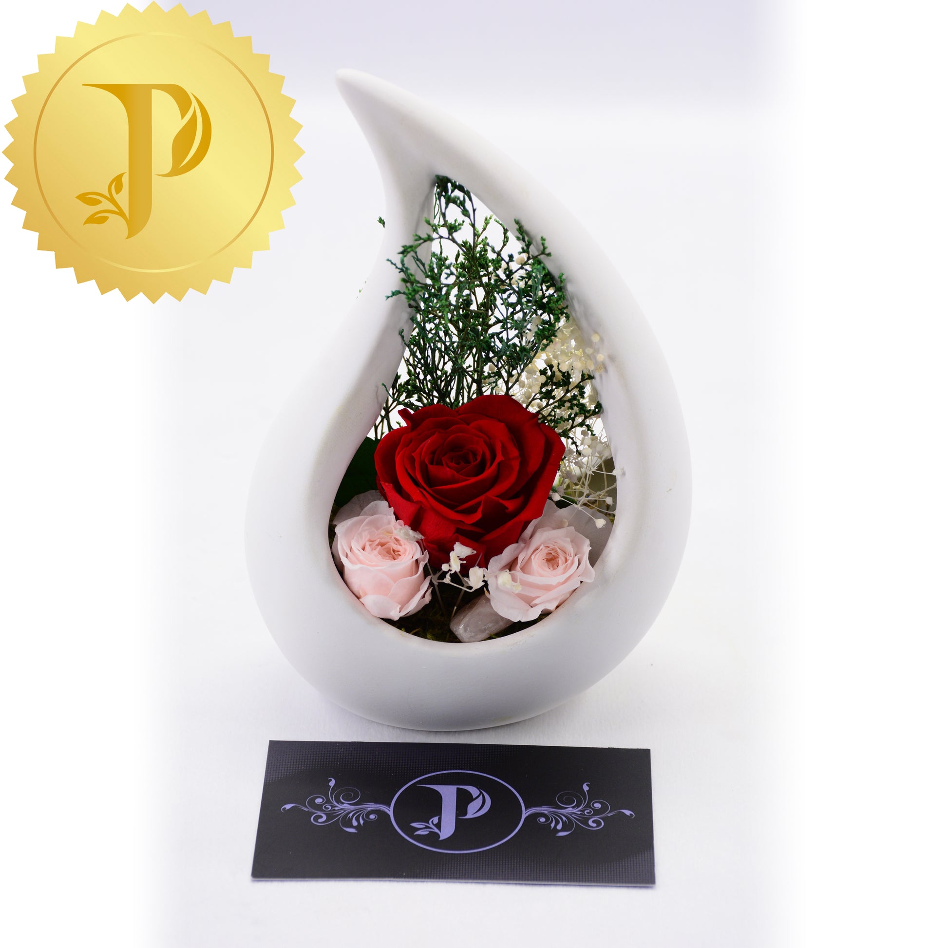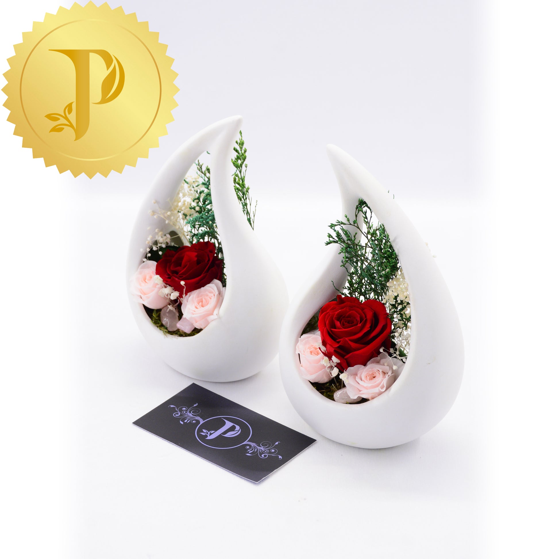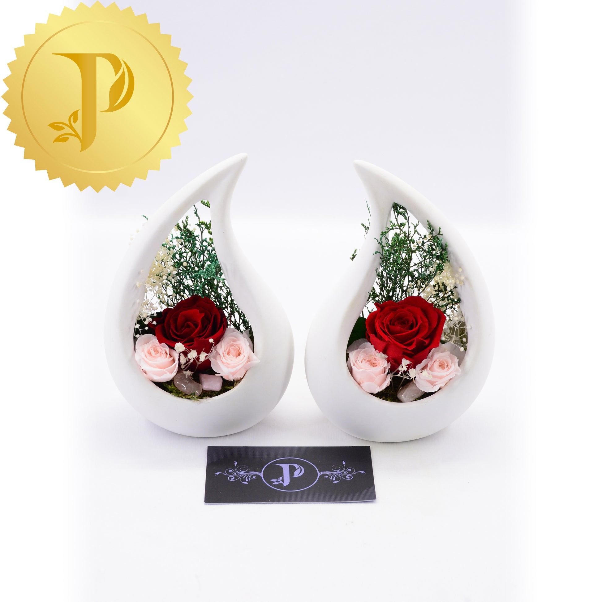 The ceramic raindrops stand approximately six inches high and are 4” in width, making it easy to fit into small spaces, either side by side or separately. Each contains a small rose with two miniature roses on the side highlighted with pink gypsophila, limonium, and a rose quartz crystal.
