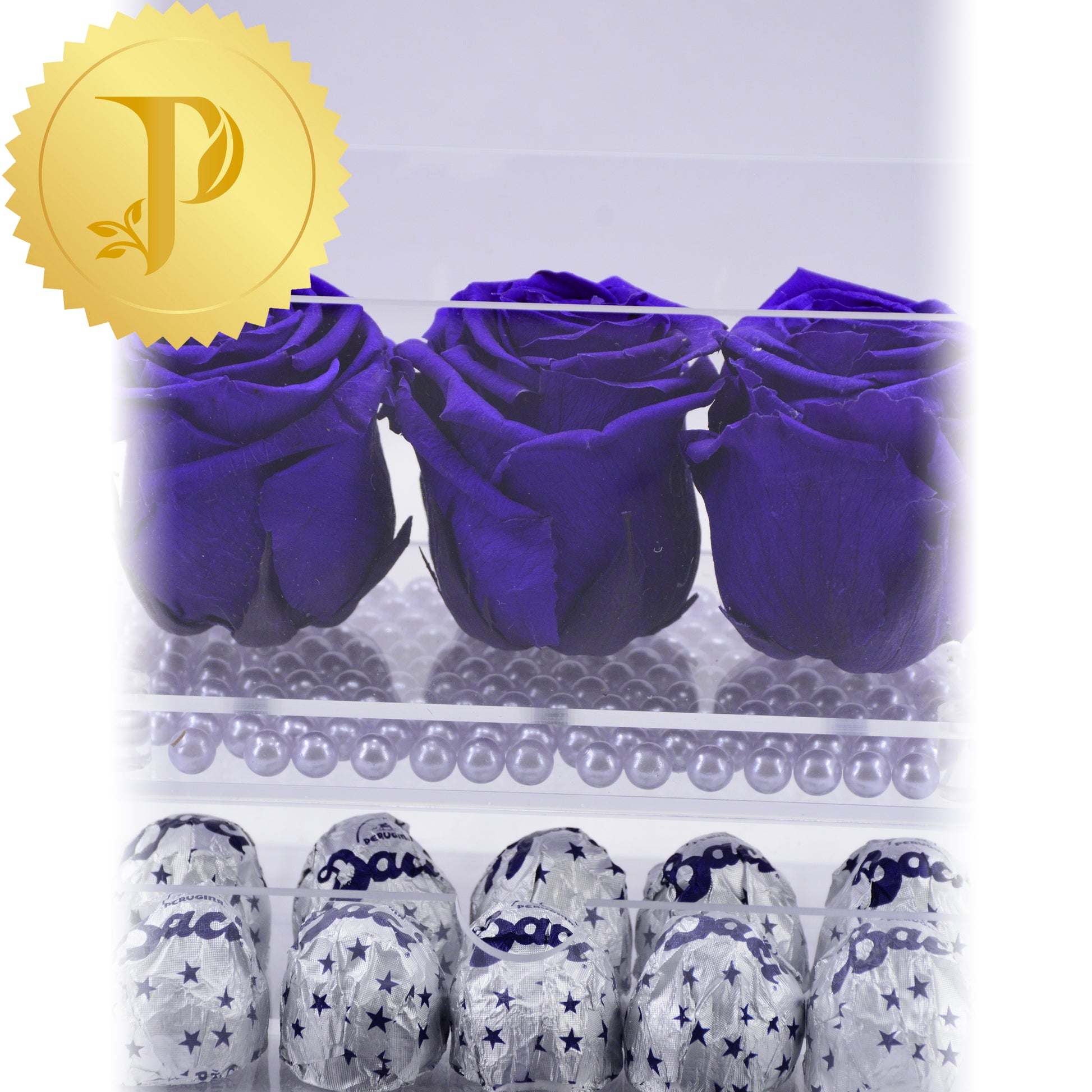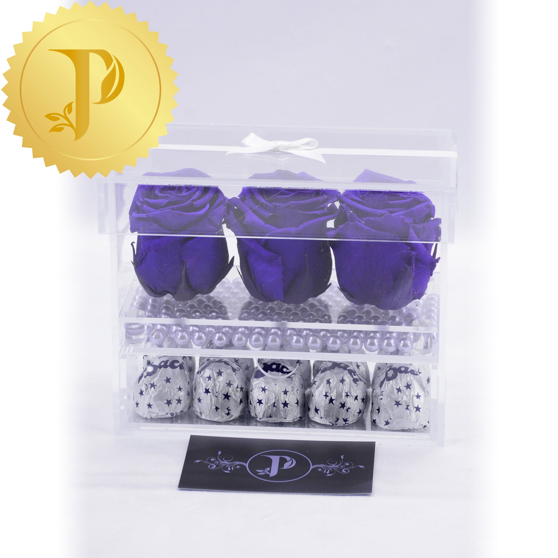 Our rose trio in acrylic with royal purple roses are complemented by a layer of faux lavender pearls and a drawer filled with Baci chocolates.