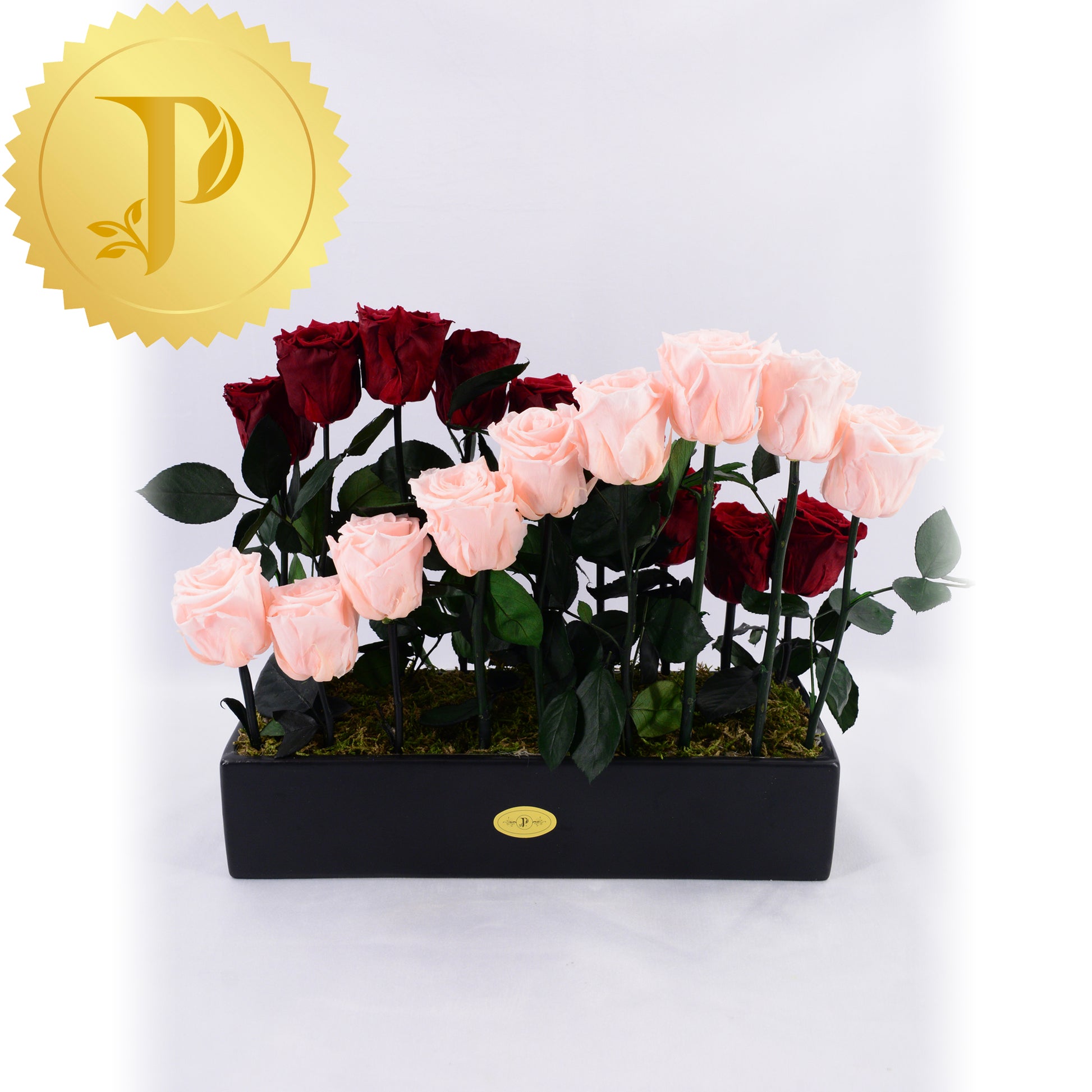 This stylish design is placed in a black rectangular ceramic vase, adorned with preserved moss to give a more natural effect.
