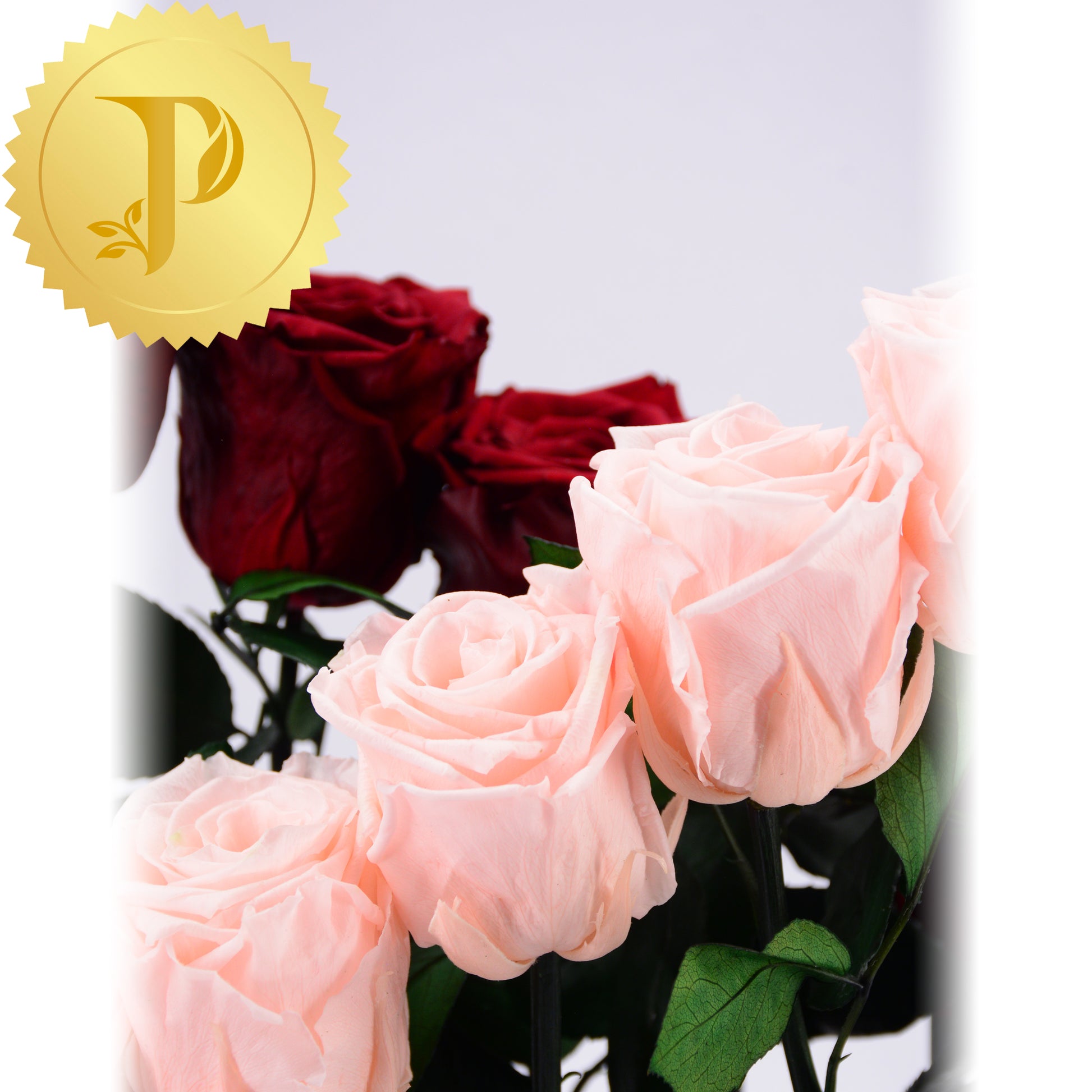Enjoy the sense of ebb and flow with this eighteen-rose arrangement. Nine roses of each colour, burgundy and pink, are positioned to form two opposing waves, bringing a sense of motion and calm. Achieve a new look by reversing the vase and highlighting the other colour.