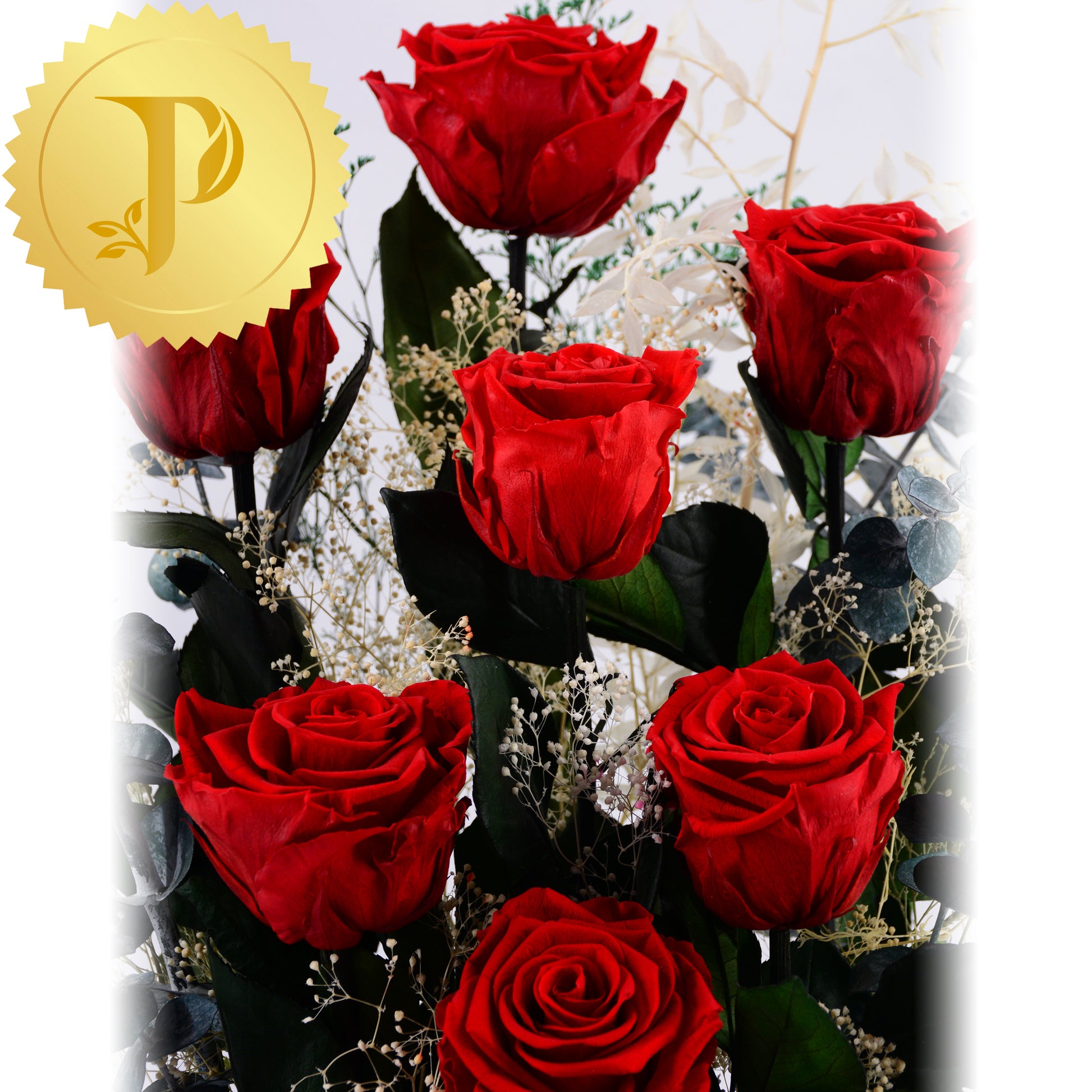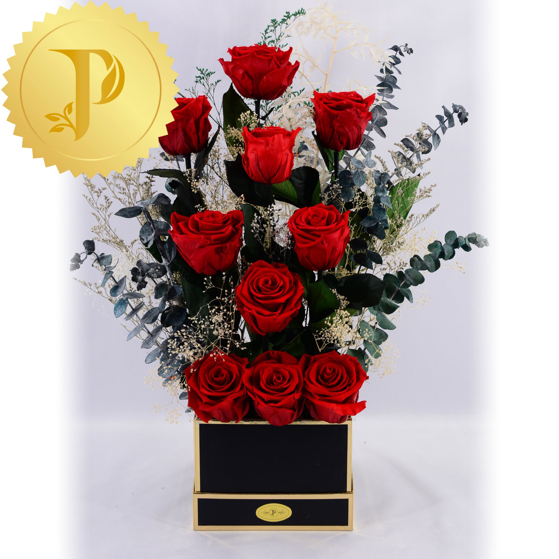 A lovely arrangement of ten ruby red roses elegantly designed and placed in a square black gold trimmed box, with a variety of selected filler to enhance its’ beauty. An expressive tribute for a special occasion.