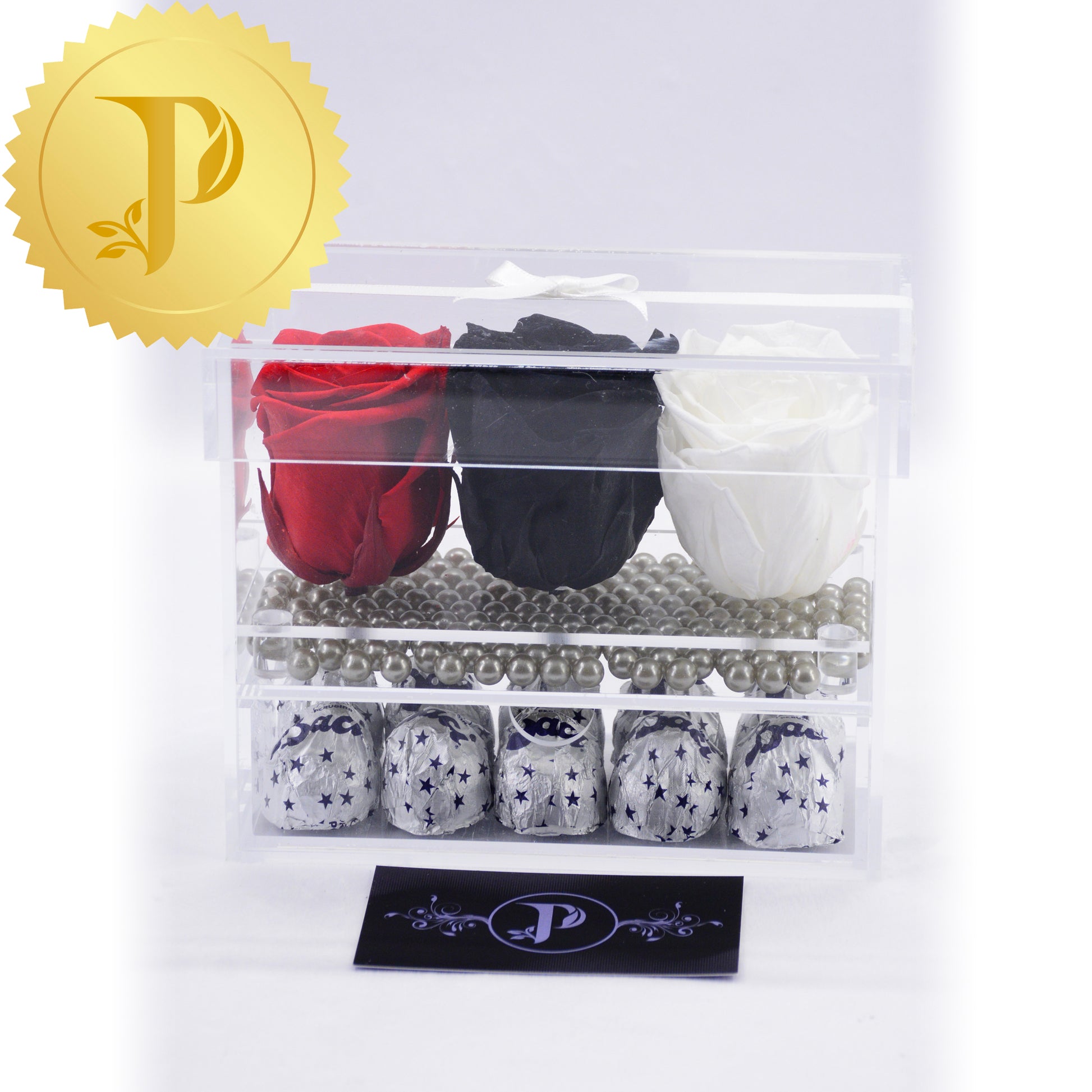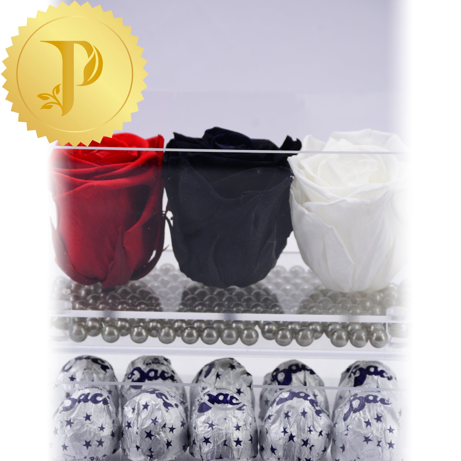 All arrangements come with a layer of either matching faux pearls, natural stones (lapis lazuli), crystals (clear and rose quartz) or crushed glass (gold coloured). Faux stems are either green, gold or silver coloured. The drawers are filled with either Ferrero Rocher or Baci chocolates. Acrylic boxes will be highlighted with a white ribbon.