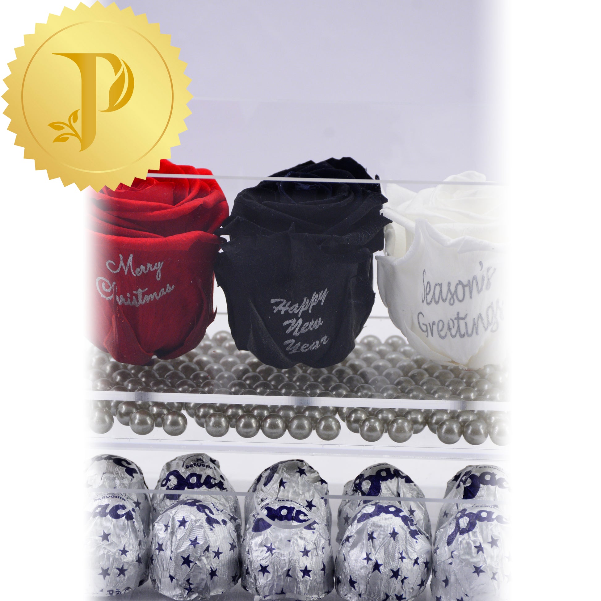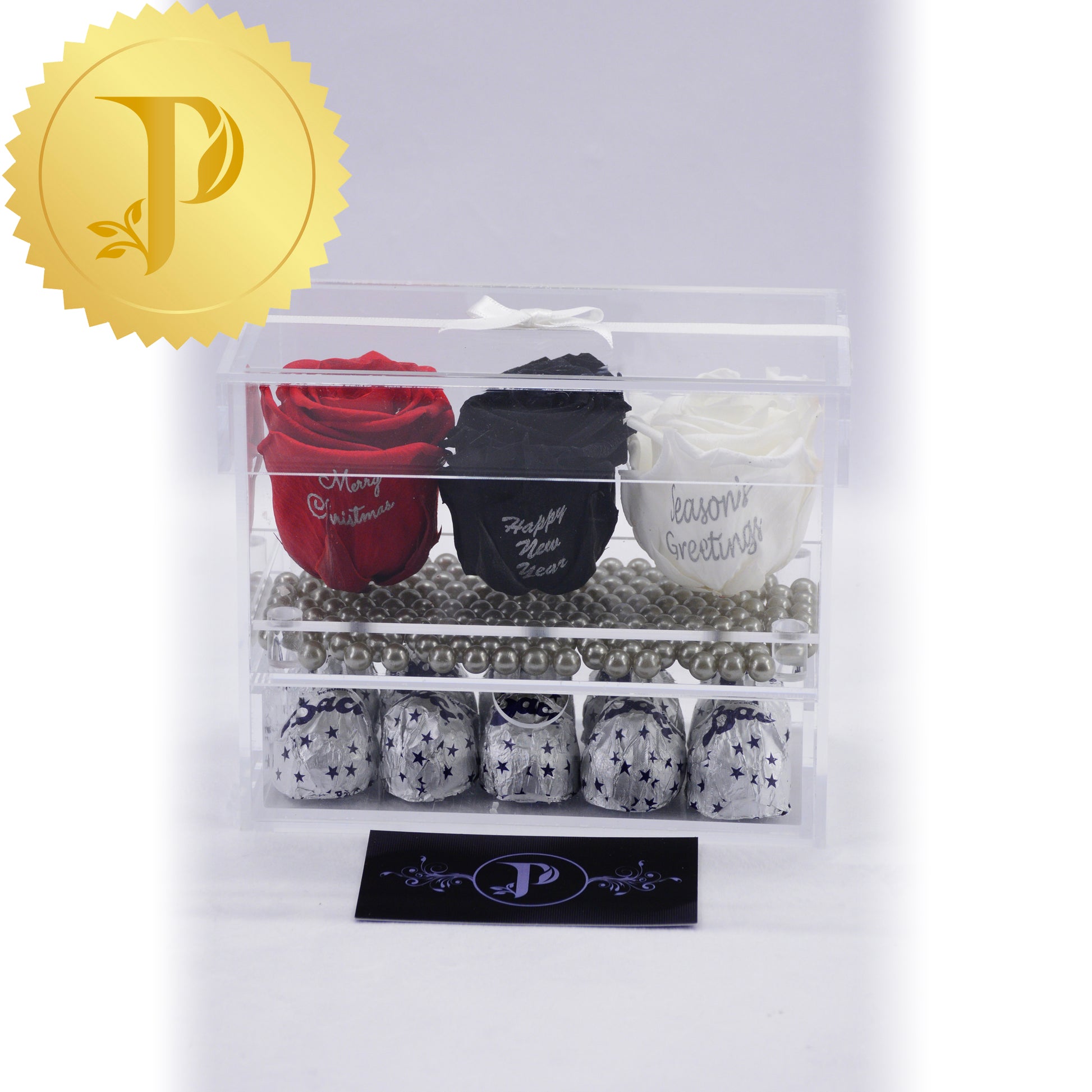 Our trio of holiday messages is a great gift idea for anyone at holiday time. This rose trio in a clear acrylic with red, white and black roses are complemented by a layer of faux silver pearls and a drawer filled with Baci chocolates.