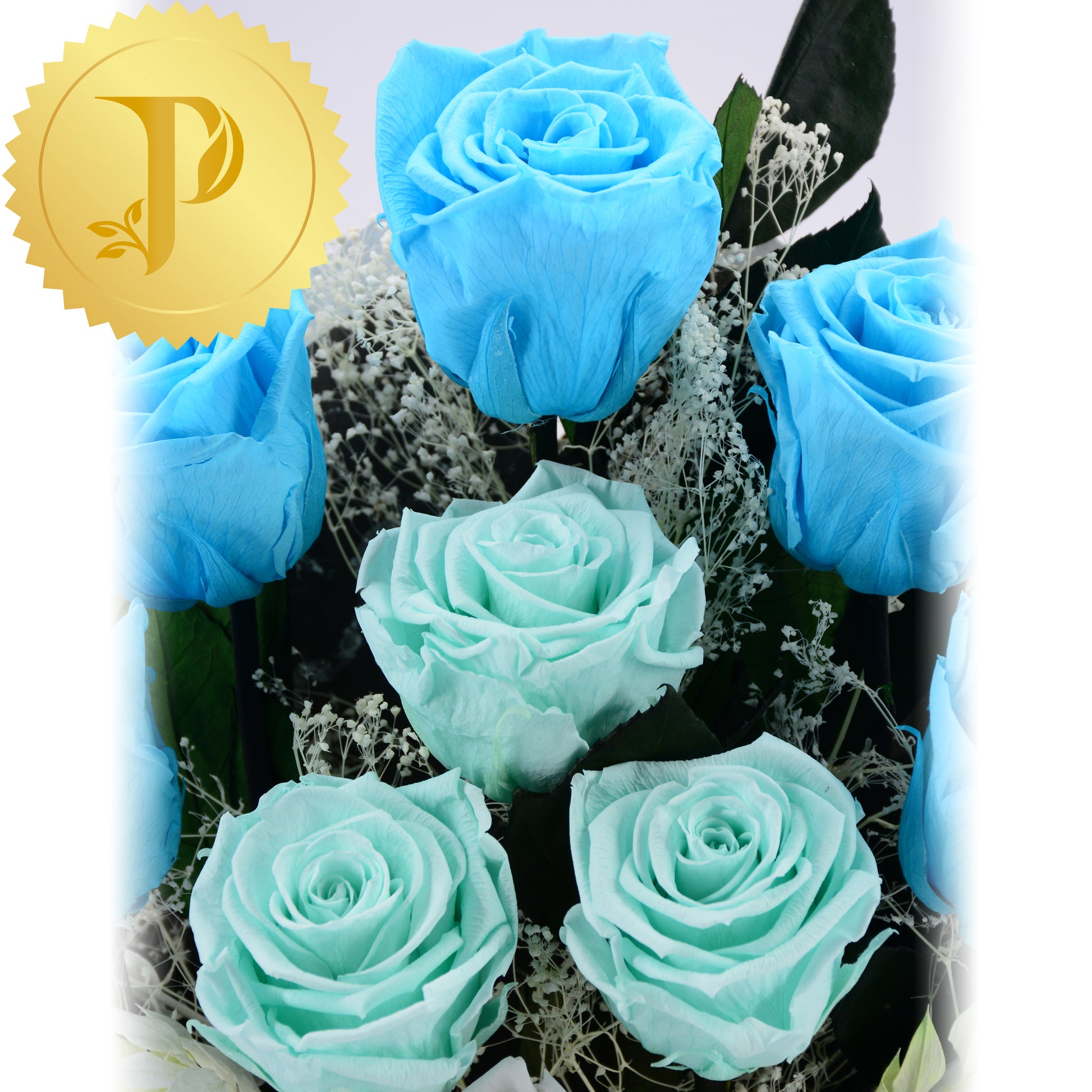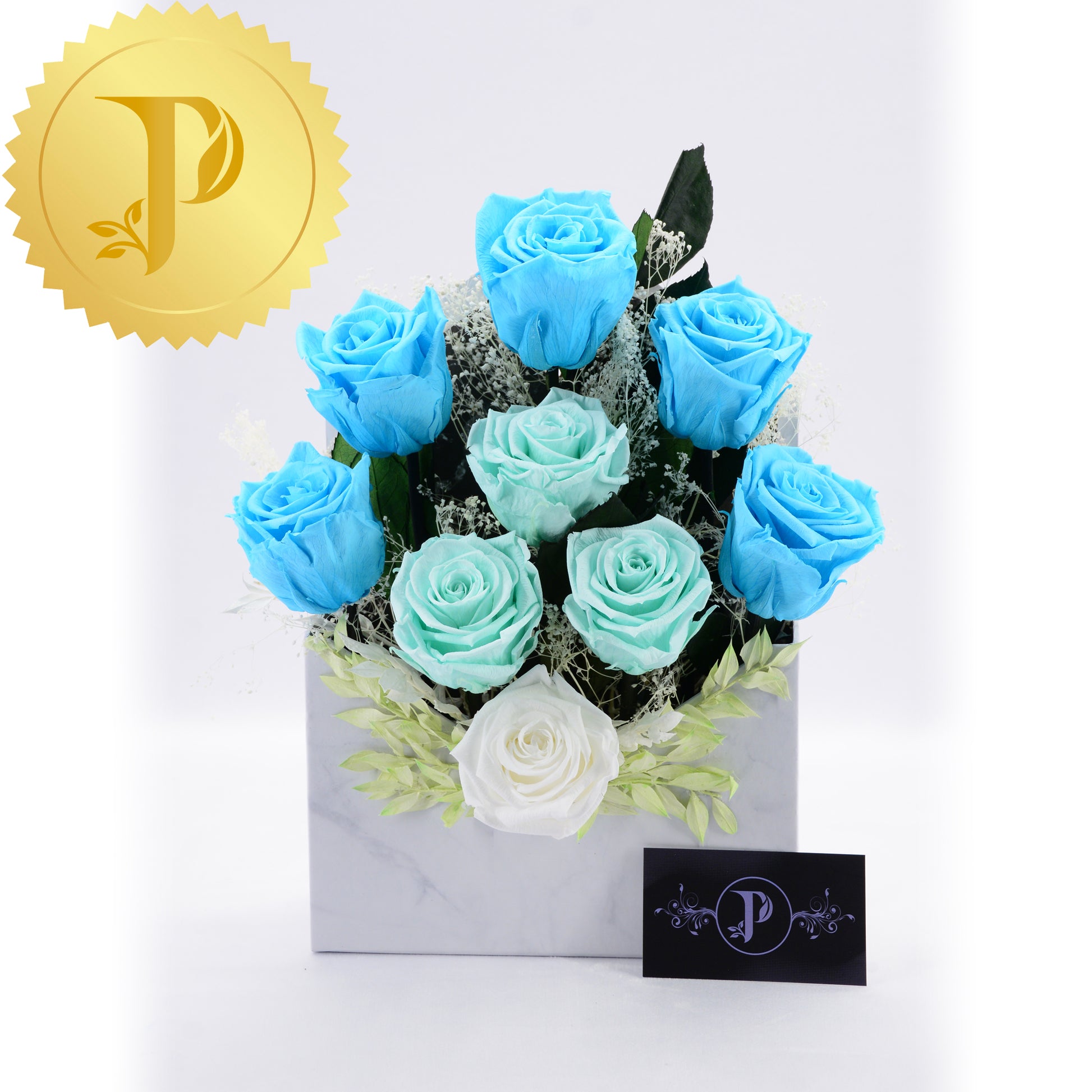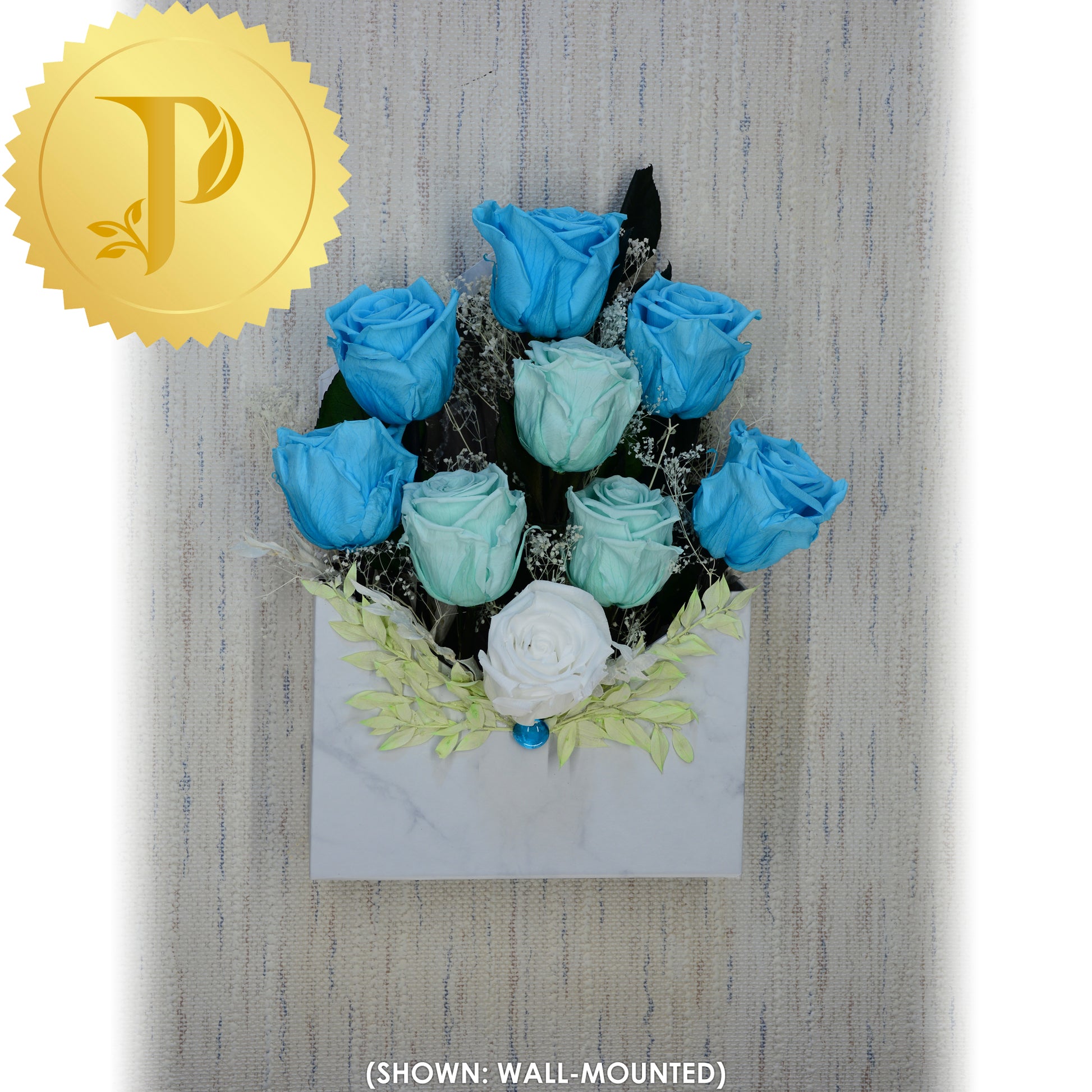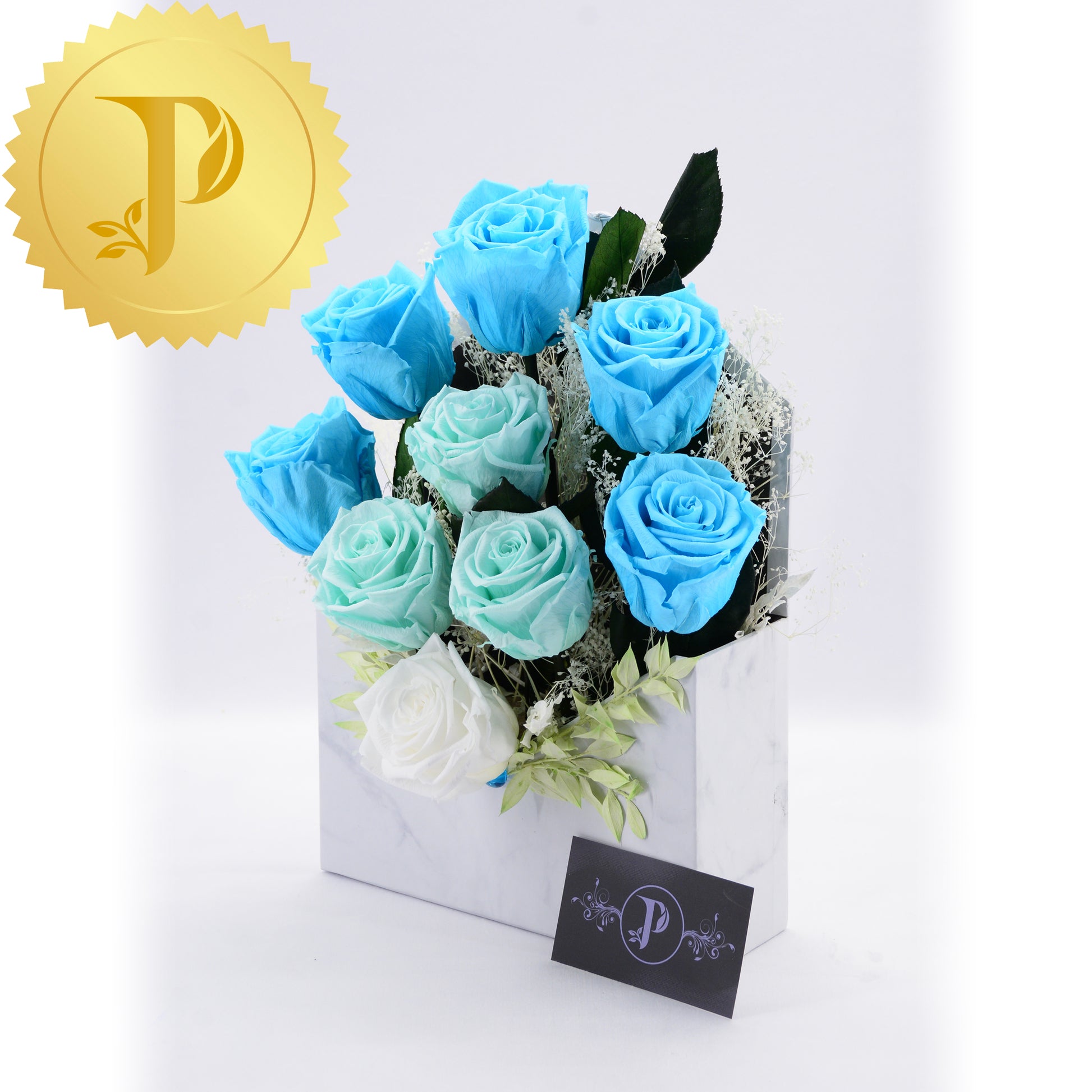 Convey a sweet message of love and friendship with this cute, white, marbleized envelope design. In this deluxe version, nine roses in refreshing turquoise, aqua and white will enhance any room. This delightful arrangement is also suitable for hanging (picture hanger included).