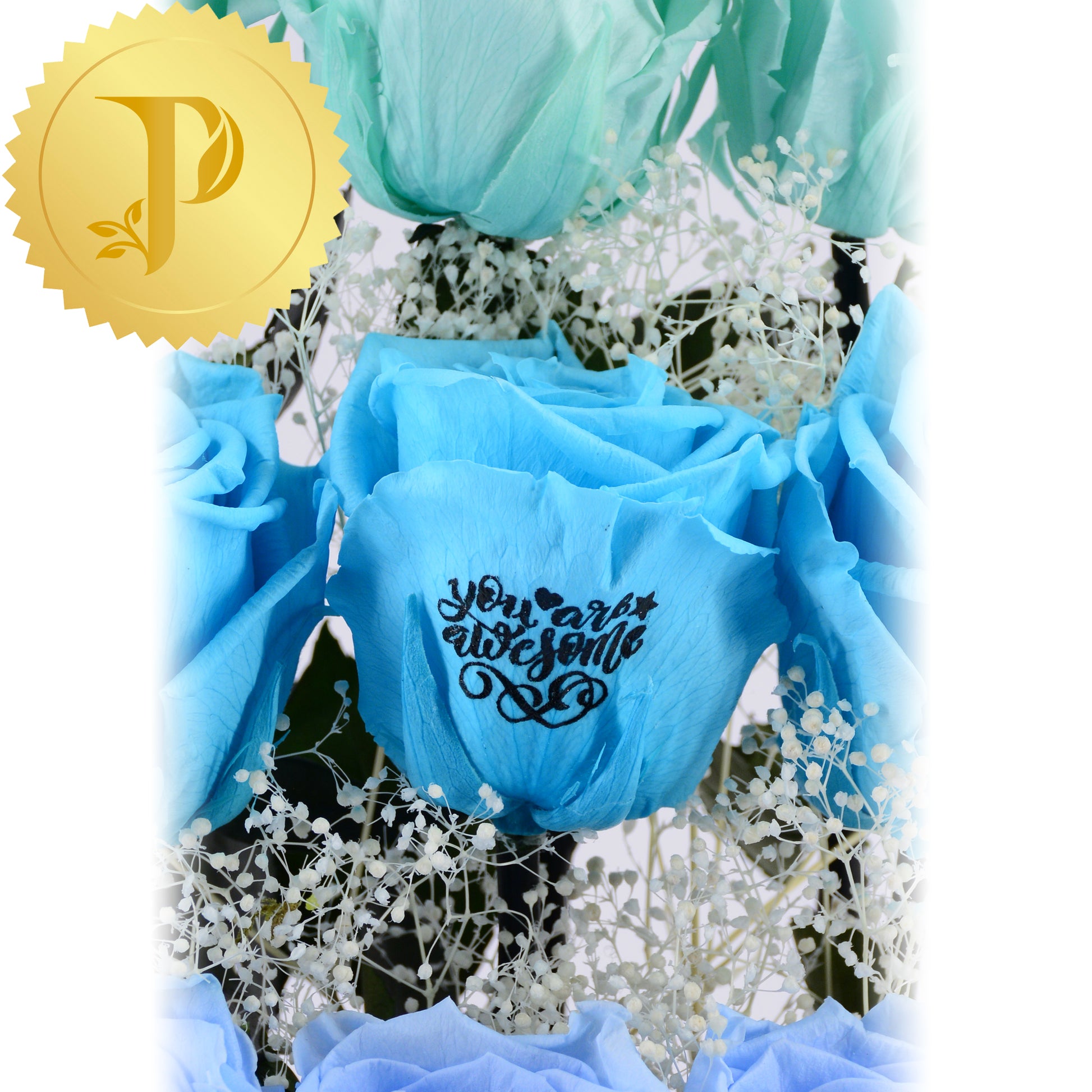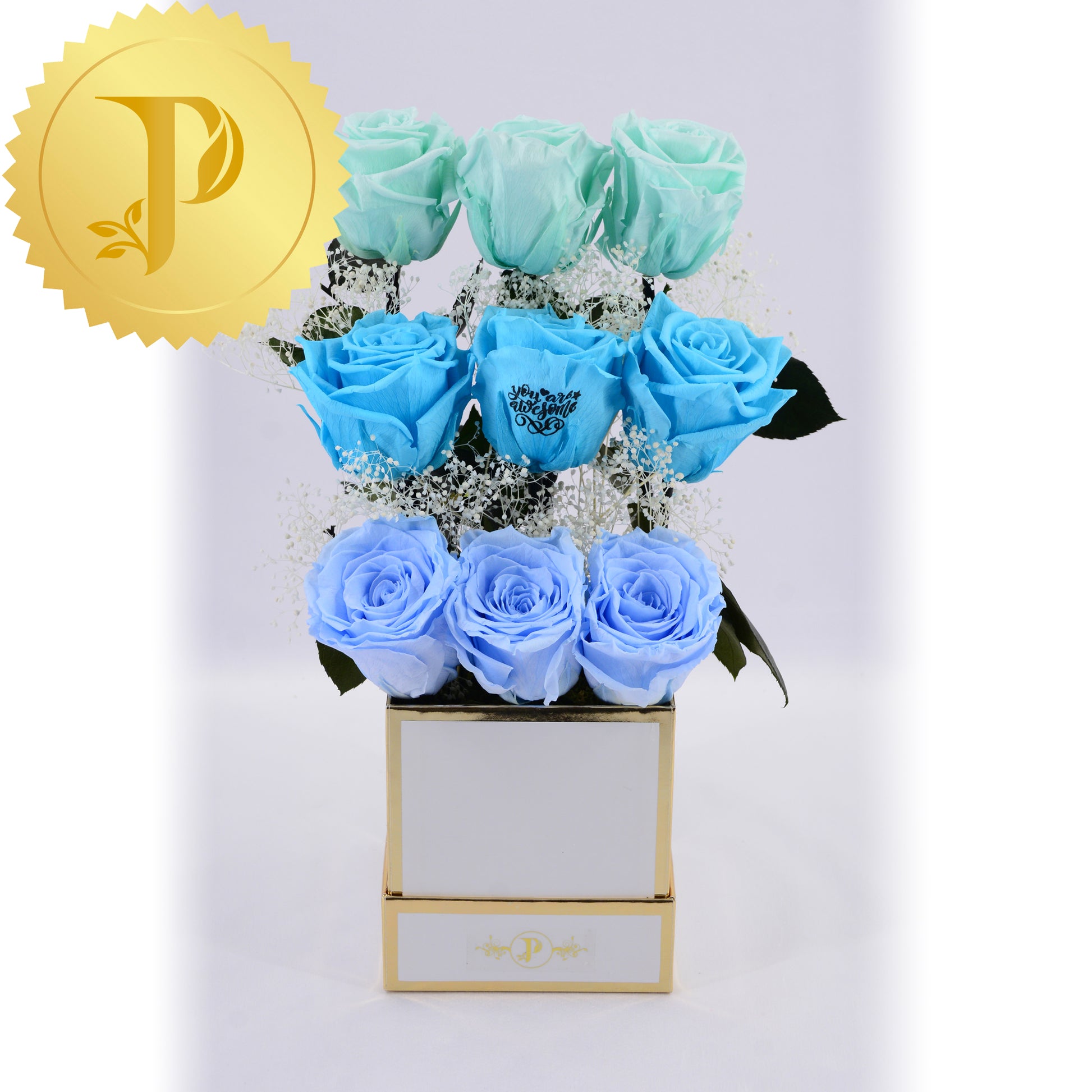 This combination of nine tiered beautiful blue roses, in a concert of colour, are reminiscent of a calming seaside. This delightful arrangement is placed in a square white gold trimmed box, adorned with preserved moss to give a more realistic effect.